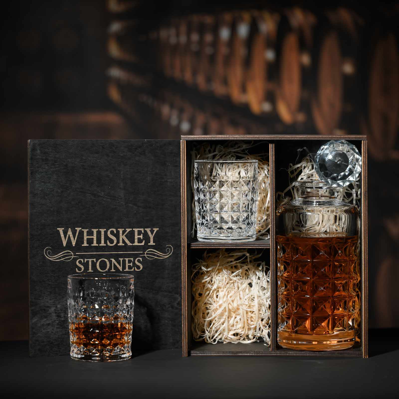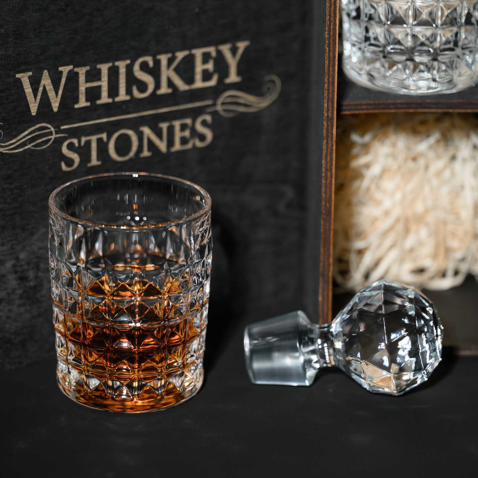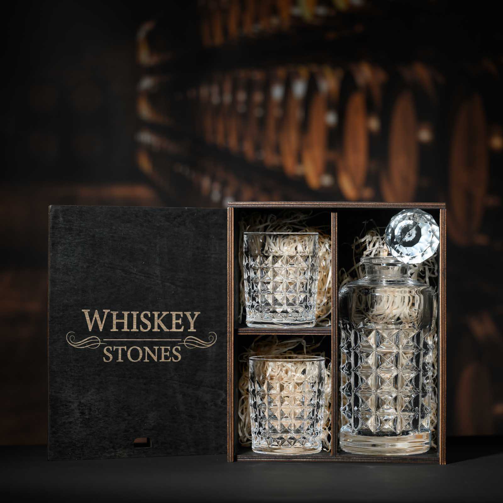 Bohemia Diamond — это не просто посуда, а продуманный ритуал. В наборе вы найдёте два тяжёлых стакана с насыщенным рельефом и элегантный декантер с плотной стеклянной пробкой. Всё это аккуратно уложено в презентабельный деревянный пенал с гравировкой "WHISKEY STONES", создавая ощущение подарка «с историей».