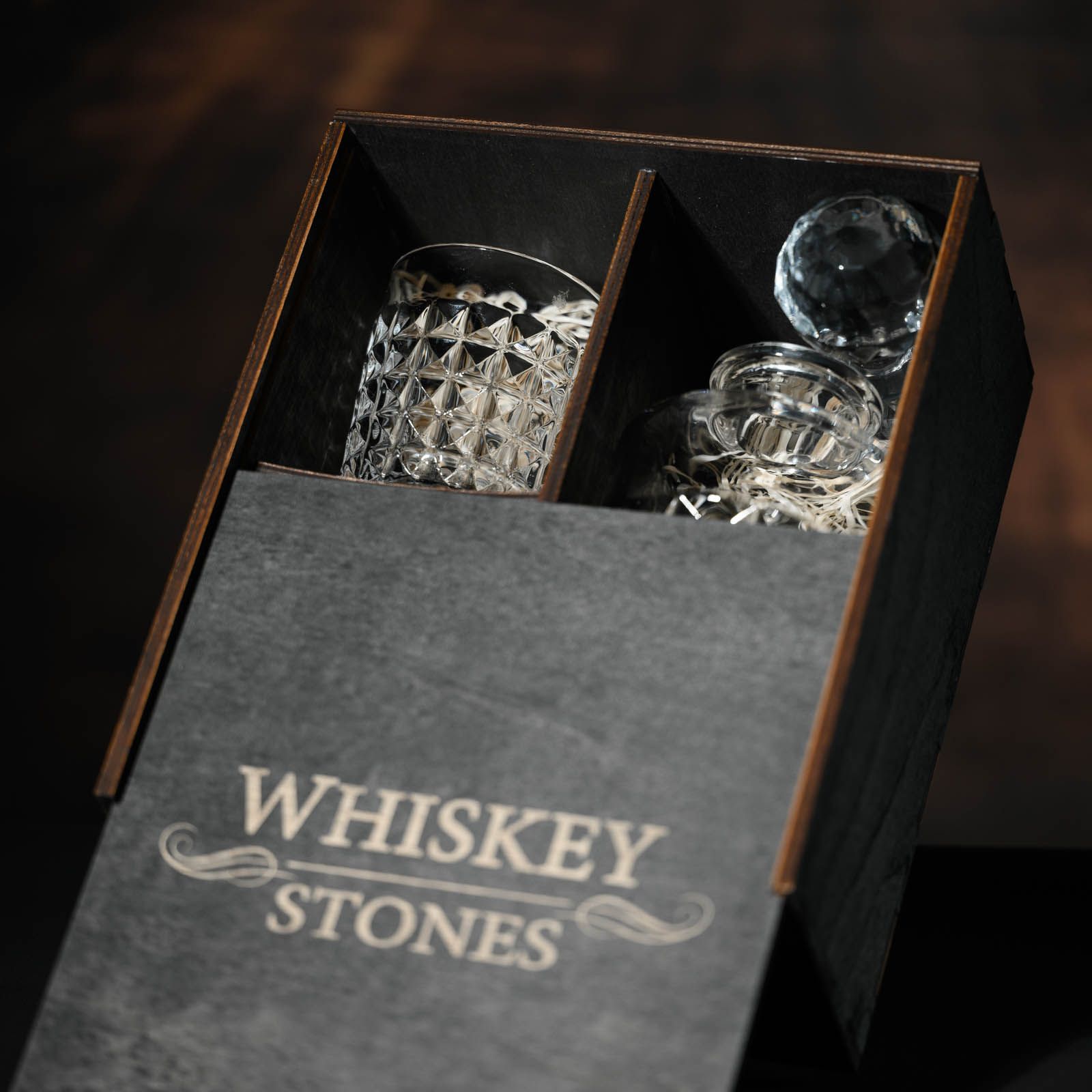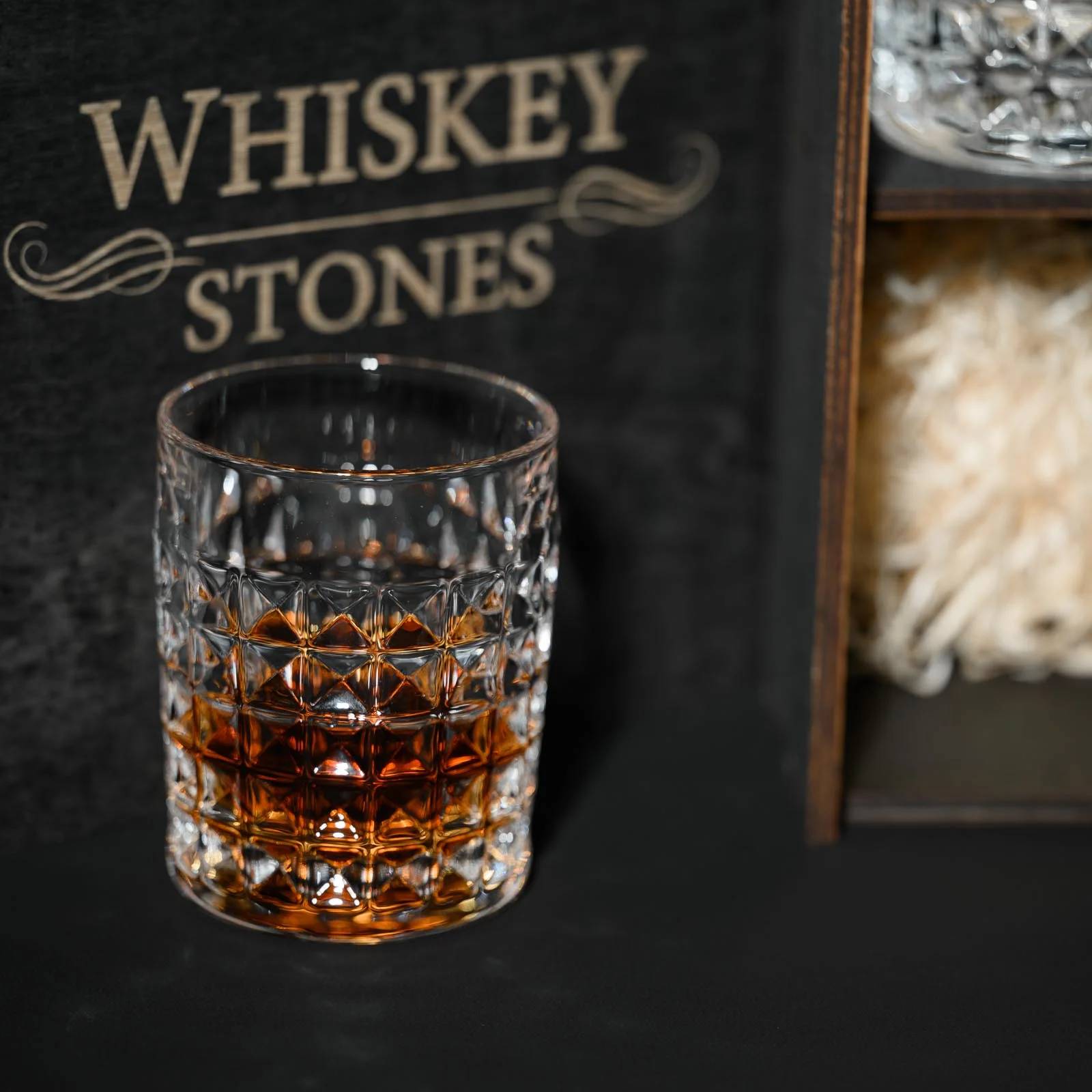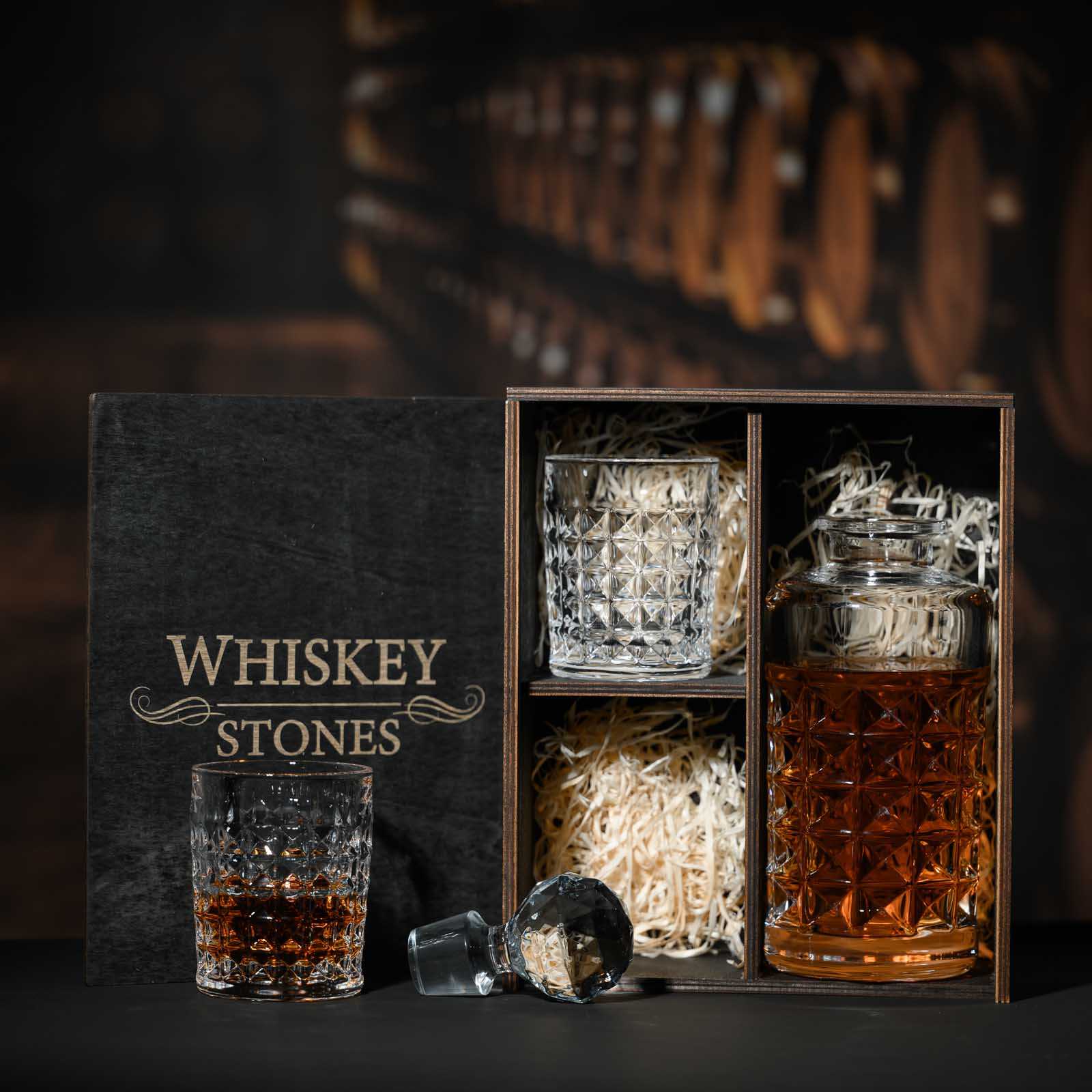 Bohemia Diamond — это не просто посуда, а продуманный ритуал. В наборе вы найдёте два тяжёлых стакана с насыщенным рельефом и элегантный декантер с плотной стеклянной пробкой. Всё это аккуратно уложено в презентабельный деревянный пенал с гравировкой "WHISKEY STONES", создавая ощущение подарка «с историей».