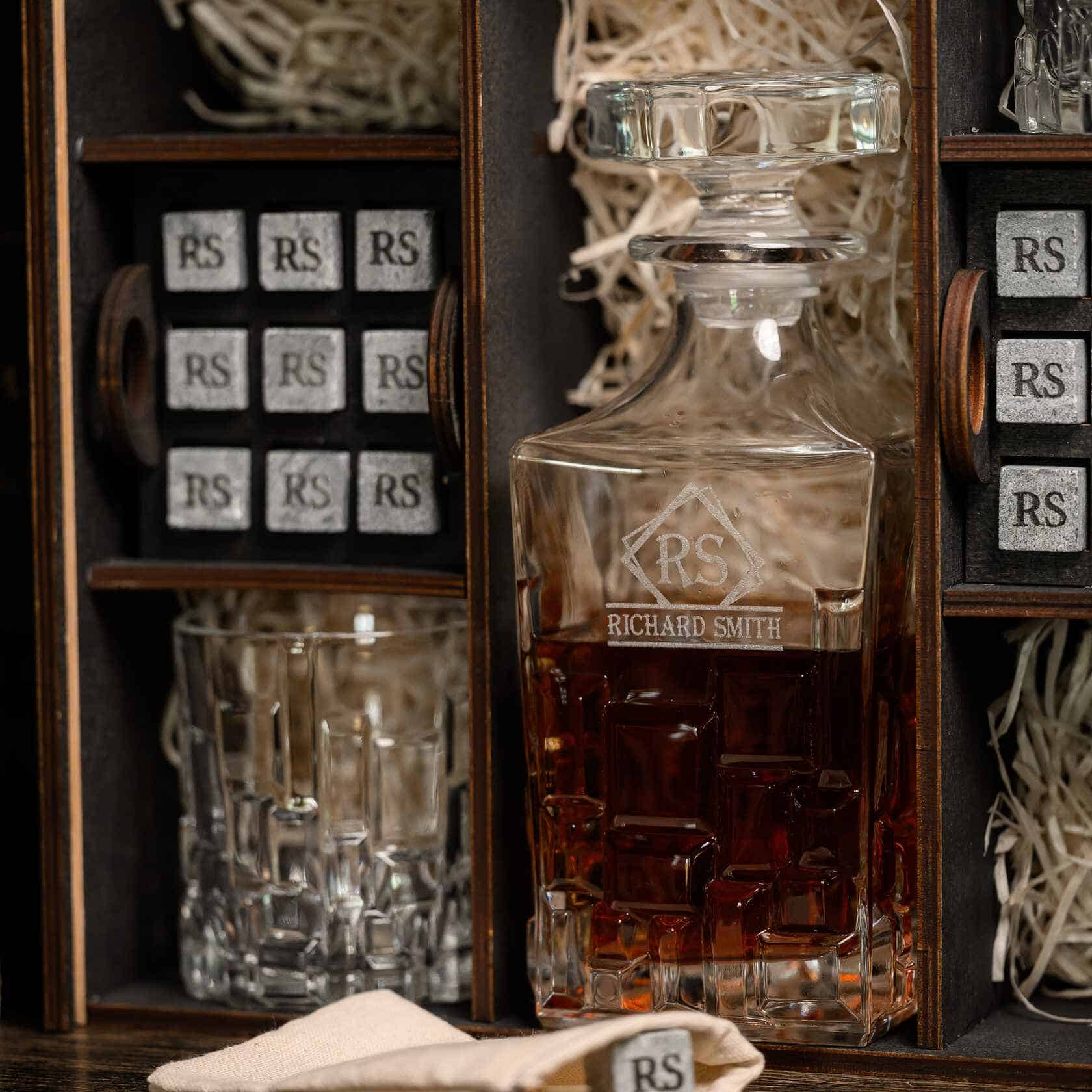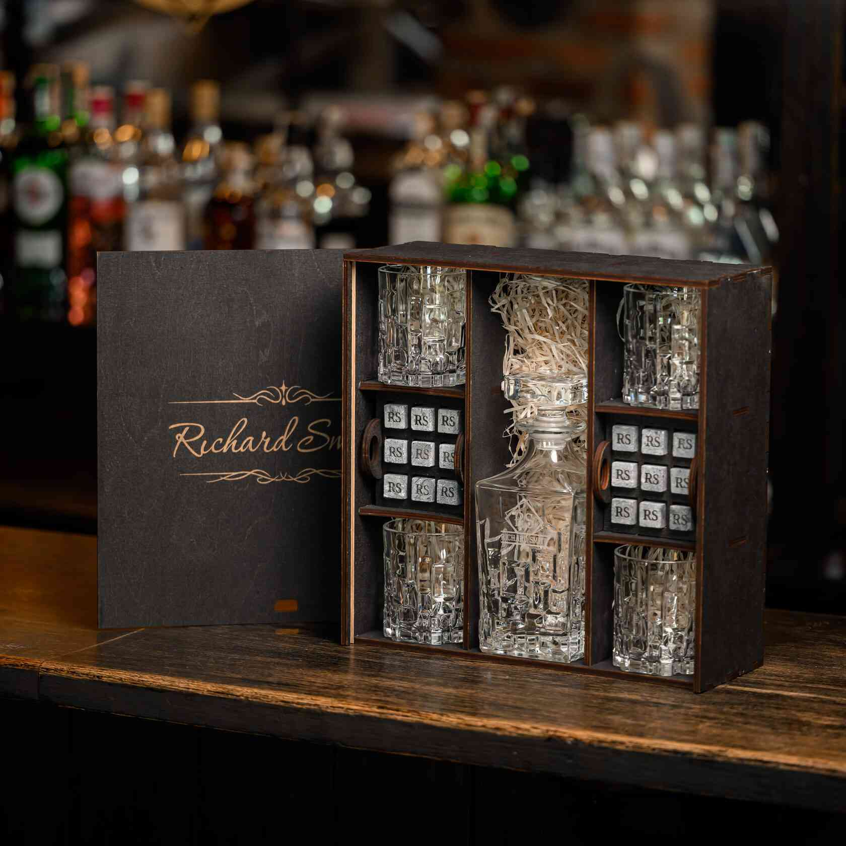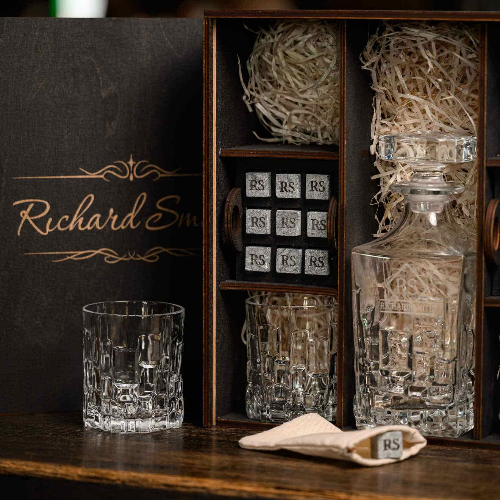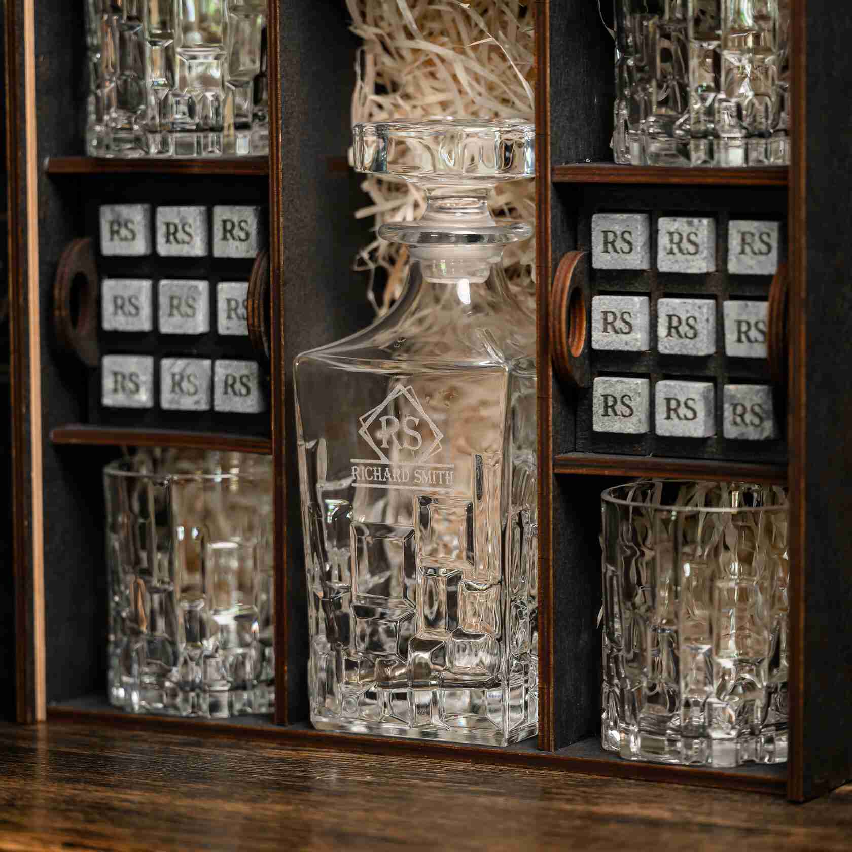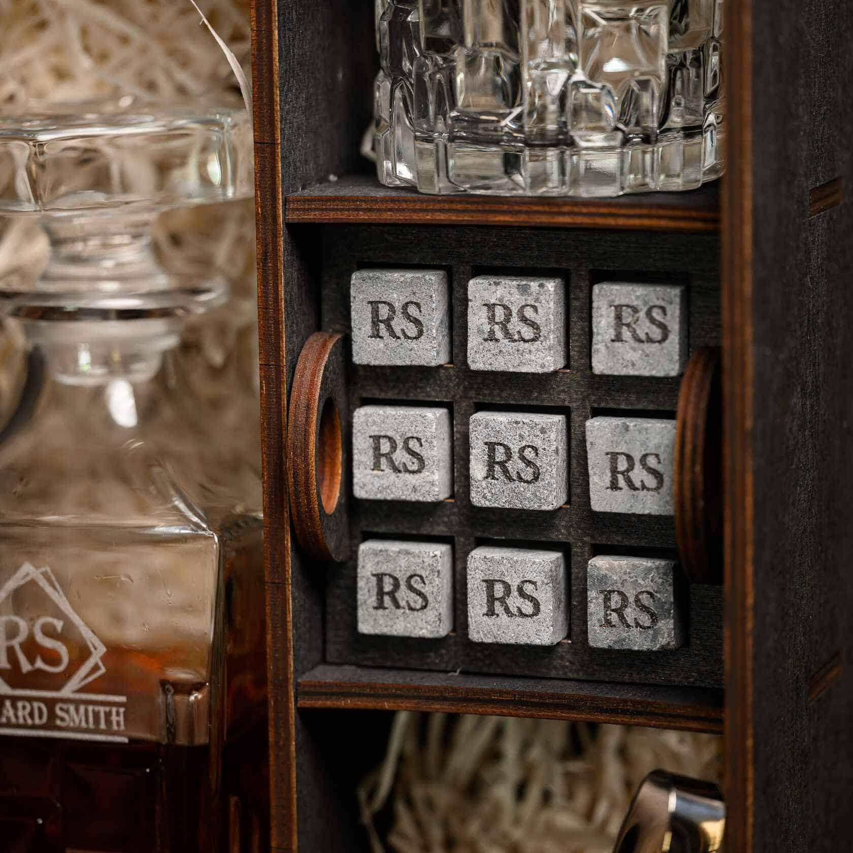 — Индивидуальная гравировка: без гравировки / на камнях / на крышке коробки / на камнях и крышке / на камнях, крышке и стаканах / на камнях, крышке, стаканах и декантере / на камнях, крышке, стаканах, декантере и подставка