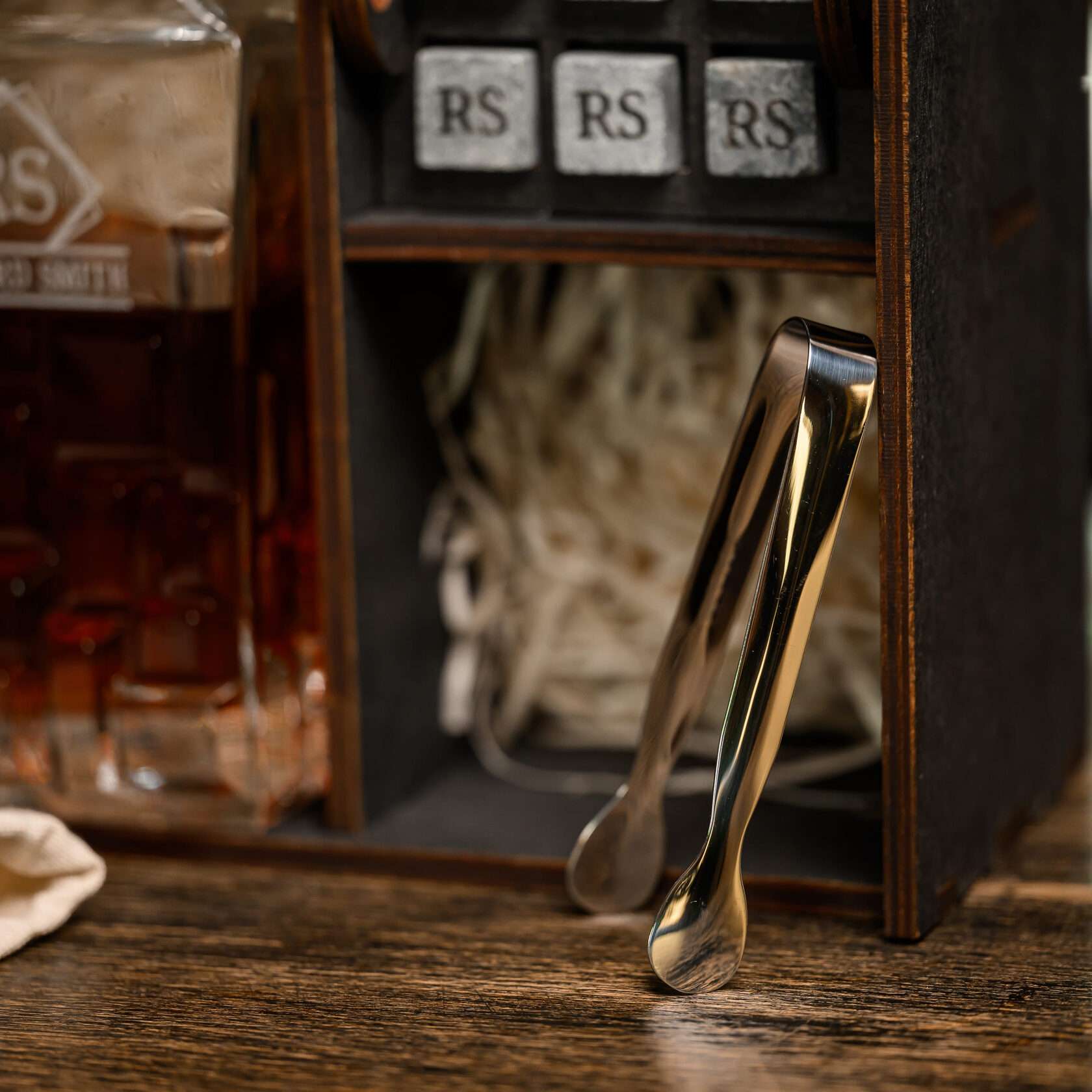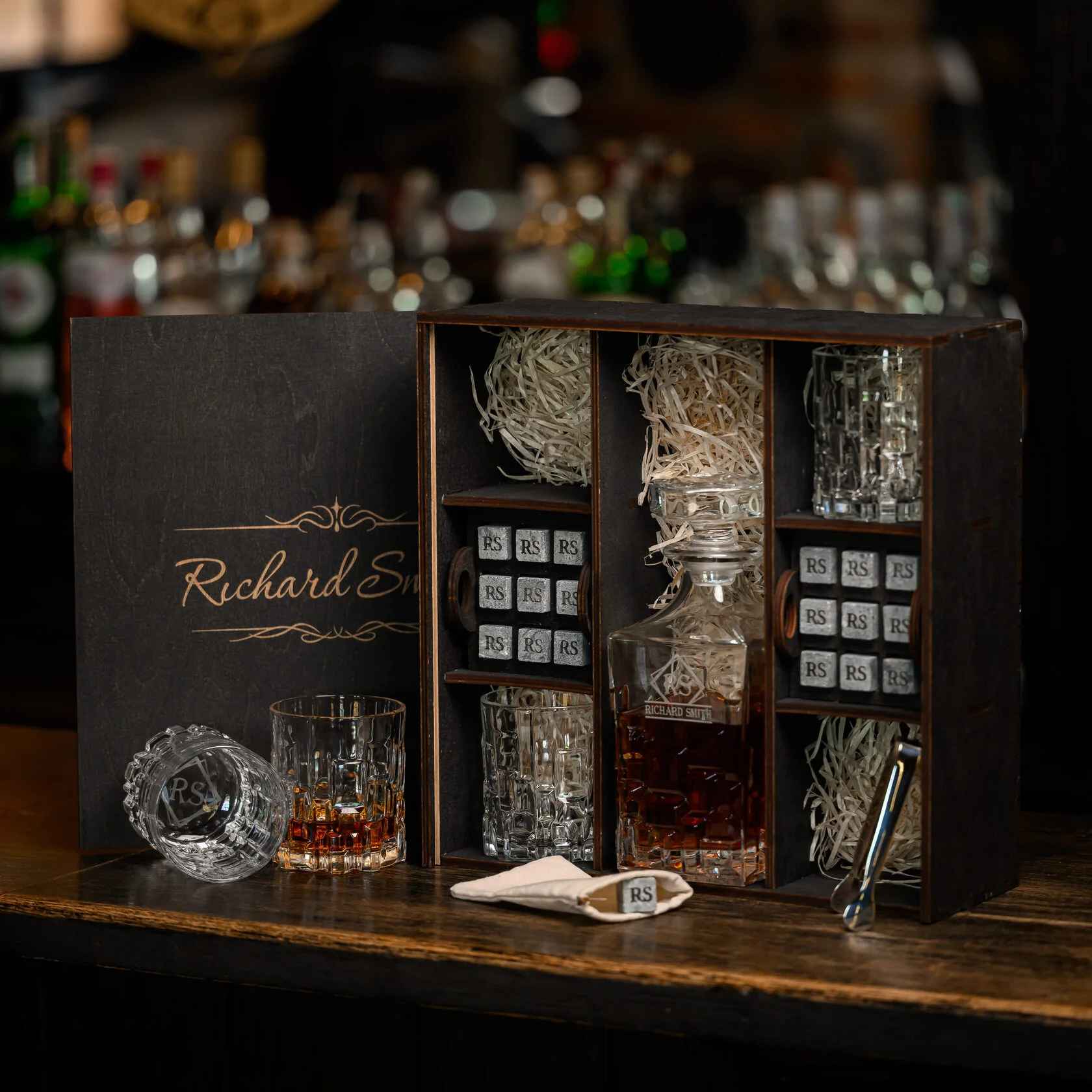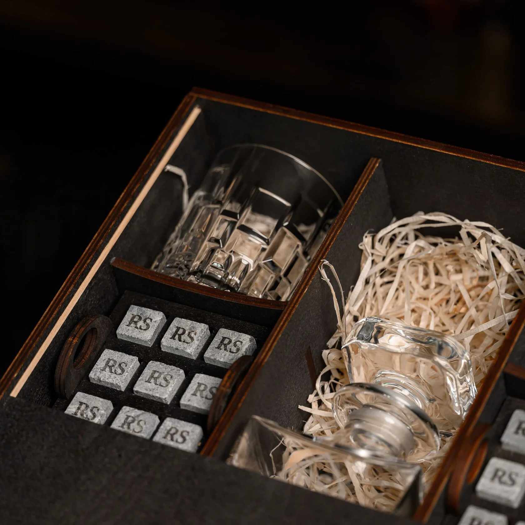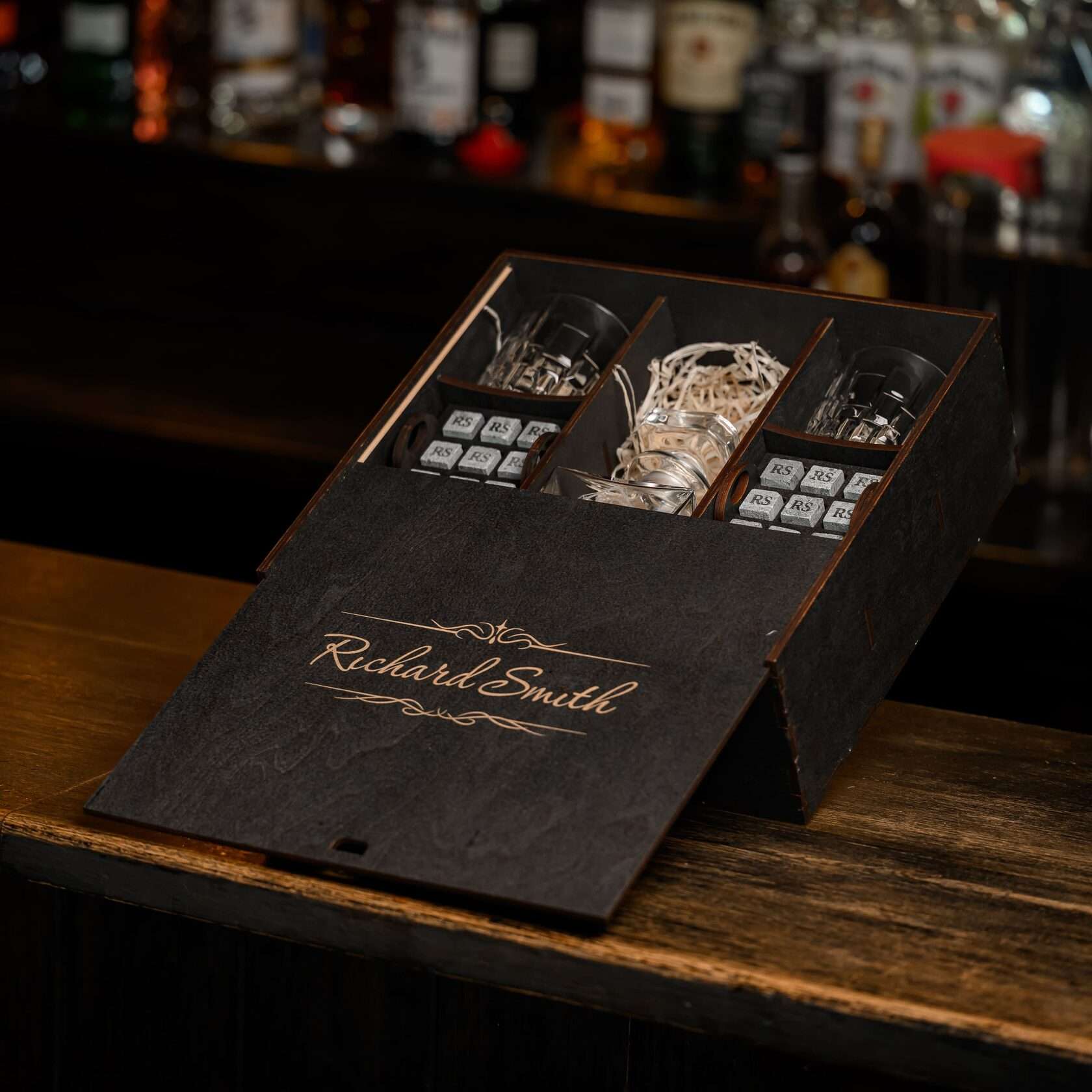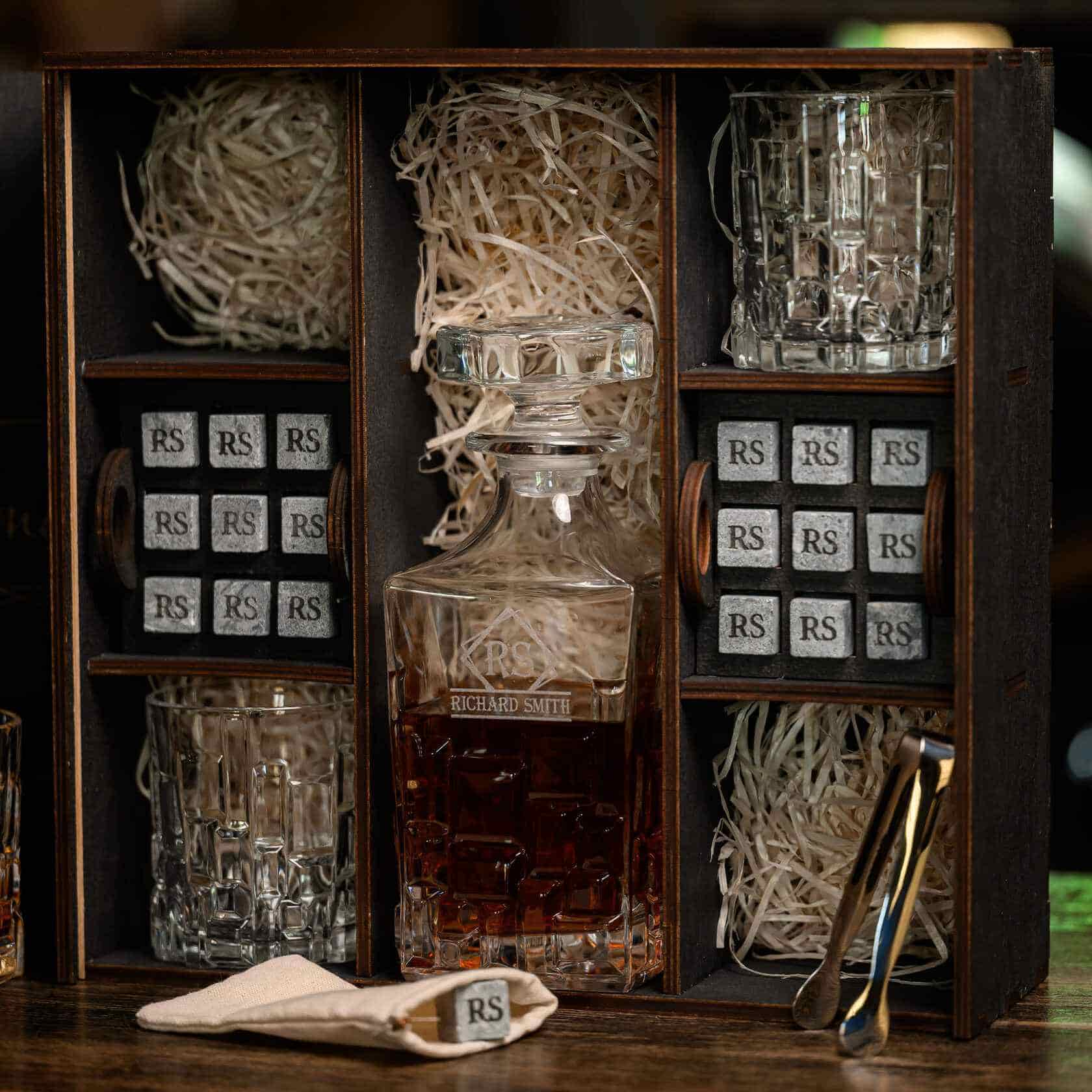 — Индивидуальная гравировка: без гравировки / на камнях / на крышке коробки / на камнях и крышке / на камнях, крышке и стаканах / на камнях, крышке, стаканах и декантере / на камнях, крышке, стаканах, декантере и подставка