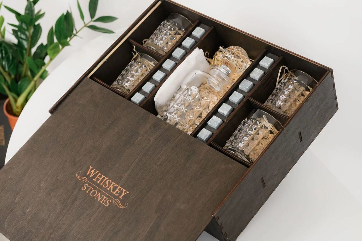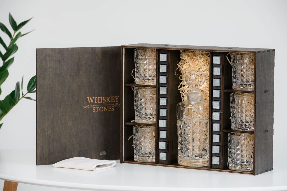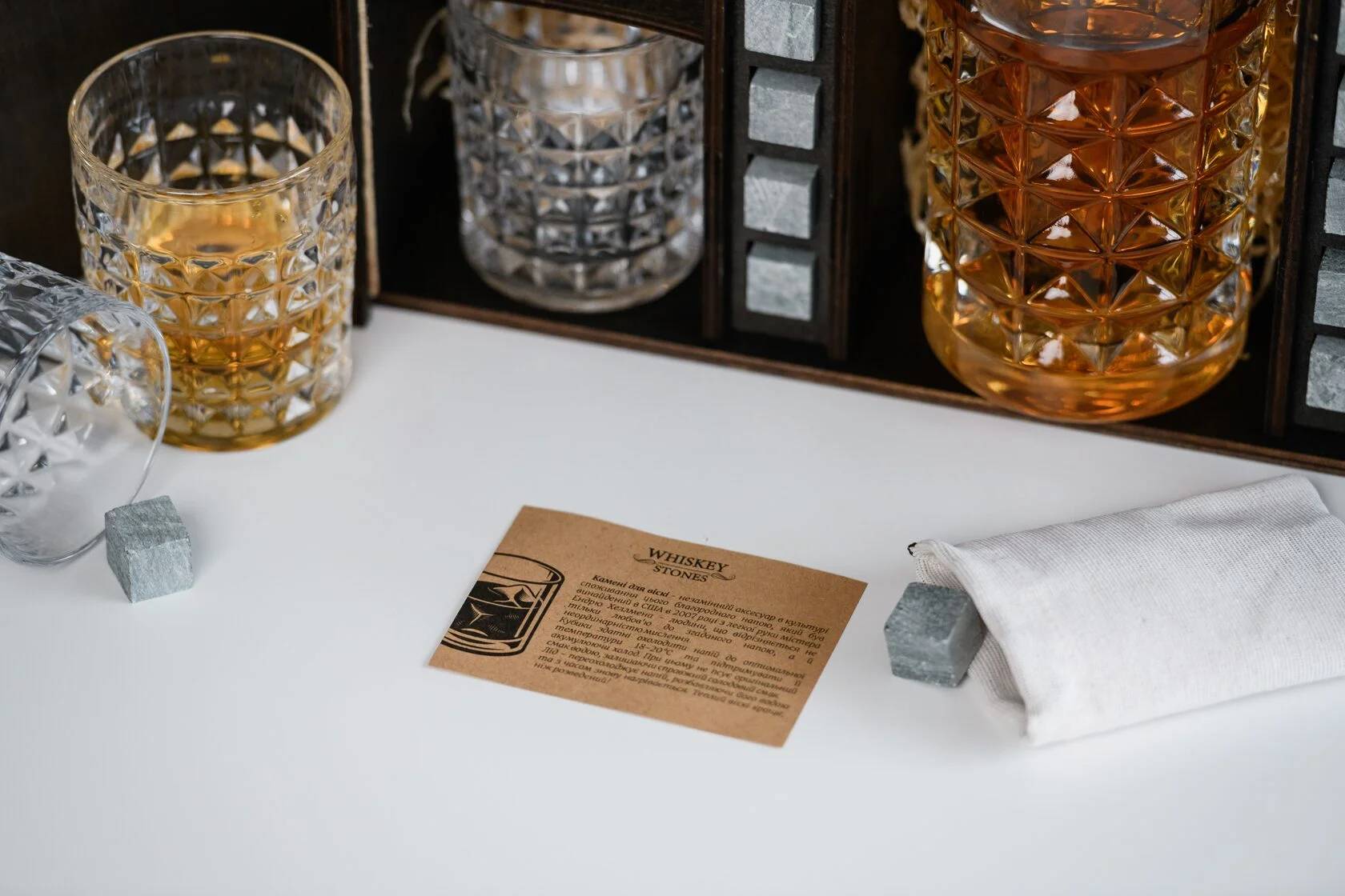 — Индивидуальная гравировка: без гравировки / на камнях / на крышке коробки / на камнях и крышке / на камнях, крышке и стаканах / на камнях, крышке, стаканах и декантере / на камнях, крышке, стаканах, декантере и подставках