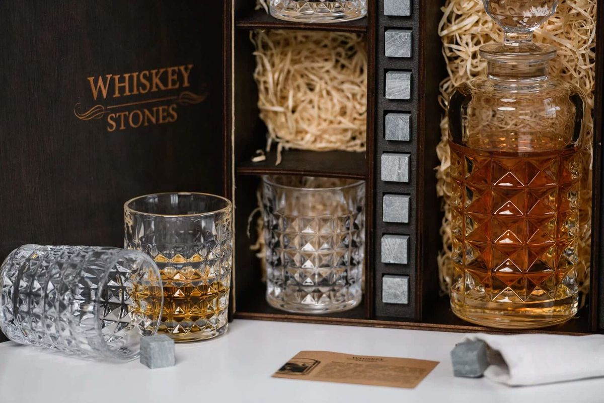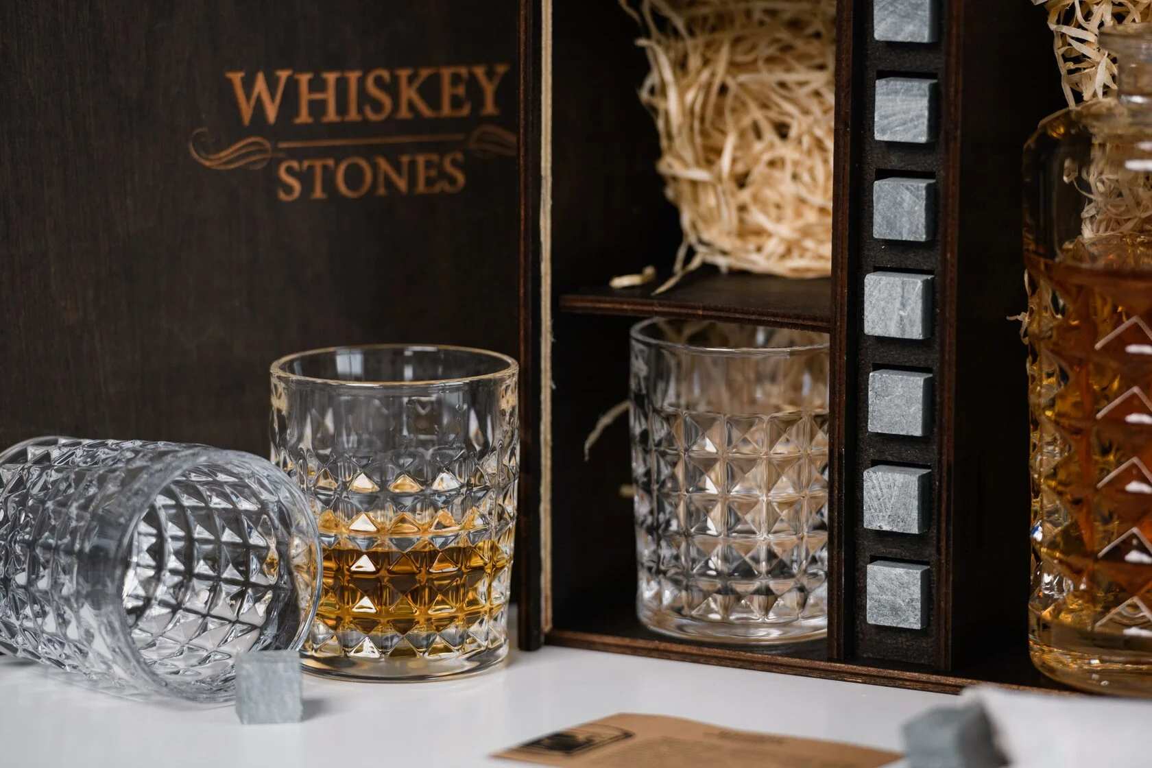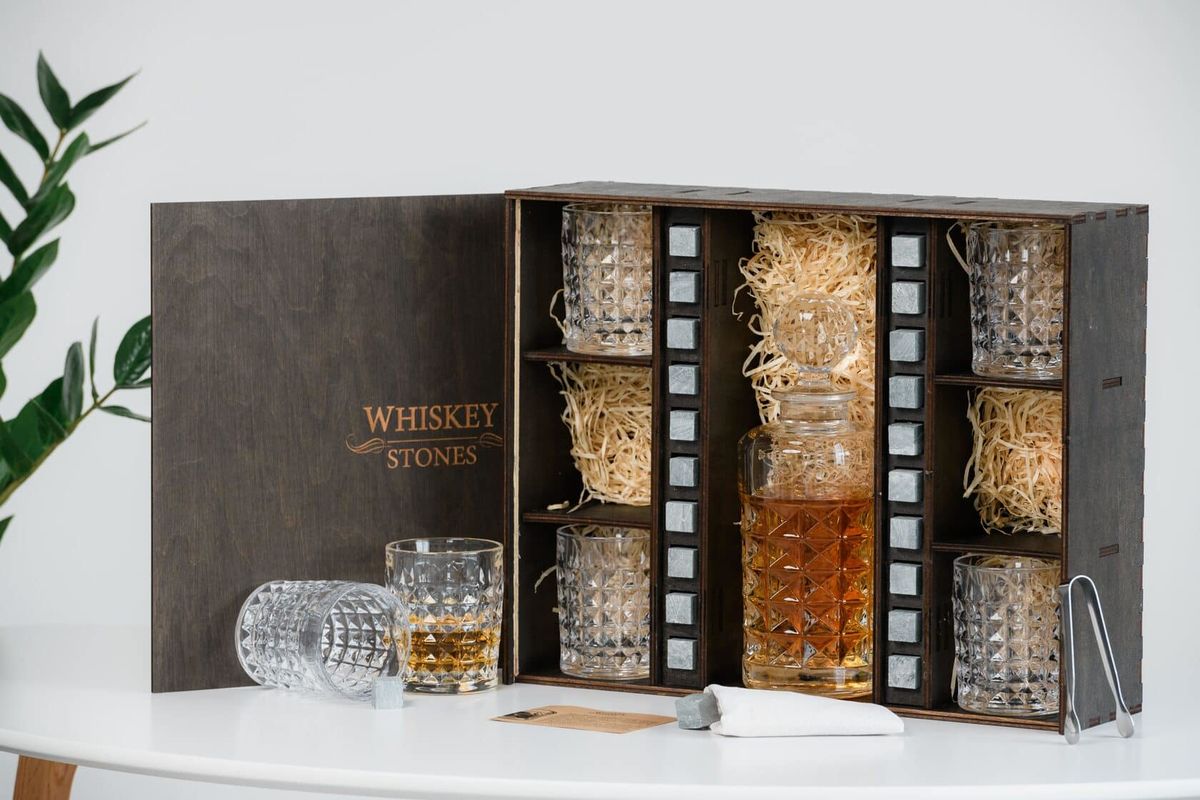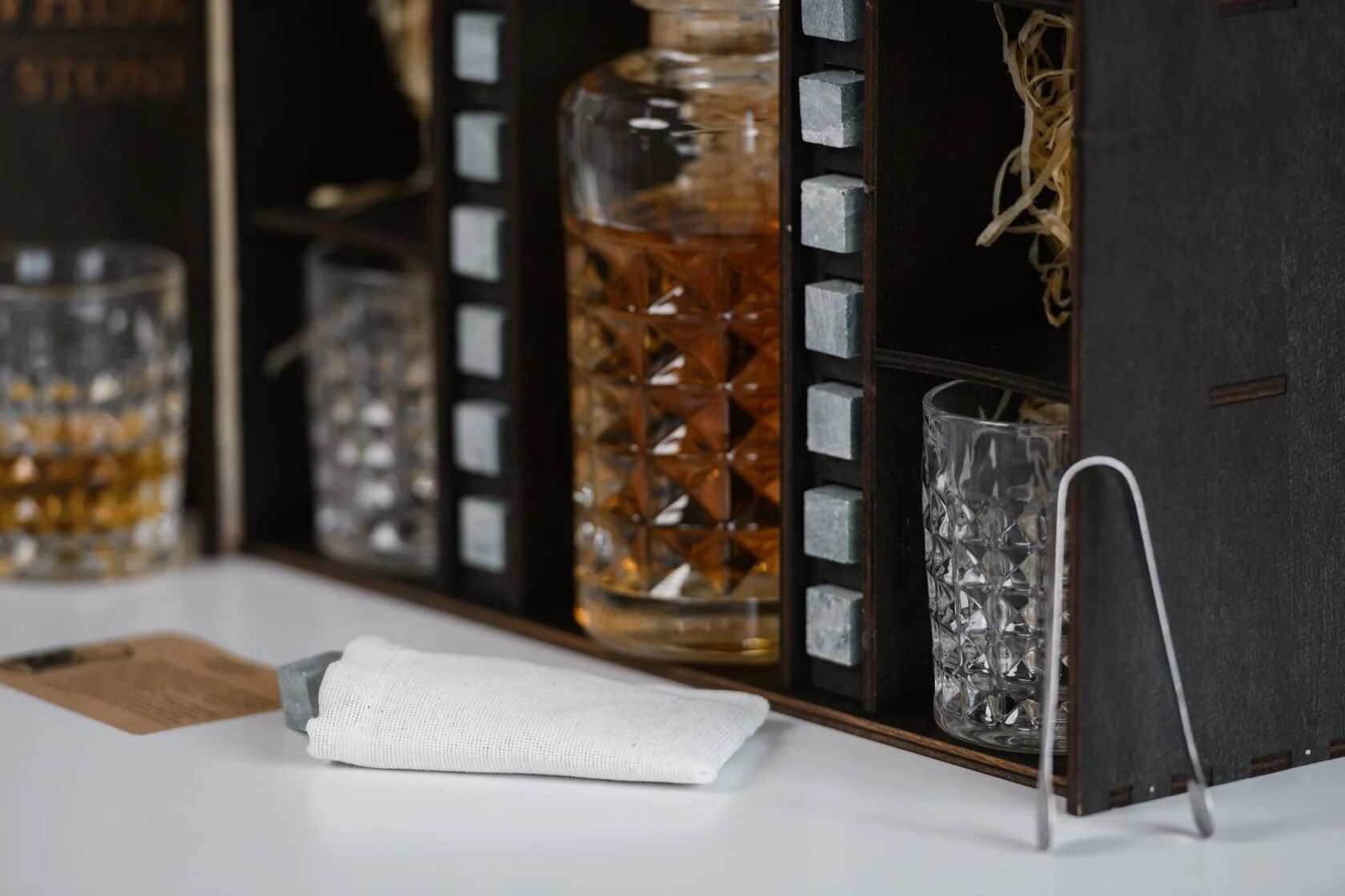 — Индивидуальная гравировка: без гравировки / на камнях / на крышке коробки / на камнях и крышке / на камнях, крышке и стаканах / на камнях, крышке, стаканах и декантере / на камнях, крышке, стаканах, декантере и подставках