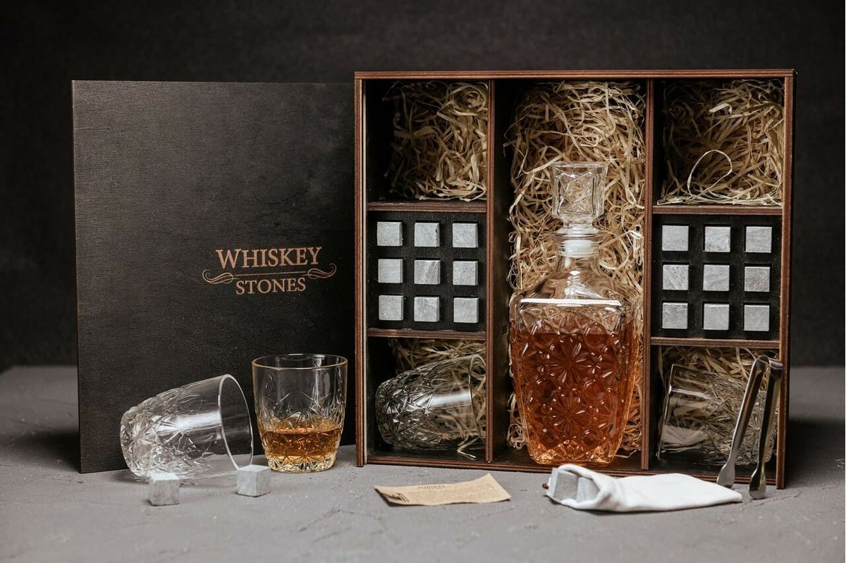 — Индивидуальная гравировка: без гравировки / на камнях / на крышке коробки / на камнях и крышке / на камнях, крышке и стаканах / на камнях, крышке, стаканах и декантере / на камнях, крышке, стаканах, декантере и подставка