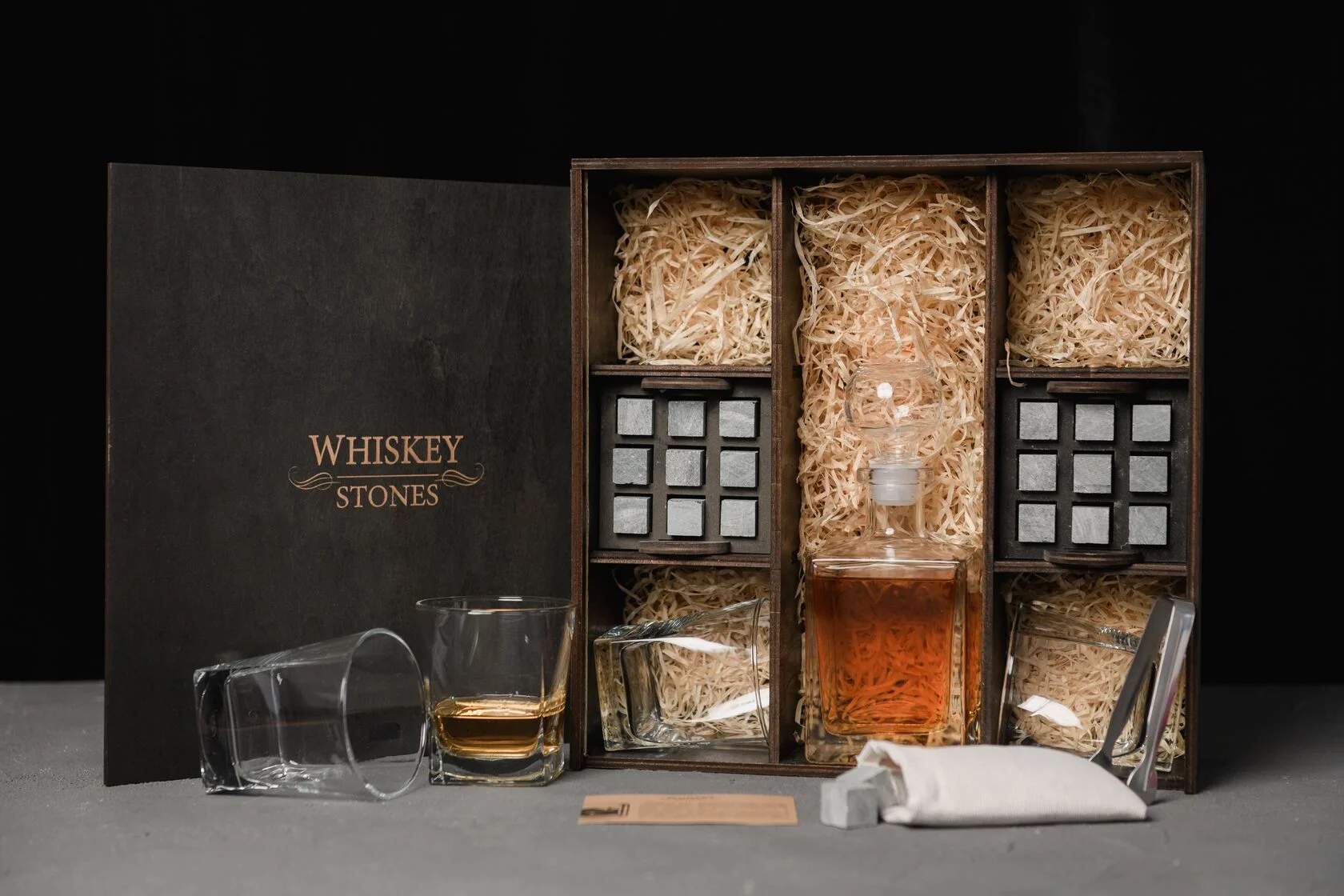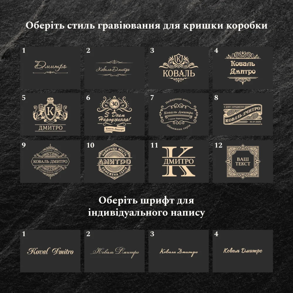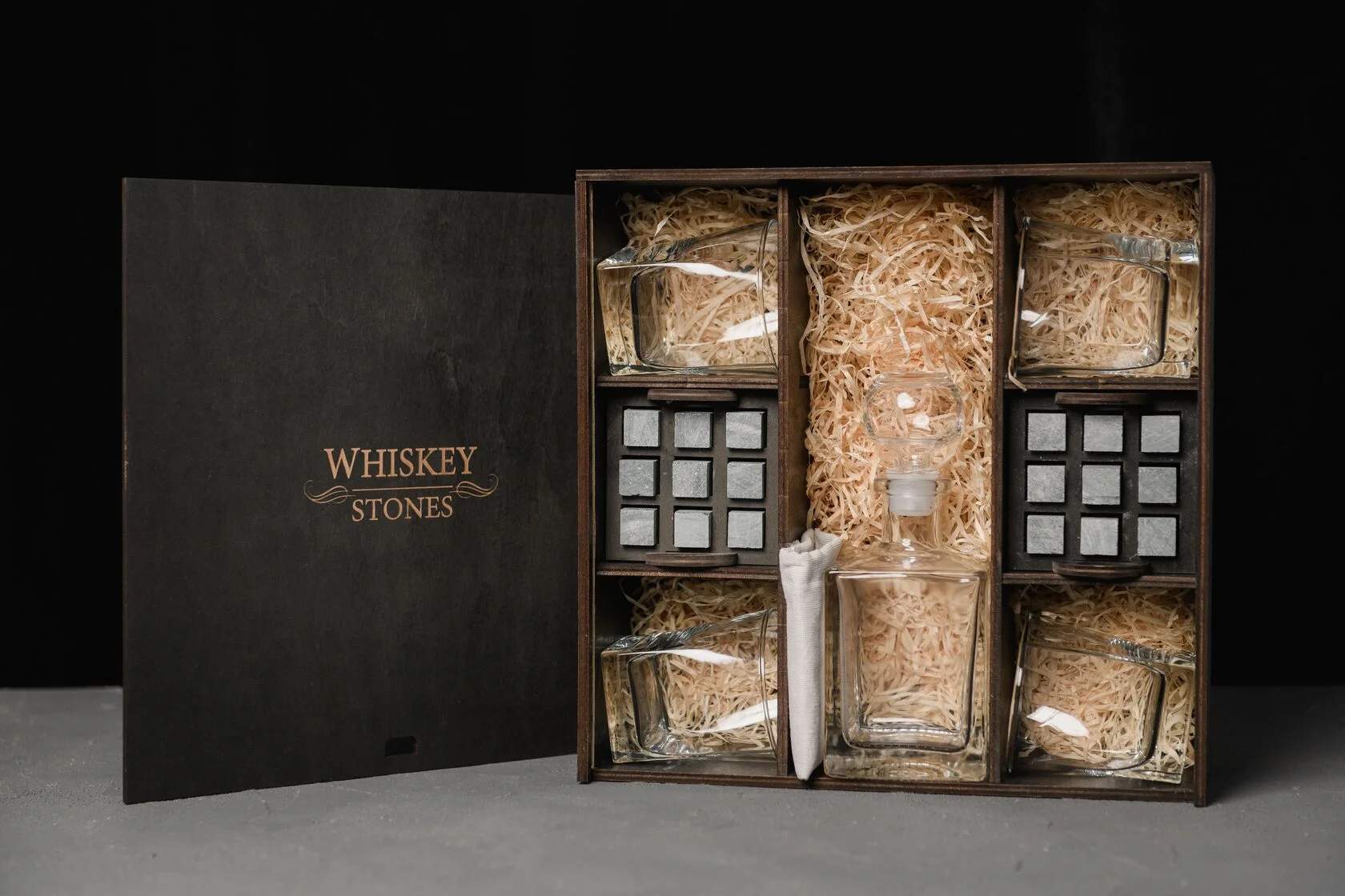 — Индивидуальная гравировка: без гравировки / на камнях / на крышке коробки / на камнях и крышке / на камнях, крышке и стаканах / на камнях, крышке, стаканах и декантере / на камнях, крышке, стаканах, декантере и подставка