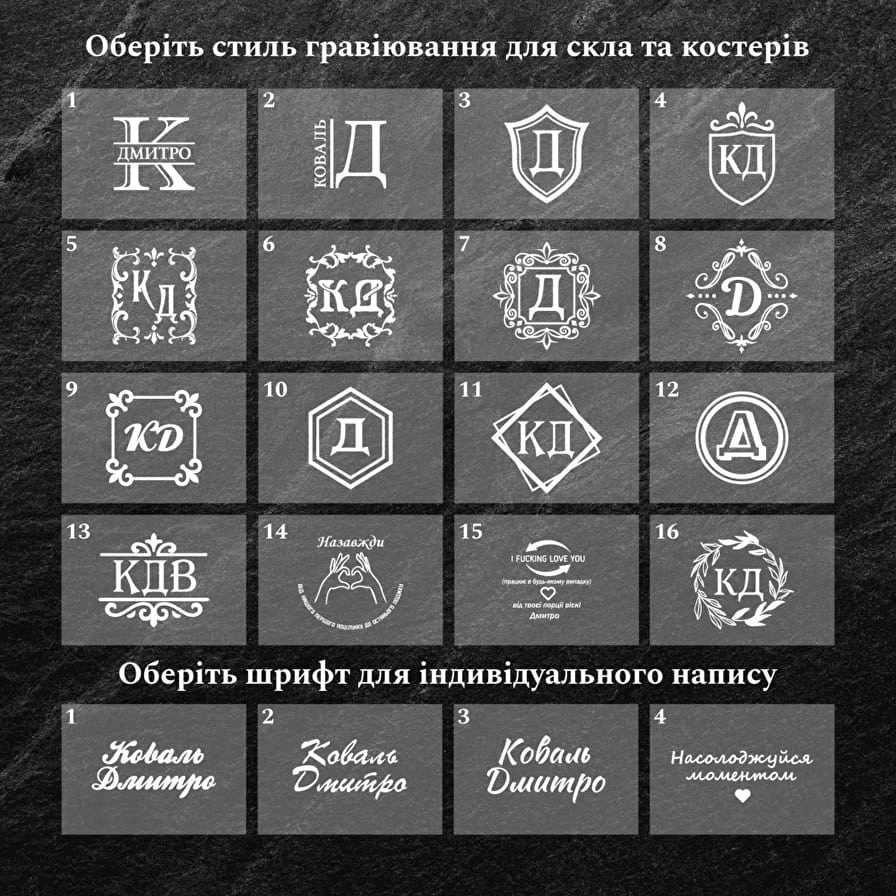 *При выборе гравировки обязательно просмотрите последние изображения в фотоленте — на них представлены пронумерованные макеты, которые можно выбрать для нанесения на ваш набор.