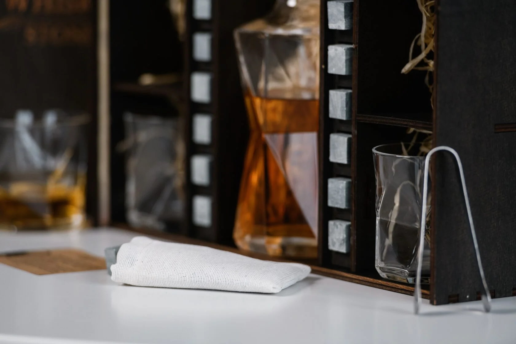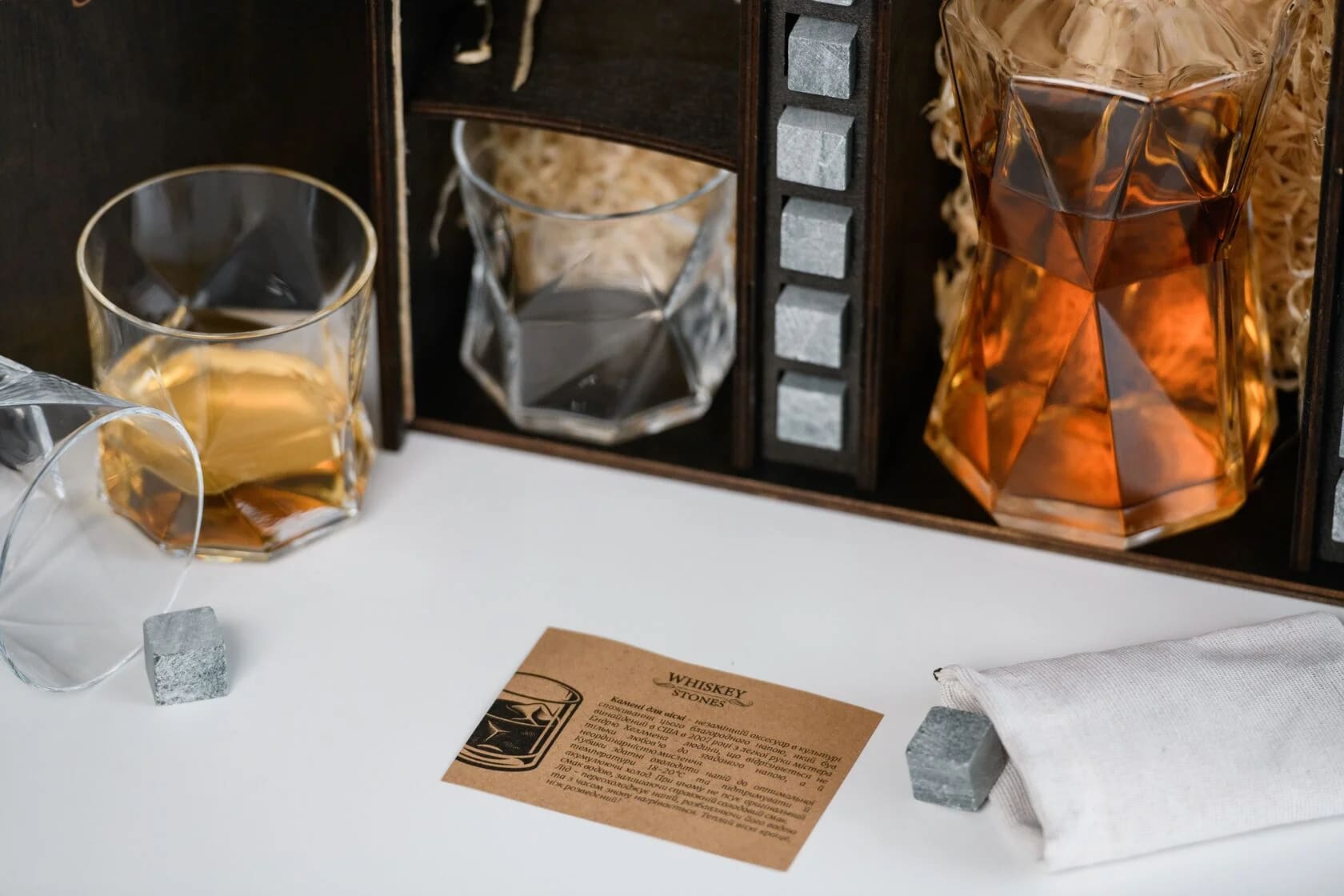 — Индивидуальная гравировка: без гравировки / на камнях / на крышке коробки / на камнях и крышке / на камнях, крышке и стаканах / на камнях, крышке, стаканах и декантере / на камнях, крышке, стаканах, декантере и подставках