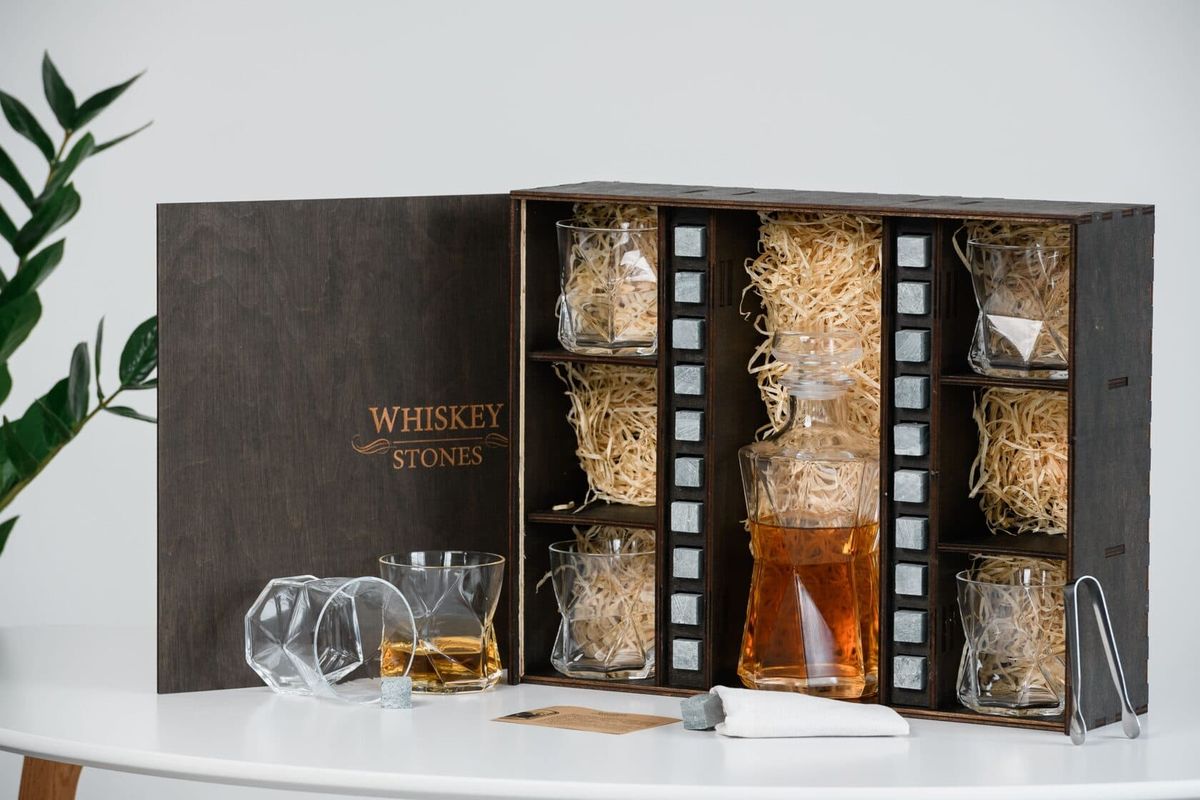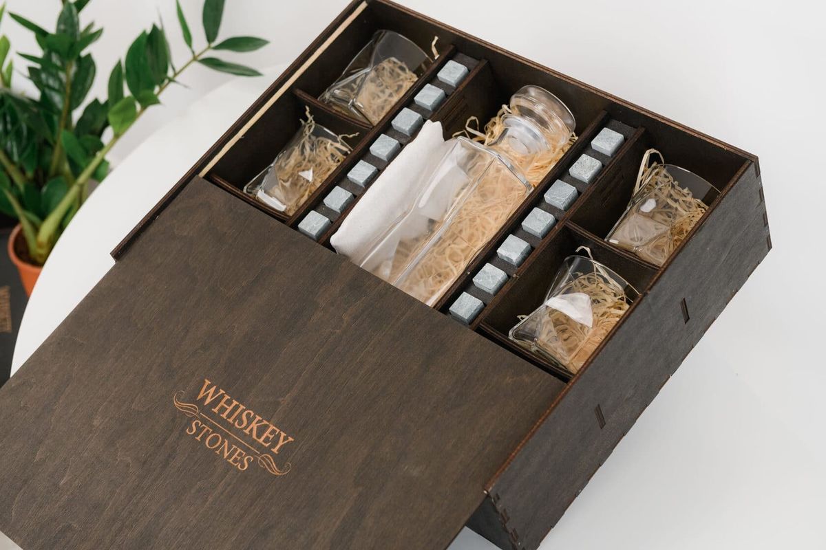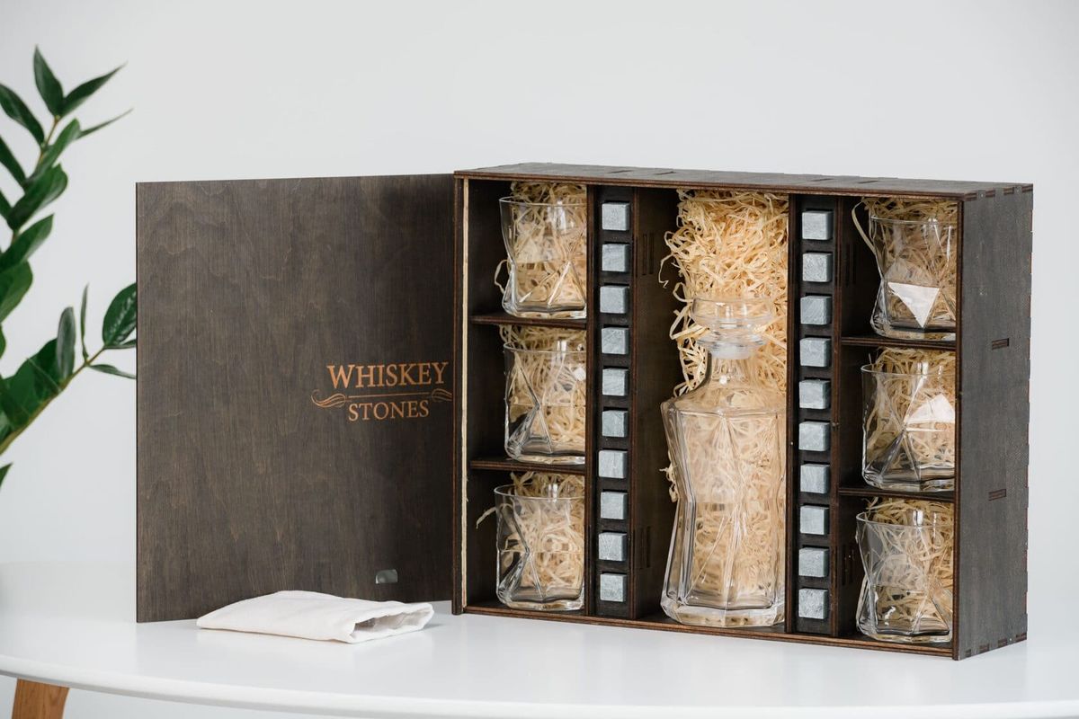 Геометрическая форма подчёркивает креативную элегантность набора. От такого бокала ваши гости будут в восторге. Подарочный деревянный пенал для виски укомплектован оригинальными камнями для виски. В комплект входят стаканы и декантер для виски от итальянского производителя: