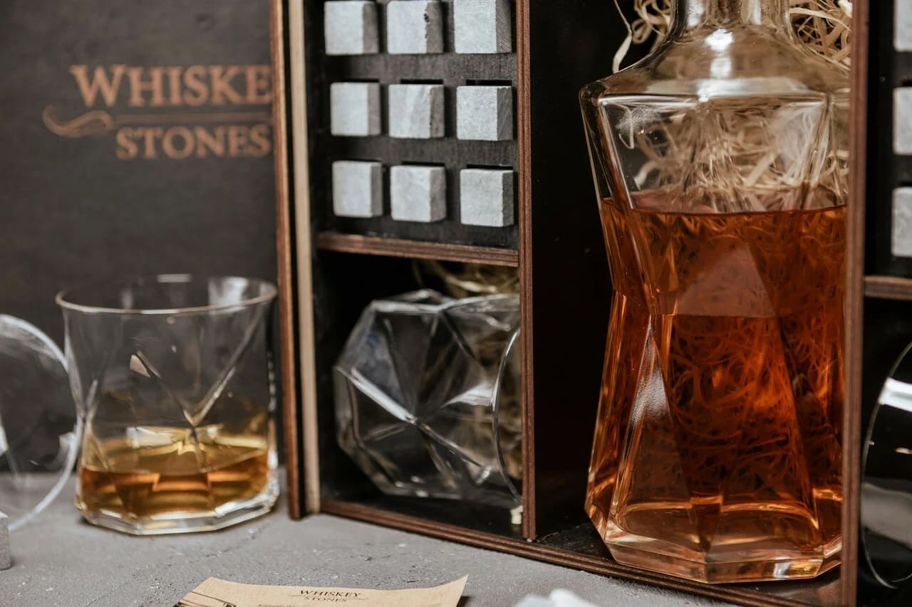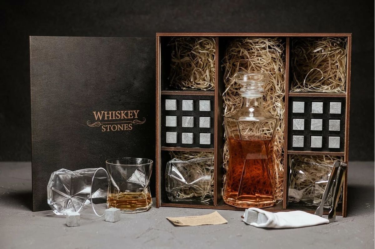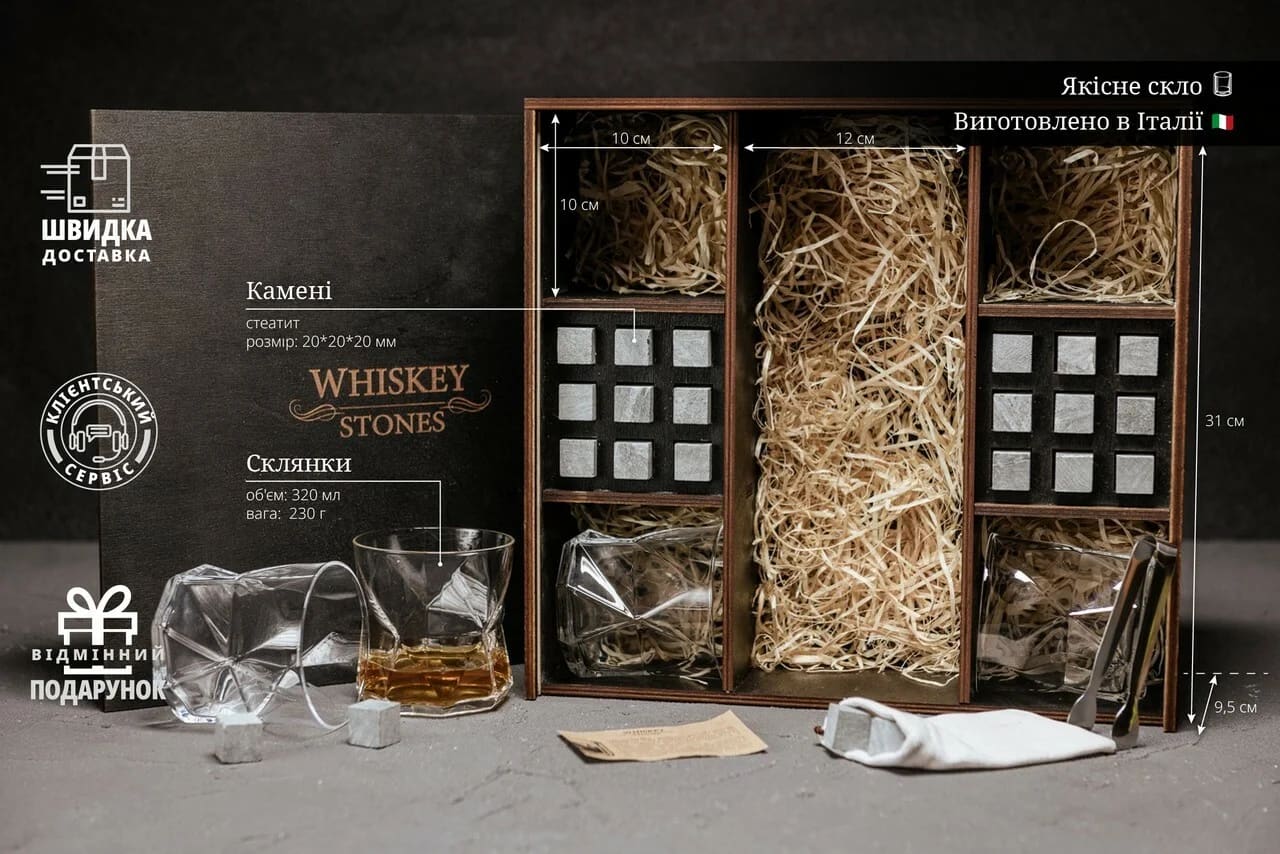 Геометрическая форма  подчеркивает креативную элеганстность набора. От такого бокала ваши гости будут в восторге. Подарочный деревянный пенал для виски укомплектованный оригинальными стеатитовыми камнями для виски. В комплекте стаканы и декантер для виски от италийского производителя: