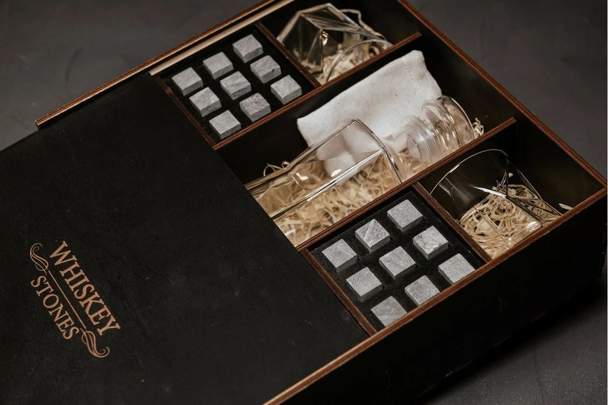 — Индивидуальная гравировка: без гравировки / на камнях / на крышке коробки / на камнях и крышке / на камнях, крышке и стаканах / на камнях, крышке, стаканах и декантере / на камнях, крышке, стаканах, декантере и подставка