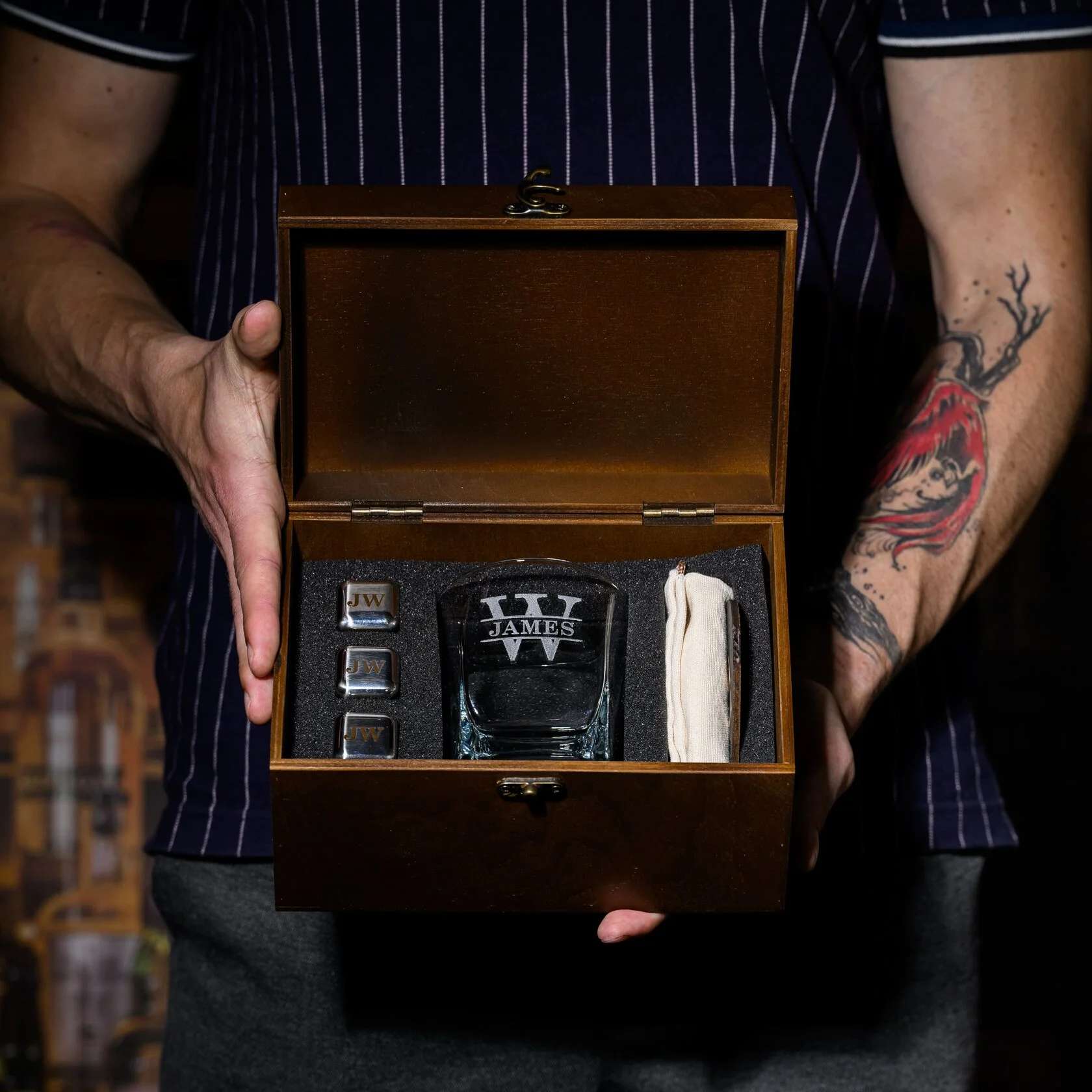 Три многоразовых стальных кубика сохраняют идеальную температуру напитка, не разбавляя его, а щипцы и льняной мешочек завершают набор практичными деталями. Такой комплект не только удобен, но и выглядит по-настоящему статусно — он создан для ценителей виски, которые уважают чистоту вкуса и эстетику подачи.