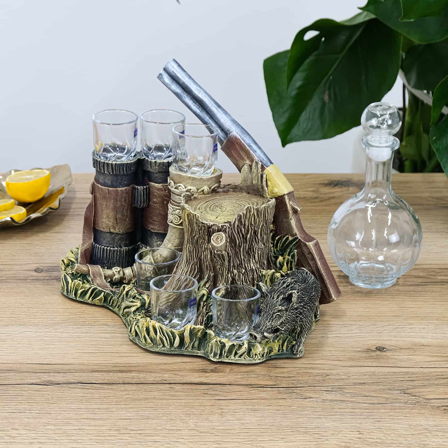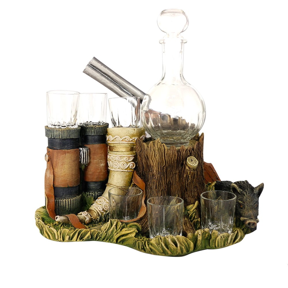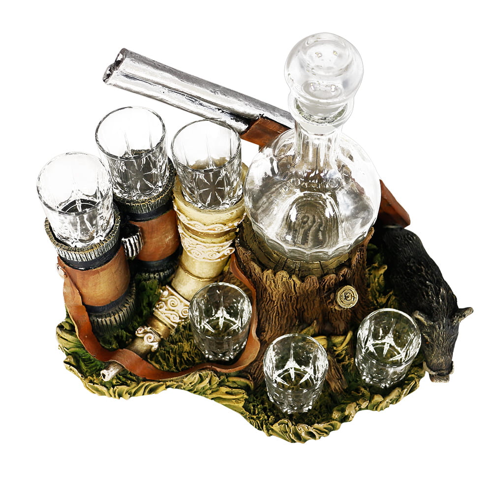 Штоф Кабан – оригинальный подарок ручной работы. Штоф кабан изготовлен из надежного полимерного материала с изображением неотъемлемых охотничьих атрибутов: ружье, бинокль, рог и, конечно же, добыча – кабан! В комплект входят шесть стеклянных стопок и графин. Штоф-бар станет функциональным подарком, также этот сувенир будет необычным декором интерьера беседки, гостевого домика или каминной комнаты.