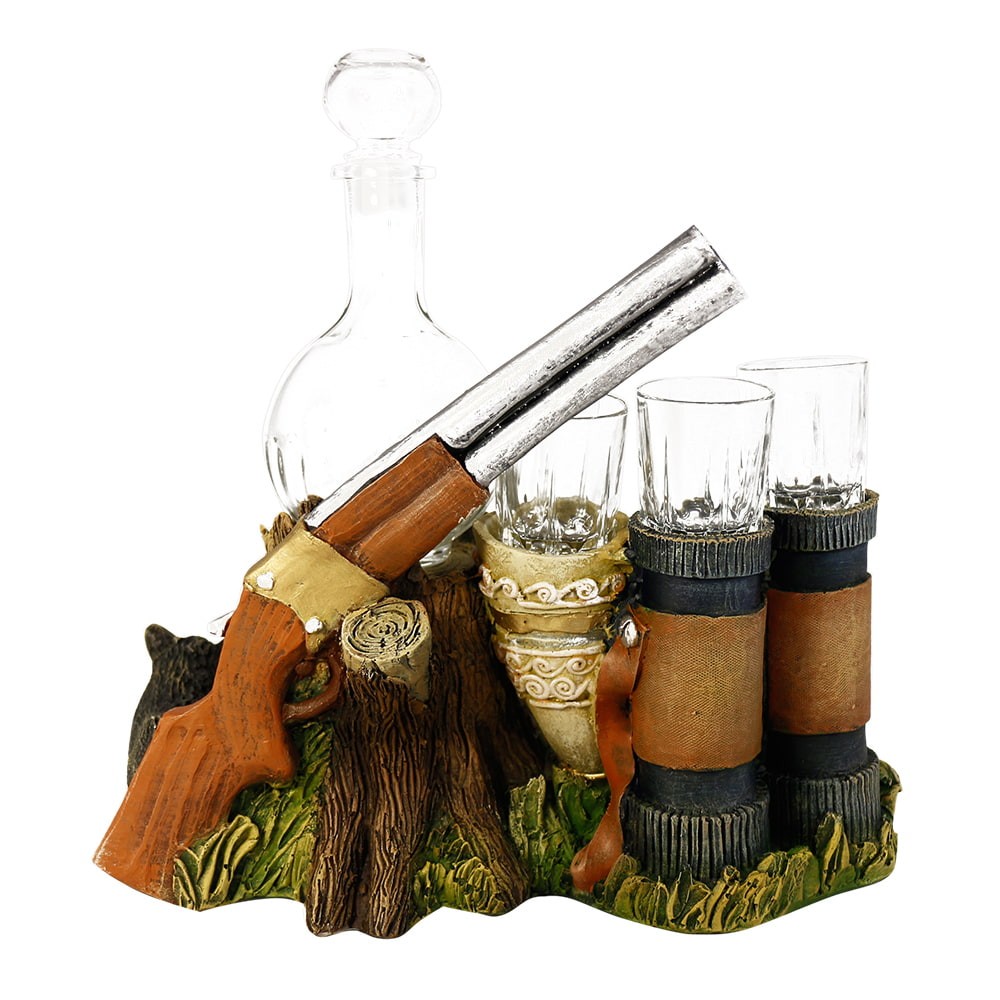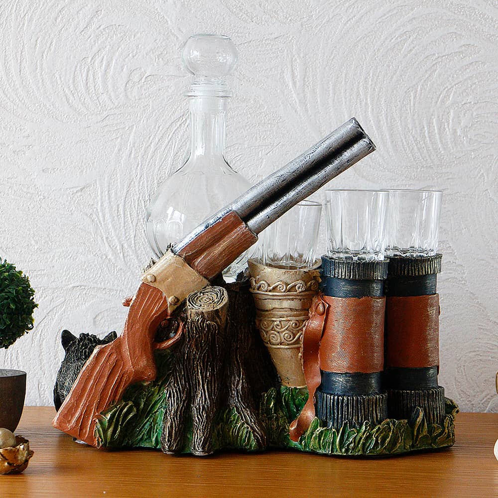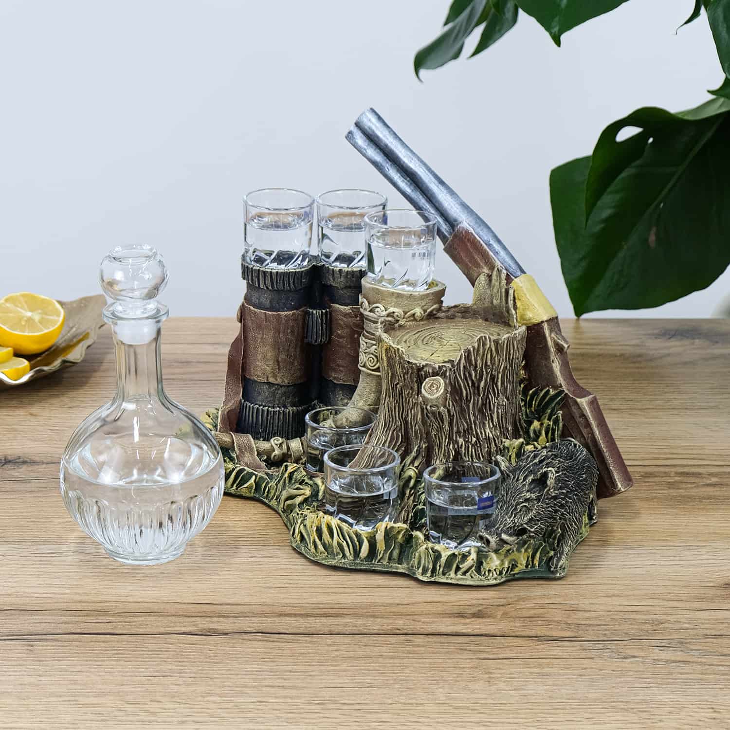 Штоф Кабан – оригинальный подарок ручной работы. Штоф кабан изготовлен из надежного полимерного материала с изображением неотъемлемых охотничьих атрибутов: ружье, бинокль, рог и, конечно же, добыча – кабан! В комплект входят шесть стеклянных стопок и графин. Штоф-бар станет функциональным подарком, также этот сувенир будет необычным декором интерьера беседки, гостевого домика или каминной комнаты.