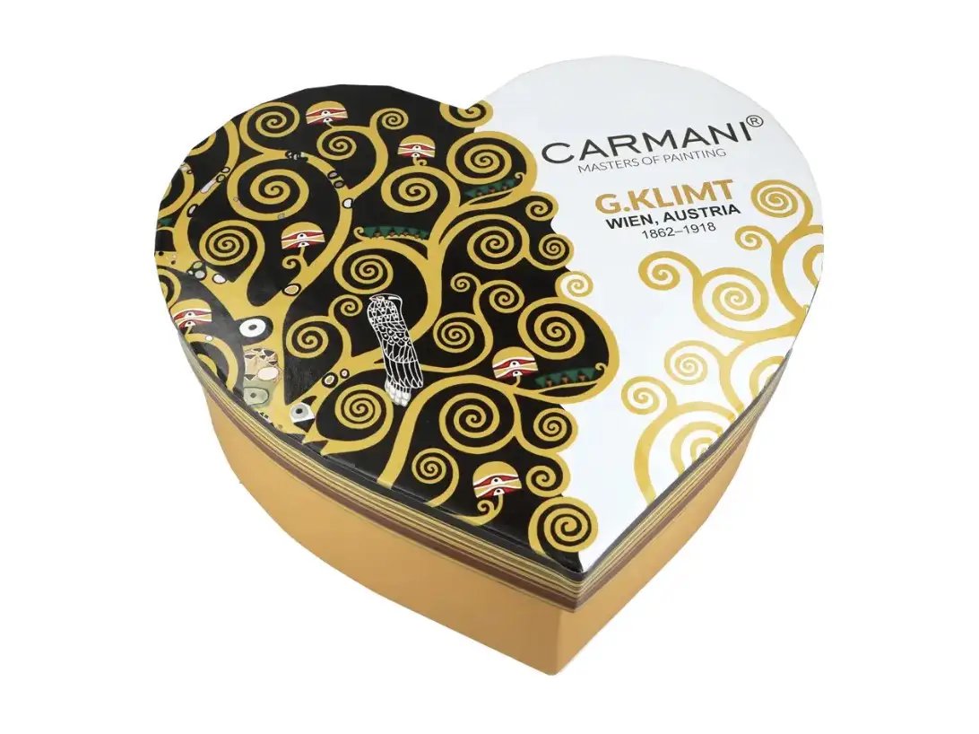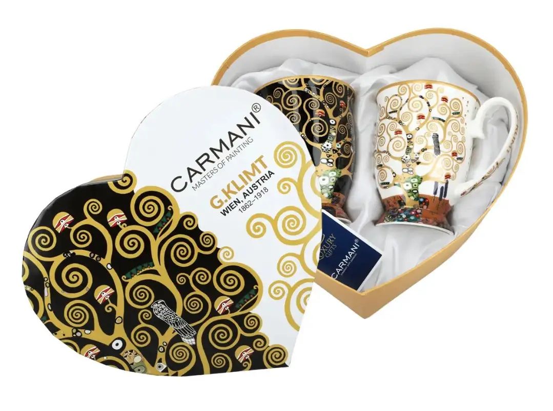 Подарочный набор Carmani с двумя фарфоровыми кружками в форме сердца — это изысканный предмет для особых моментов и теплых чувств. Дизайн вдохновлён мотивом «Дерево жизни» Густава Климта и выполнен в насыщенной декоративной манере с золотистыми акцентами, сложными орнаментами и выразительным контрастом цветов. Каждая кружка выглядит как самостоятельный арт-объект, привлекающий внимание с первого взгляда.