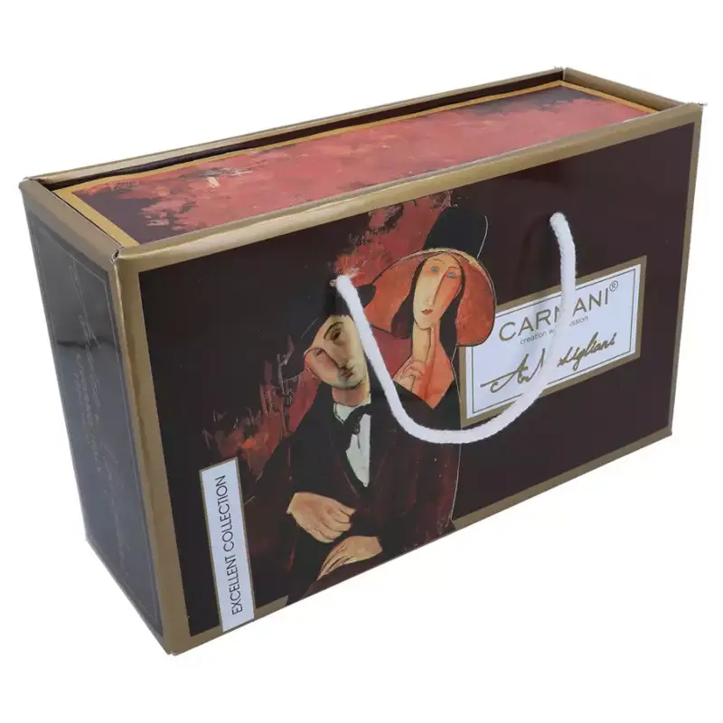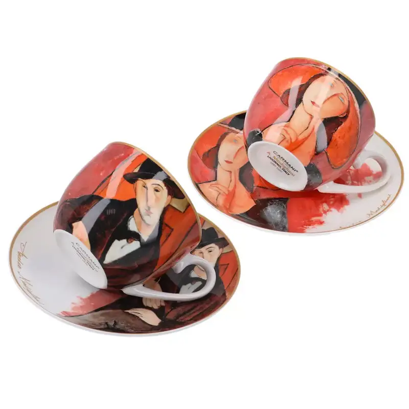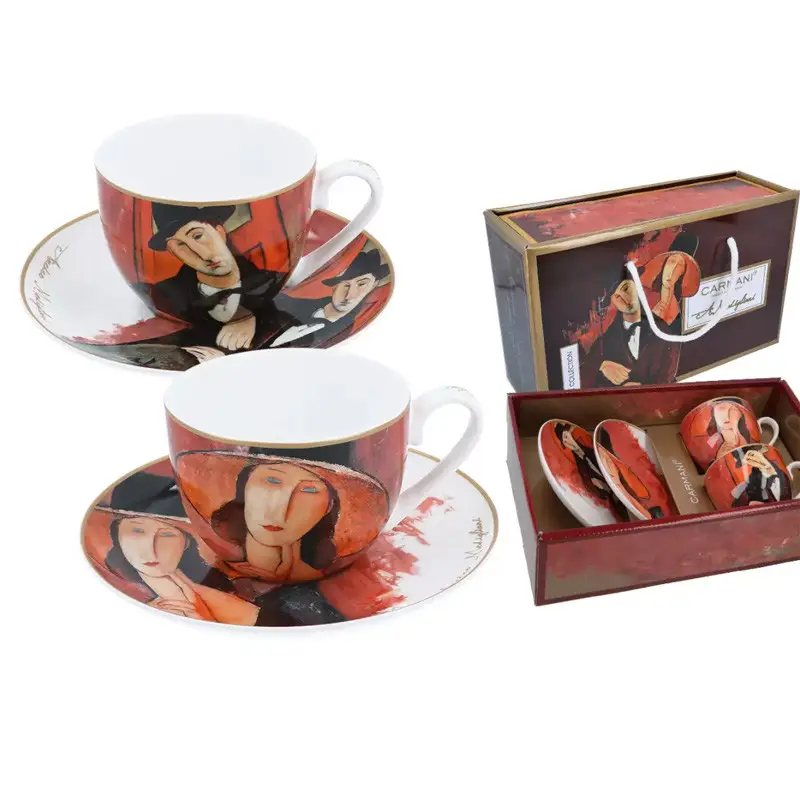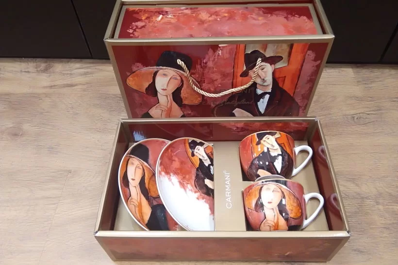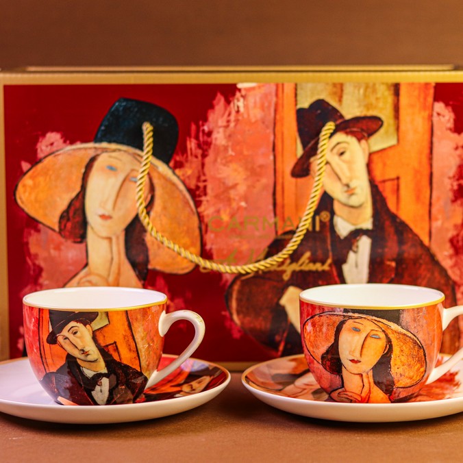 Подарочный набор Carmani — это изысканное сочетание утончённого вкуса, художественной эстетики и практичности. В комплект входят две кружки объёмом 250 мл и два блюдца, выполненные из тонкого костяного фарфора и украшенные репродукциями культового художника Амедео Модильяни: «Женщина в шляпе» и «Марио Варфольи». Эти образы — квинтэссенция утончённости и загадочности, воплощающие дух Парижа начала XX века.