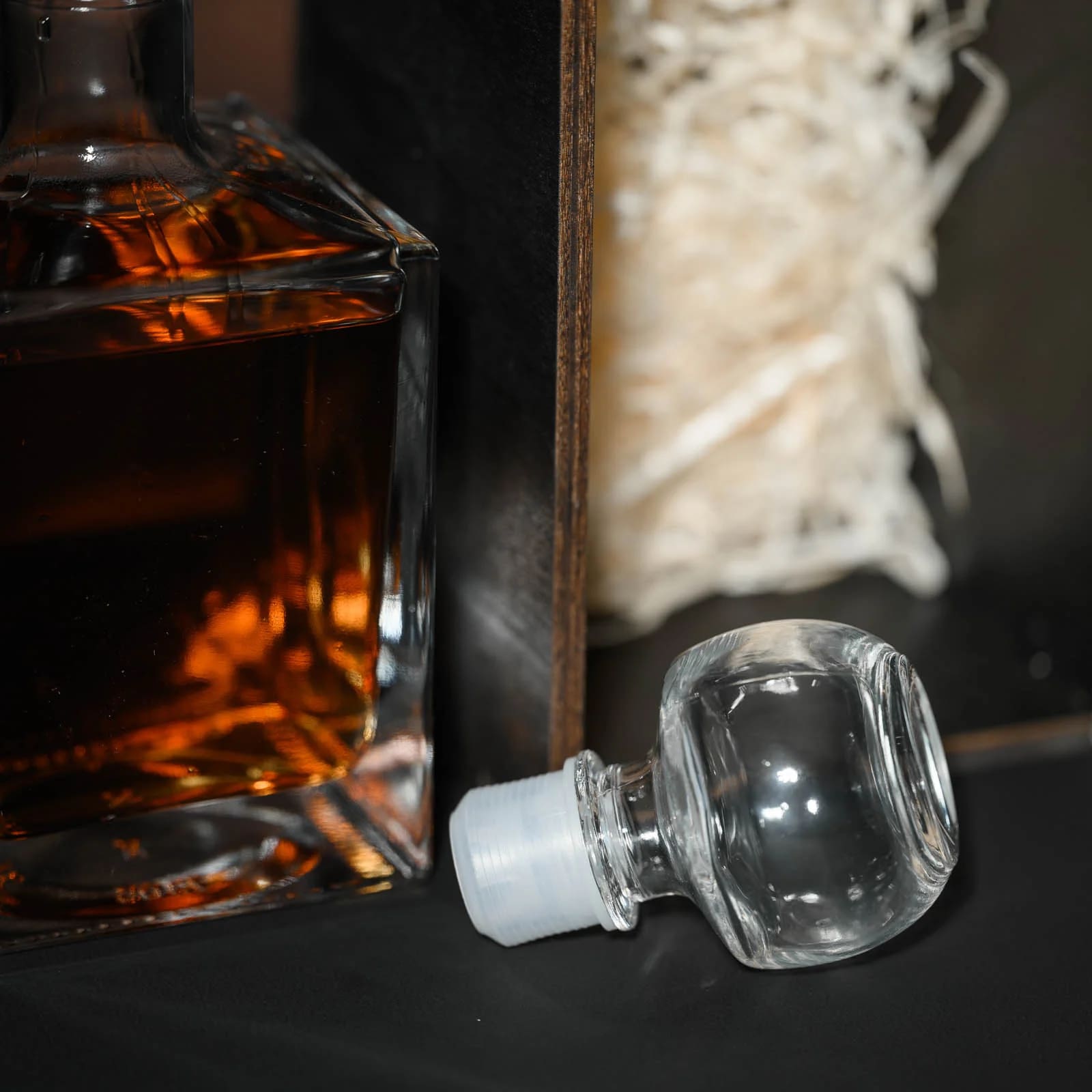 В центре внимания — изысканный декантер от бренда Pasabahce, выполненный из качественного стекла с характерной геометрией. Его форма подчёркивает цвет и насыщенность виски, а массивное основание придаёт устойчивость и солидность. Такой аксессуар украсит как мужской кабинет, так и уютный вечер в кругу близких, задавая ритуальность каждому глотку.