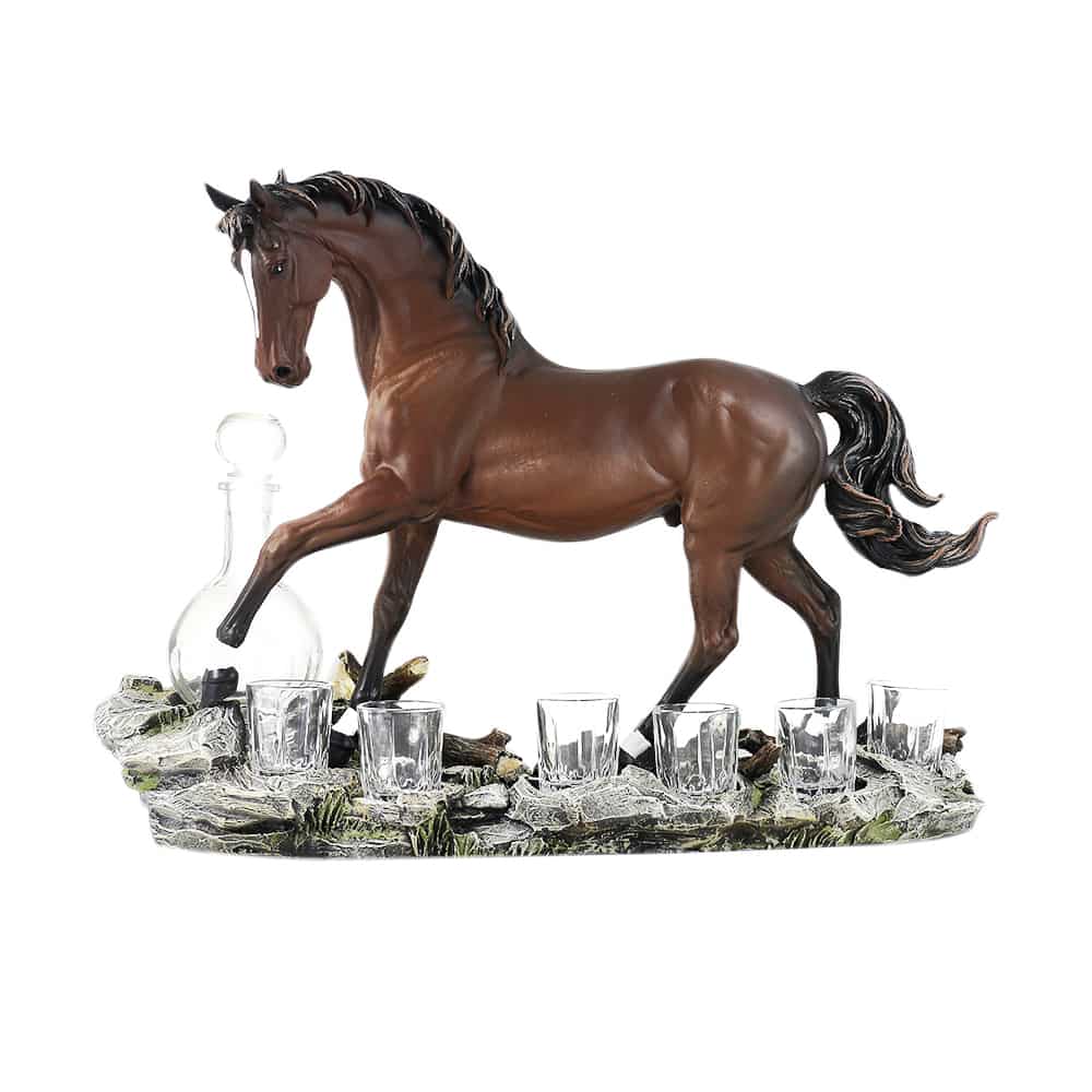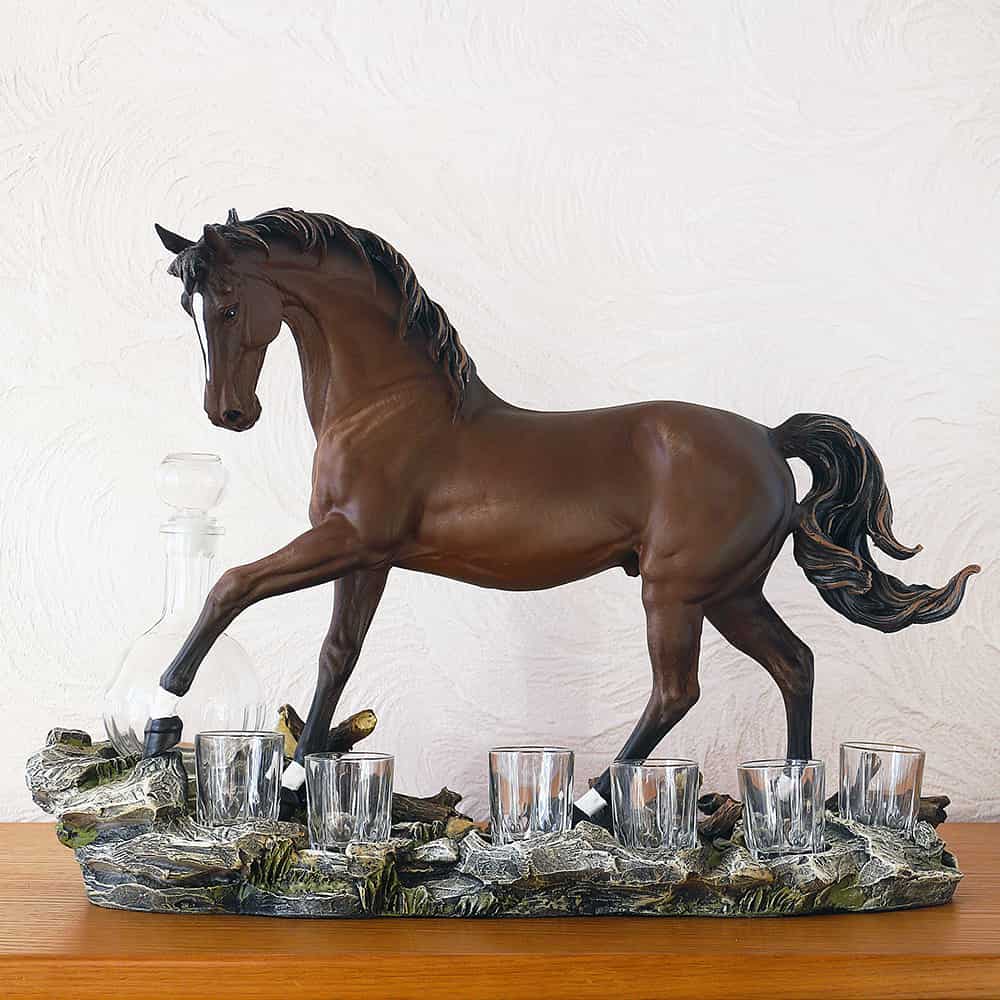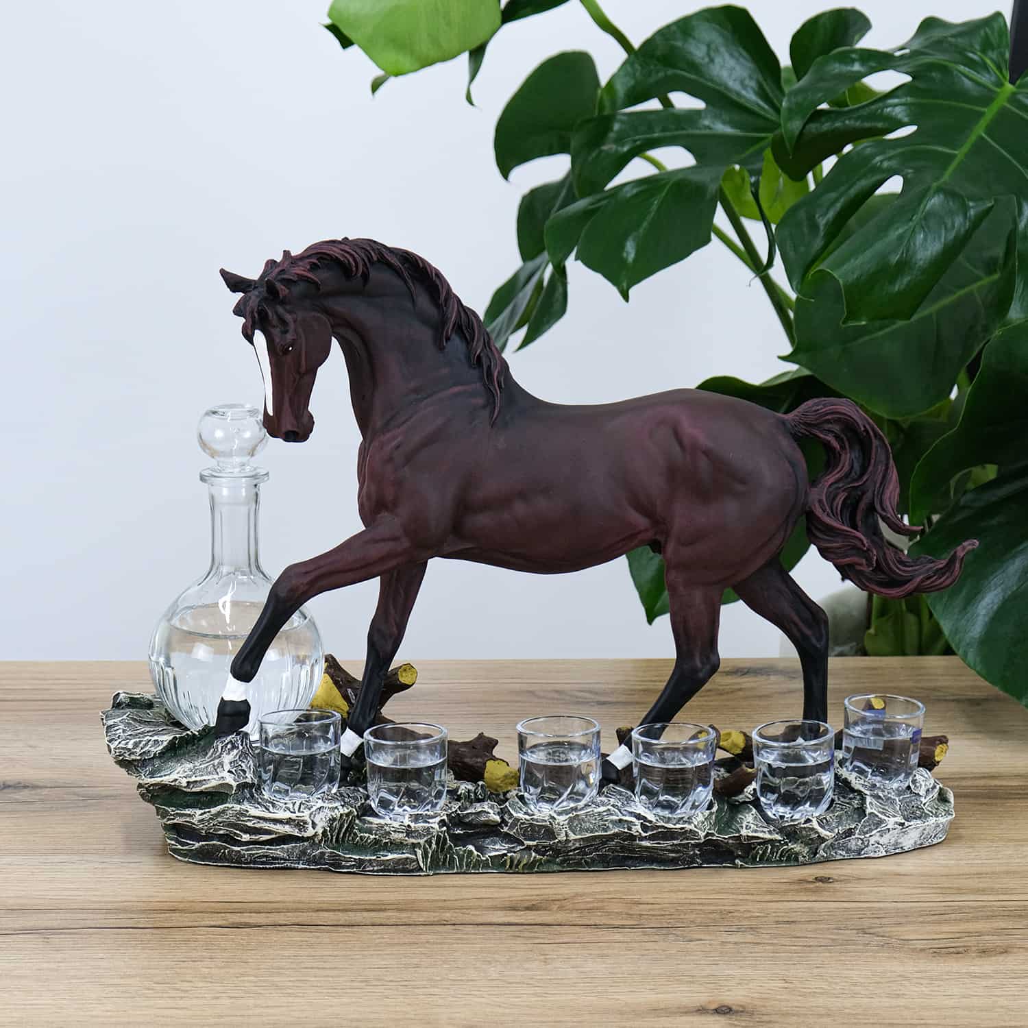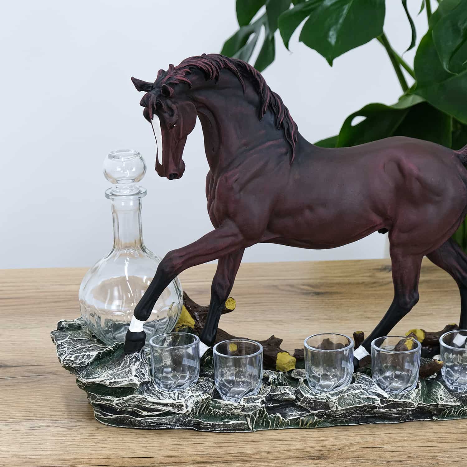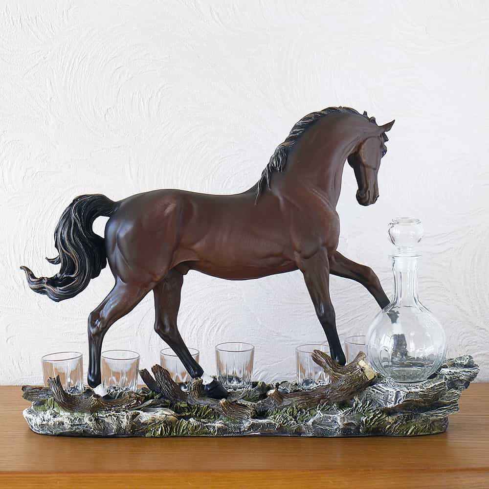 Набор для водки Конь – изящная статуэтка коня на камнях с графином и шестью стопками. Штоф выполнен из надежного полимерного материала авторской работы. В комплекте есть графин и шесть рюмок, которые можно использовать для хранения и употребления крепких напитков.