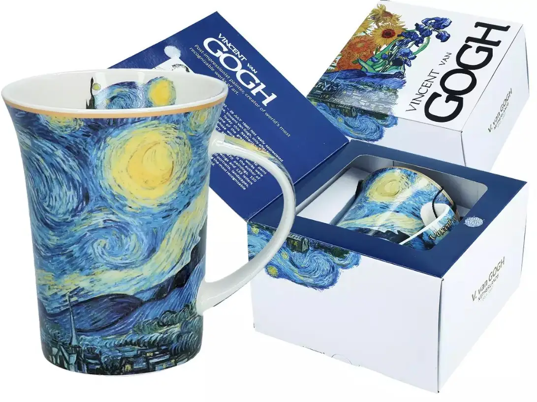 Ця кружка — не просто посуд, а витвір, що переносить вас у світ Ван Гога. На її поверхні оживає легендарна «Зоряна ніч», сповнена енергії, мрій та глибоких почуттів. Кожен ковток — як подорож у нічне небо, де думки кружляють разом із зорями.