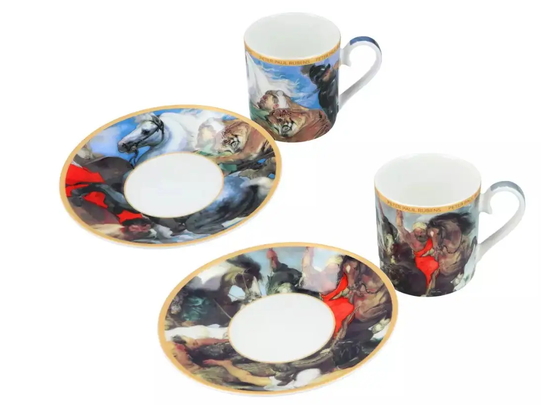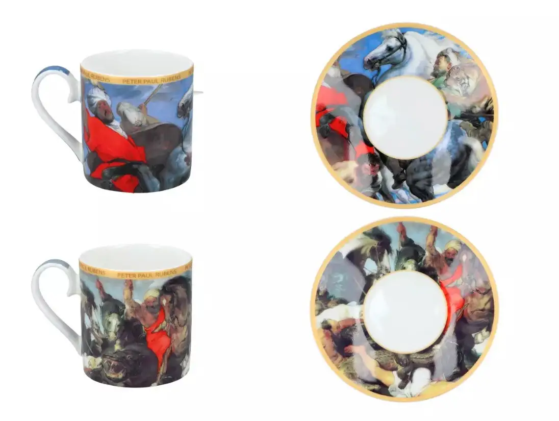 Кавовий набір Carmani з репродукцією картини Пітера Паула Рубенса "Полювання на бегемота і крокодила" — це ефектне поєднання витонченої форми та потужної художньої енергії. Дві чашки та блюдця прикрашають динамічні сцени полювання, наповнені рухом, емоцією та виразними деталями. Такий набір одразу привертає погляд і перетворює подачу кави на маленький культурний ритуал.
