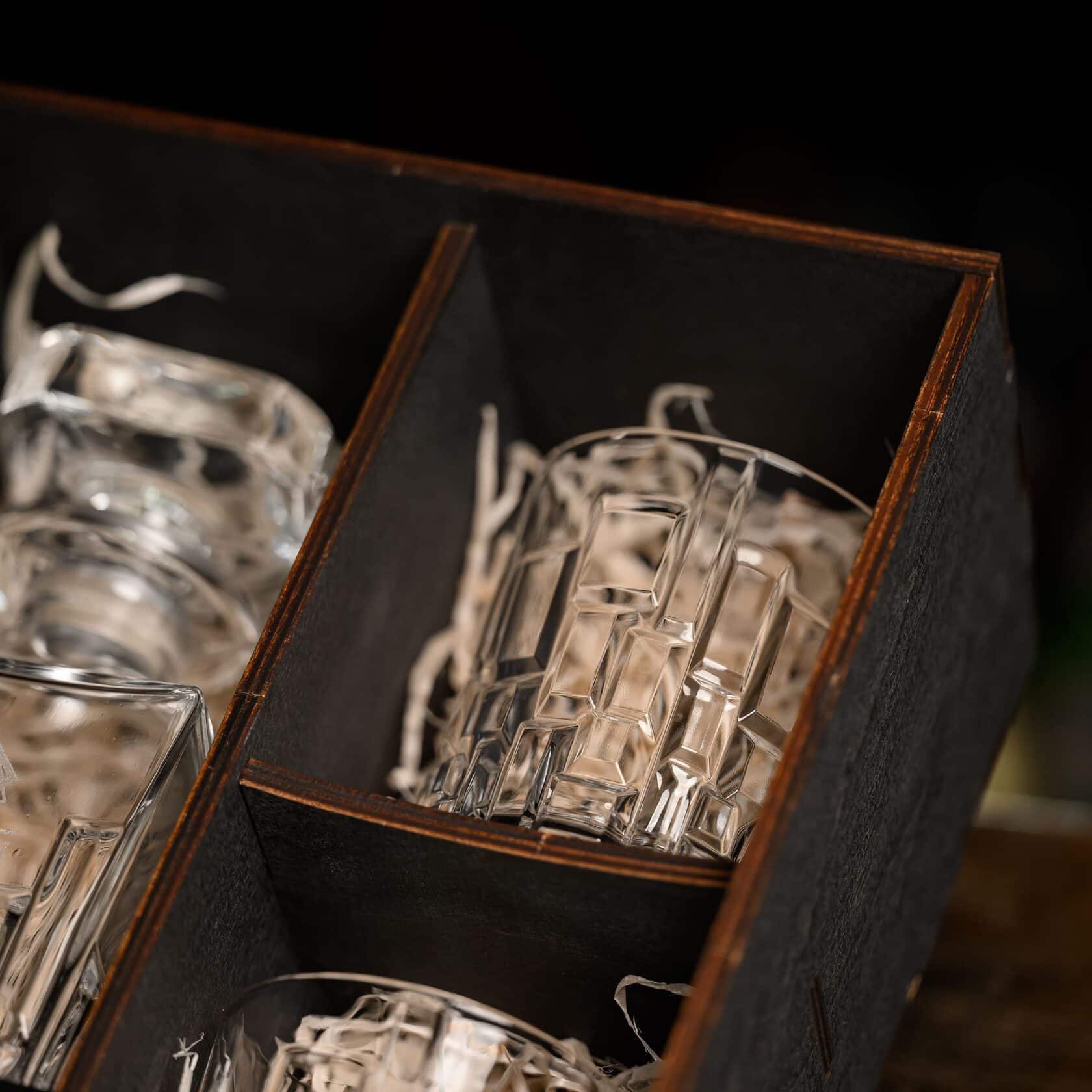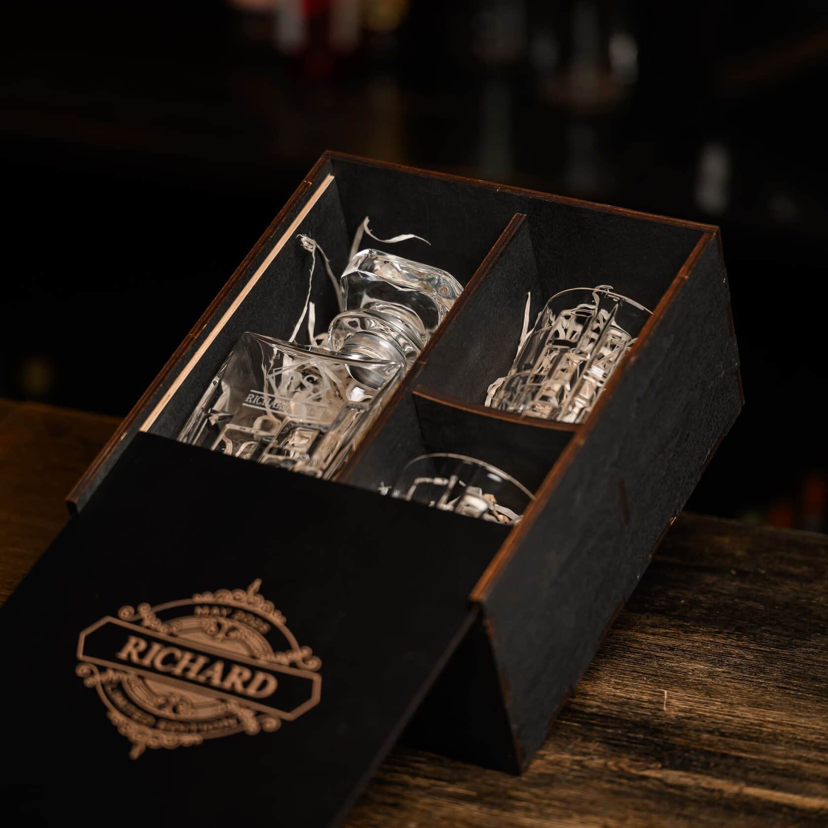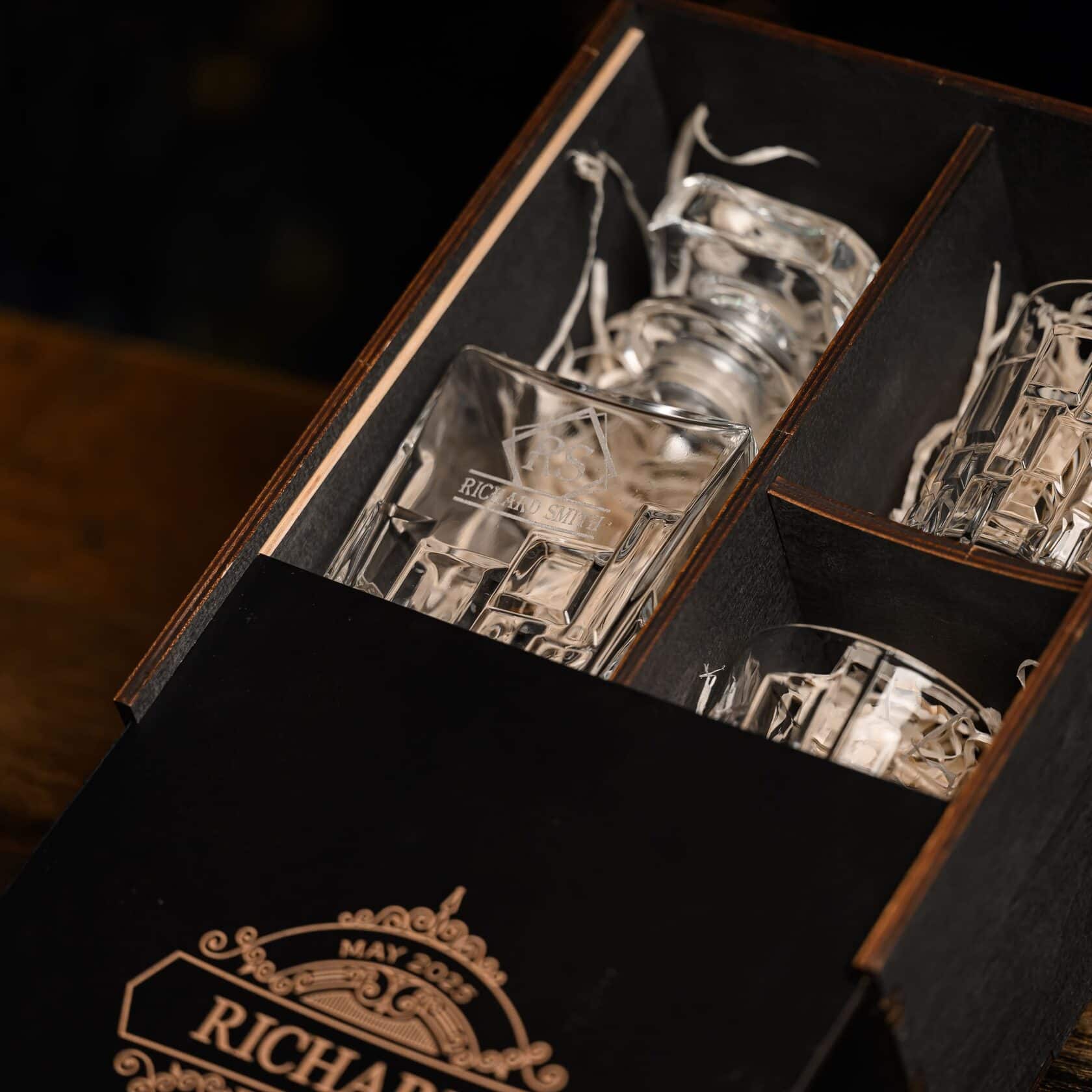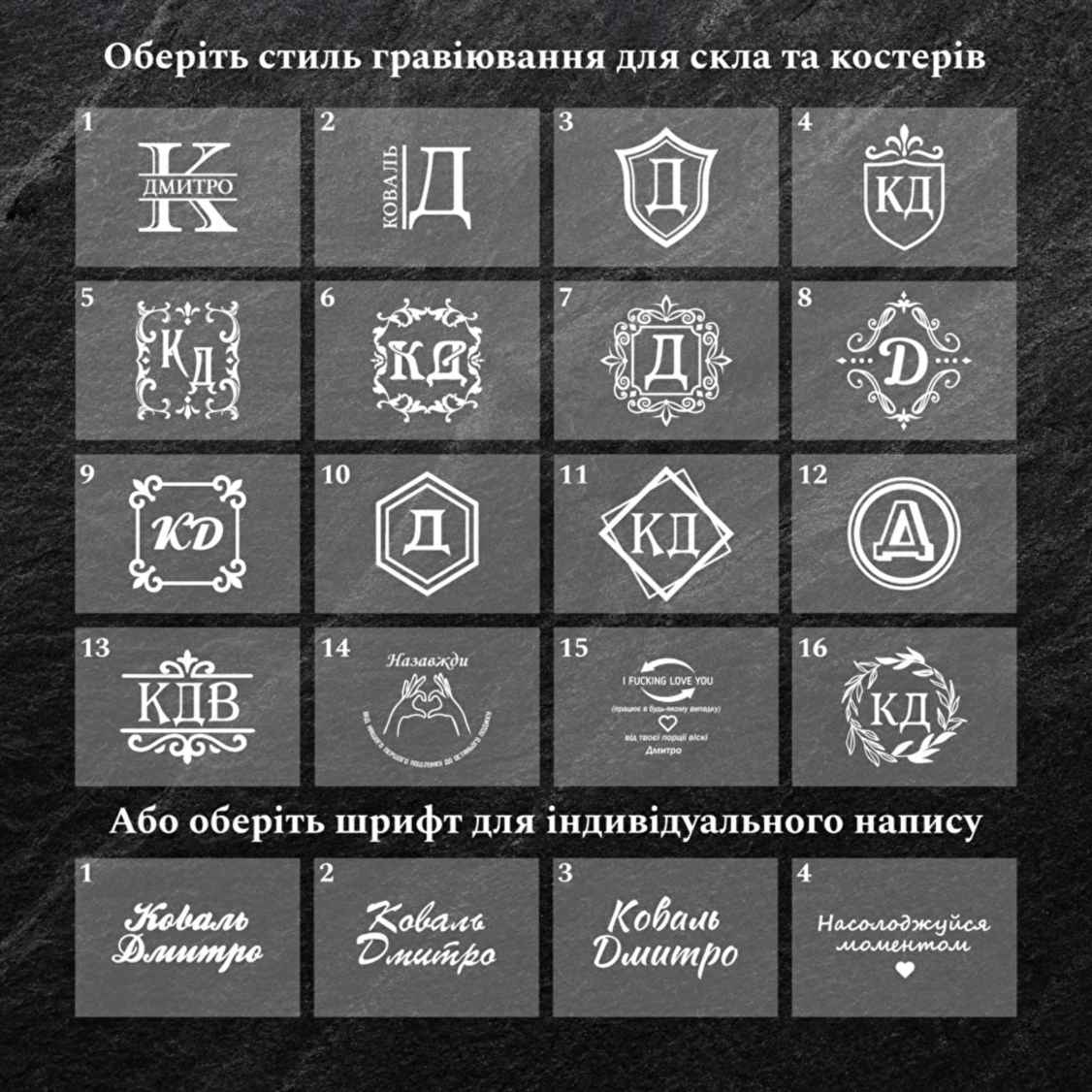 • нанесення індивідуального гравіювання на окремі елементи набору (каміння, кришку коробки, склянки, декантер, підставки) або відмова від гравіювання.