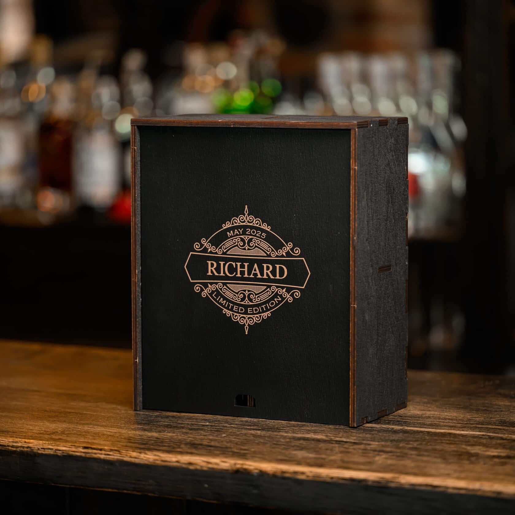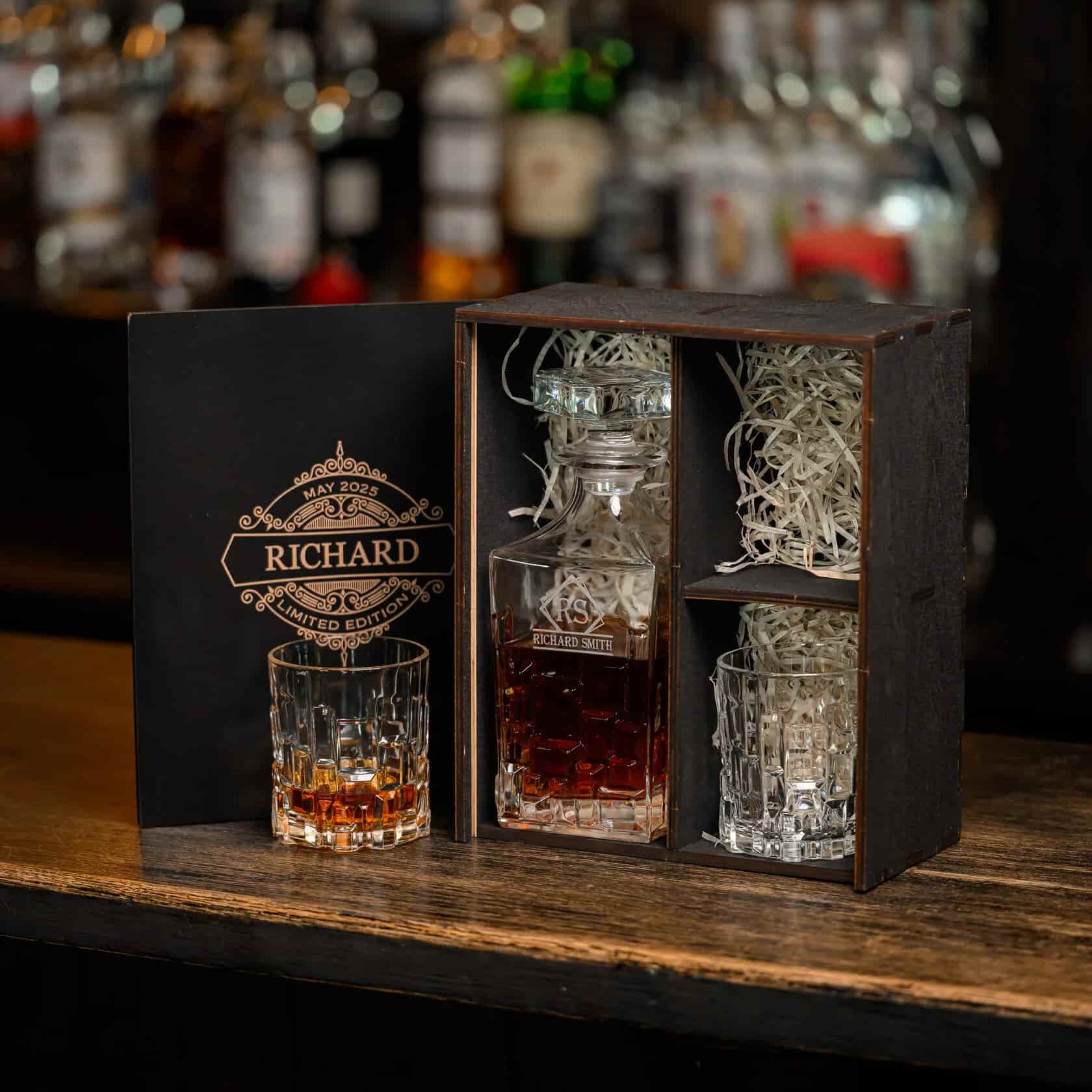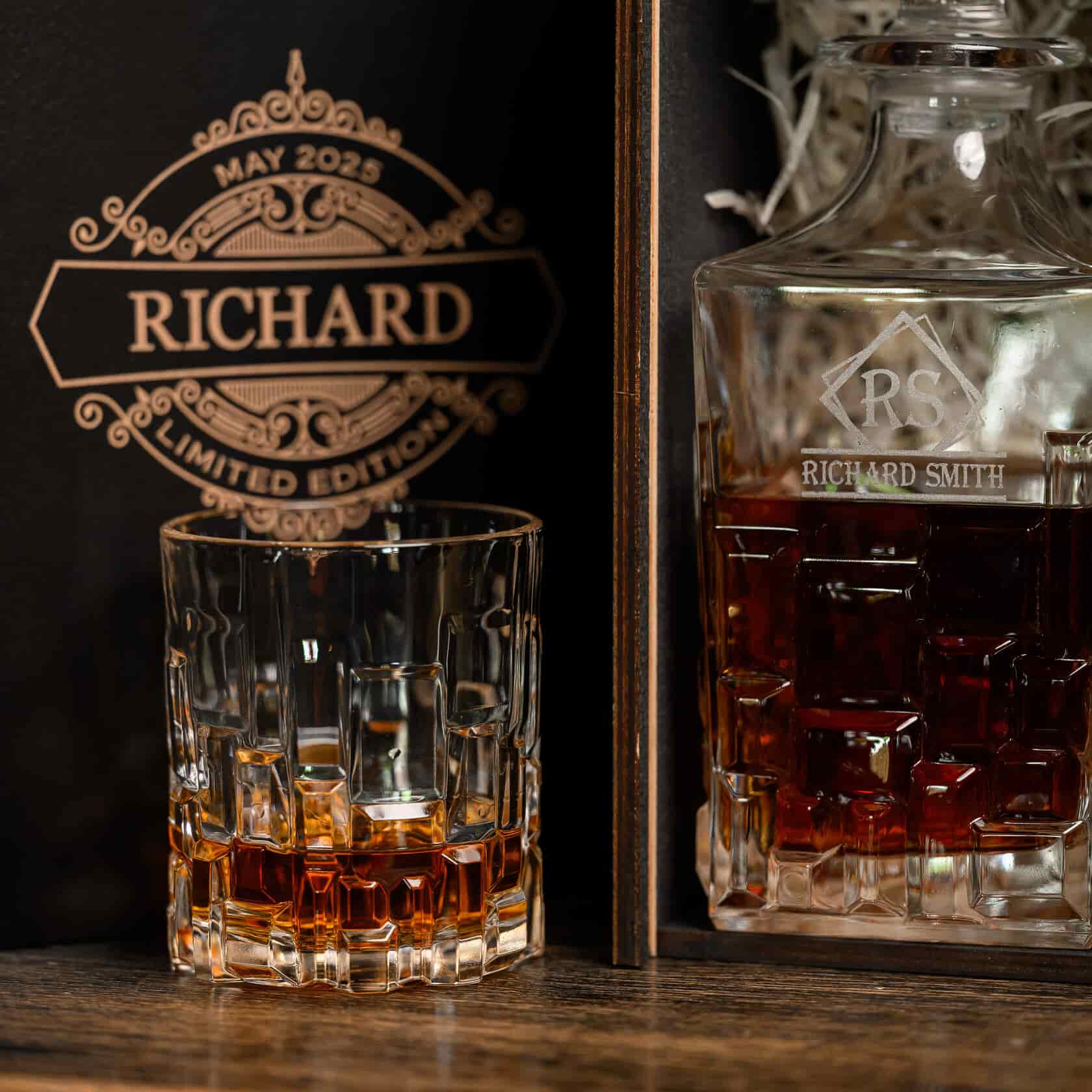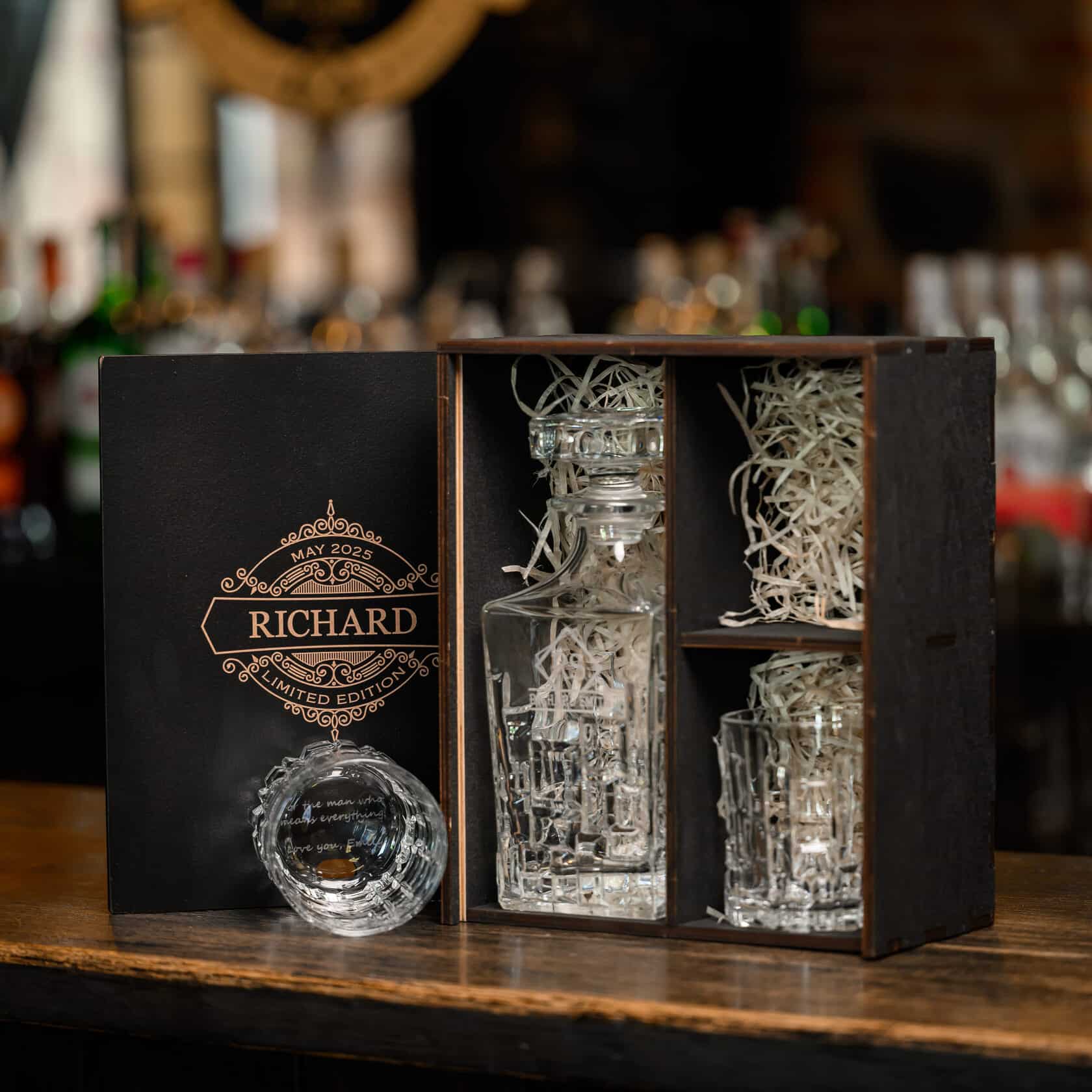 • нанесення індивідуального гравіювання на окремі елементи набору (каміння, кришку коробки, склянки, декантер, підставки) або відмова від гравіювання.