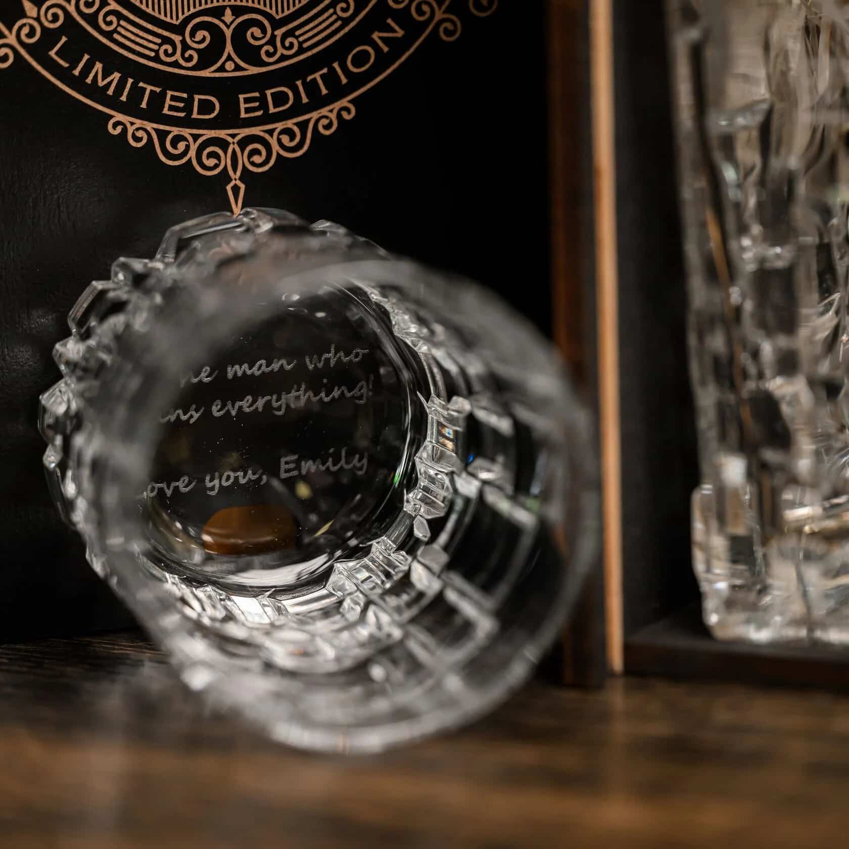 Зверніть увагу: у цій колекції гравіювання на склянках виконується на дні. Таке рішення зберігає чистоту форми скла, додає виробу стриманої елегантності та робить персональне послання особистим і ненав’язливим.