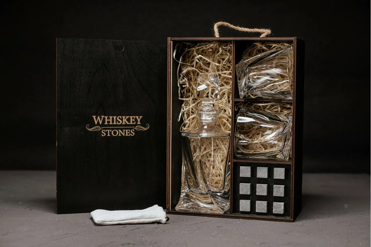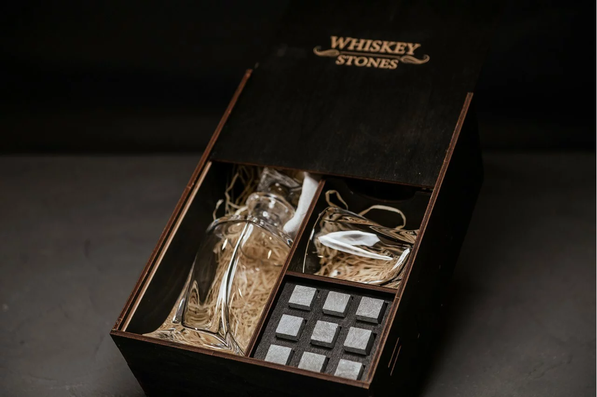 — Індивідуальне гравіювання: без гравіювання / на каменях / на кришці коробки / на каменях і кришці / на каменях, кришці та склянках / на каменях, кришці, склянках і декантері / на каменях, кришці, склянках, декантері та підставка