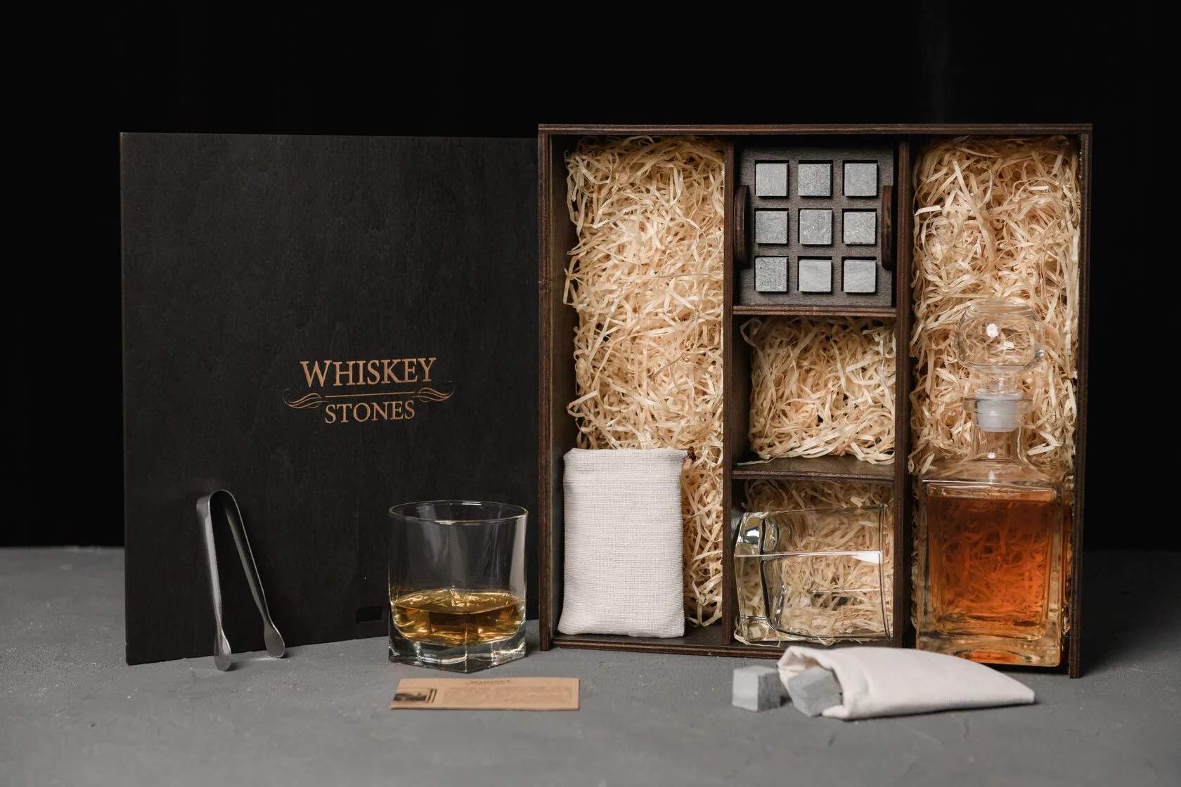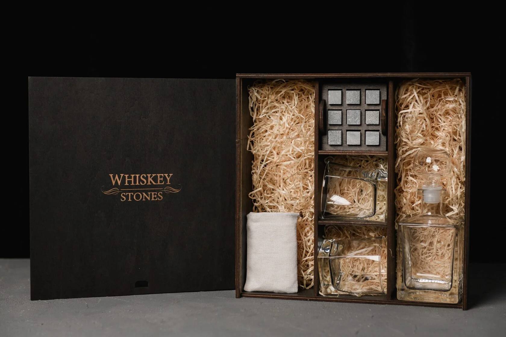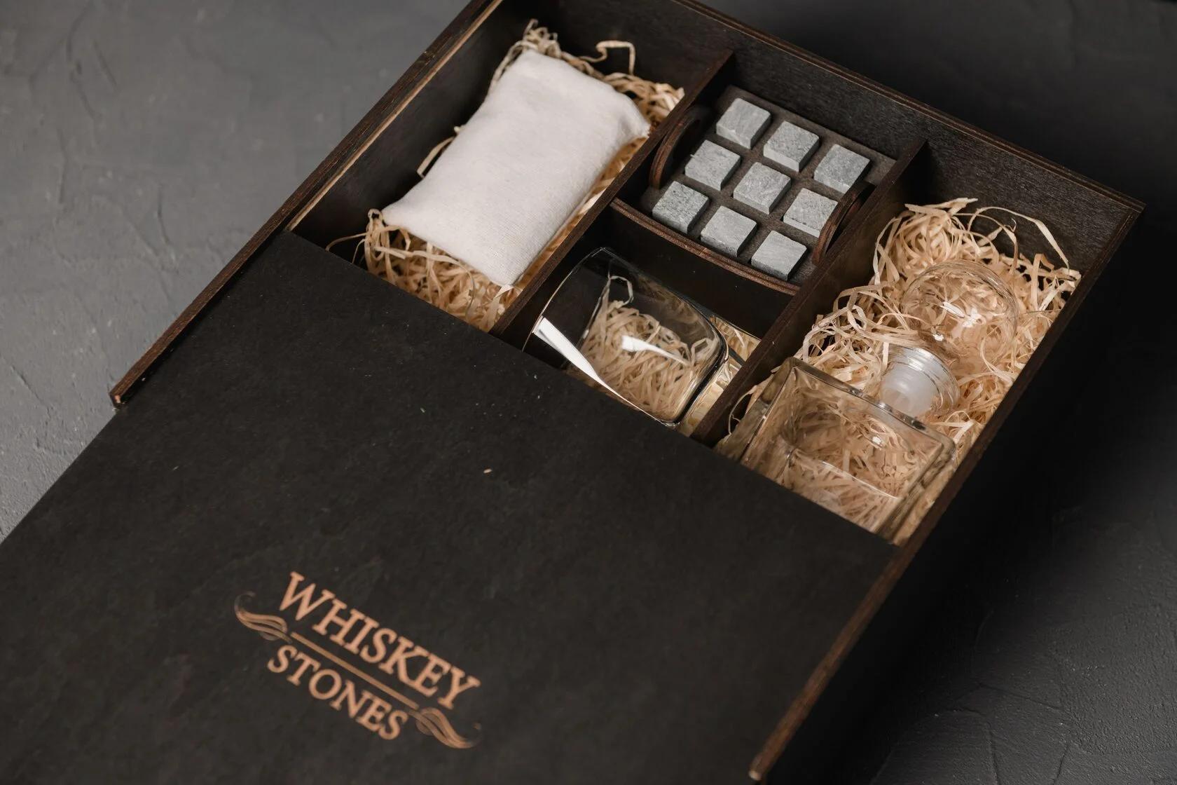 — Індивідуальне гравіювання: без гравіювання / на каменях / на кришці коробки / на каменях і кришці / на каменях, кришці та склянках / на каменях, кришці, склянках і декантері / на каменях, кришці, склянках, декантері та підставках