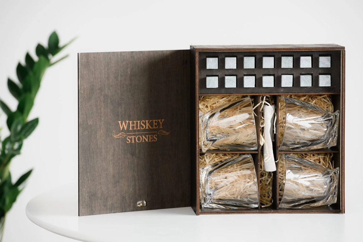 — Індивідуальне гравіювання: без гравіювання / на каменях / на кришці коробки / на каменях і кришці / на каменях, кришці та склянках / на каменях, кришці, склянках і підставках