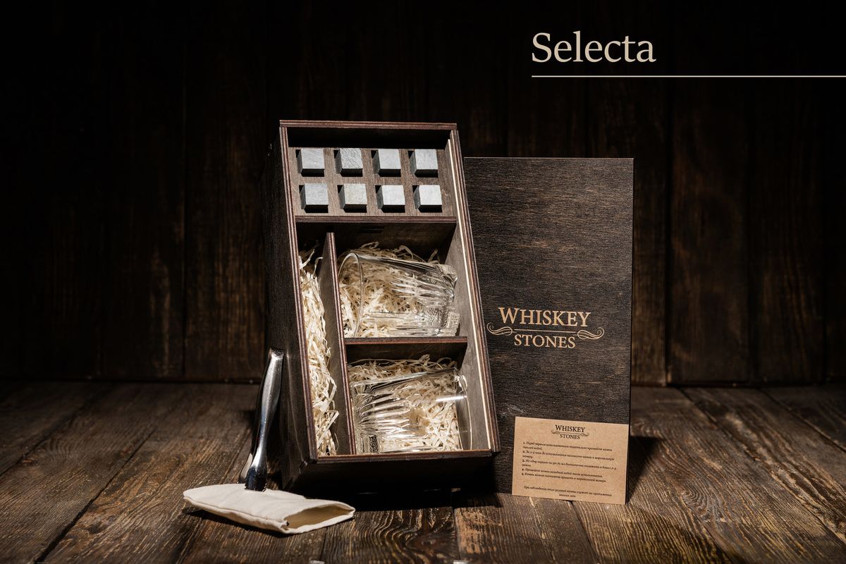 Камені для віскі оригінал зі стеатиту, подарунковий набір у дерев'яному пеналі, 8 каменів + 2 келихи + щипці