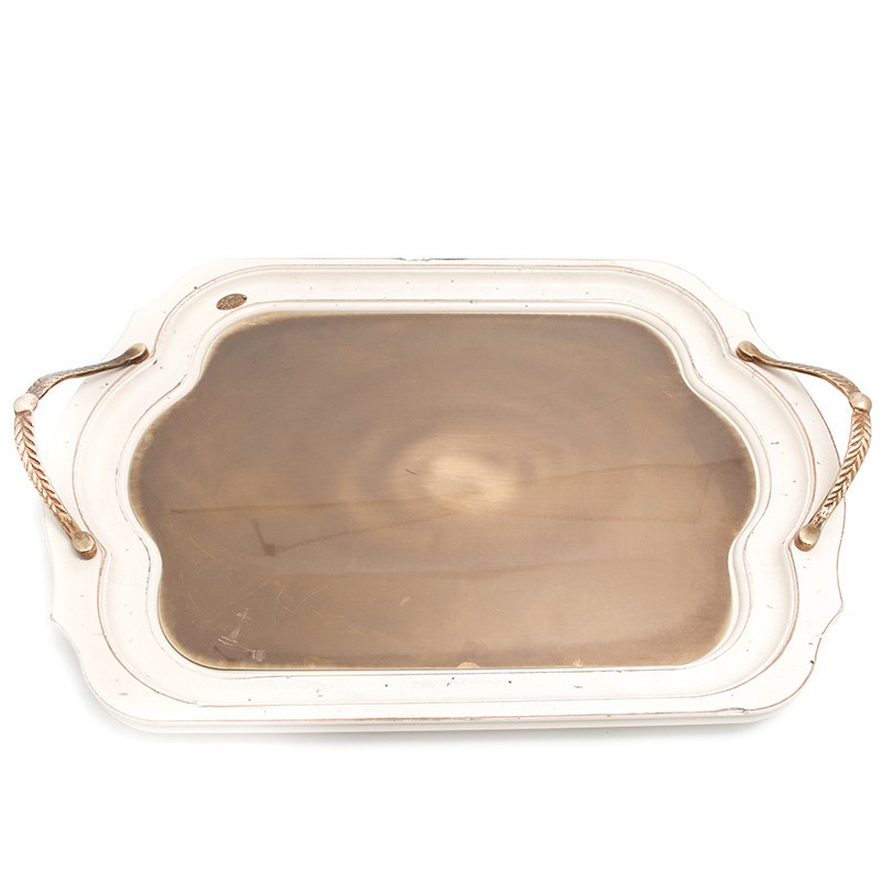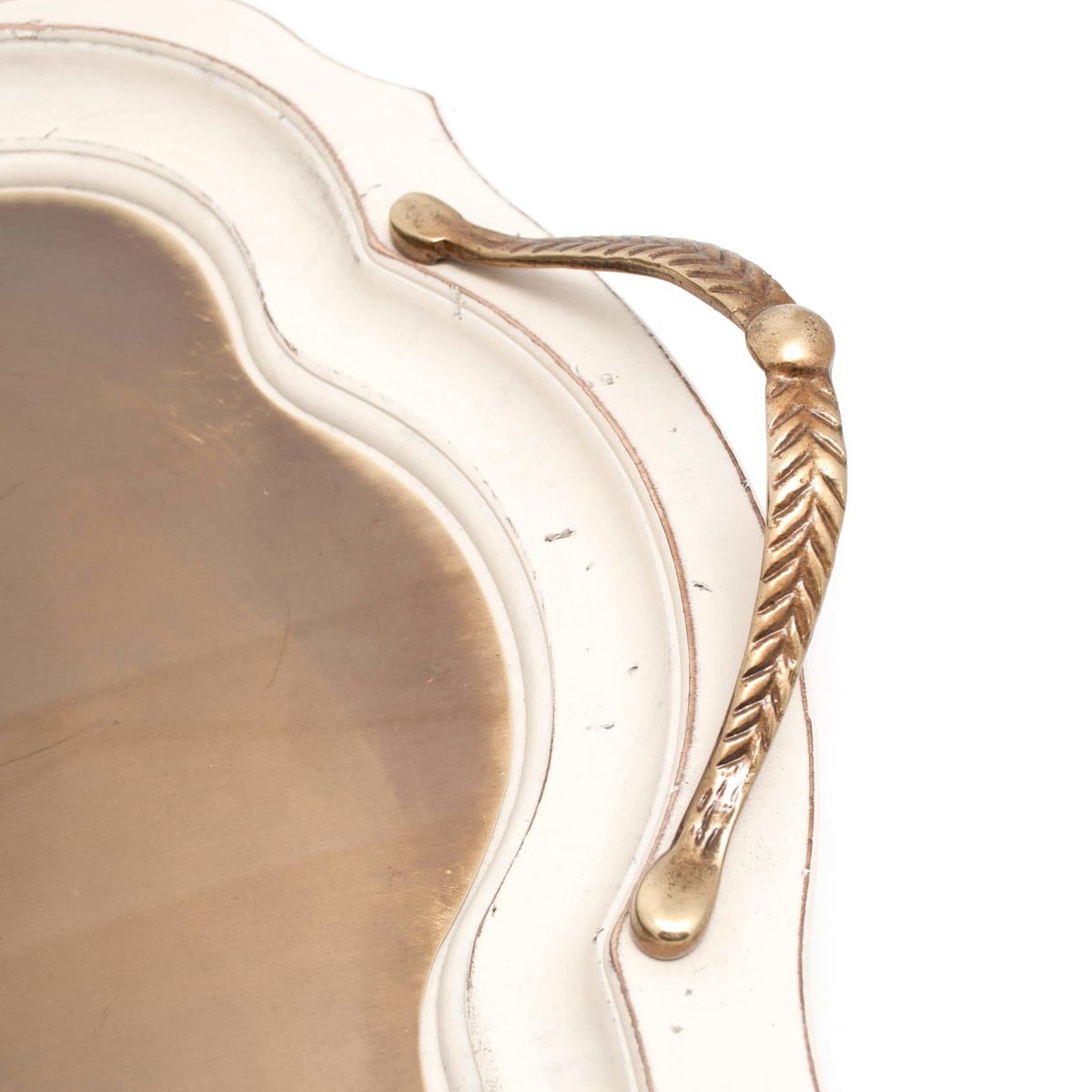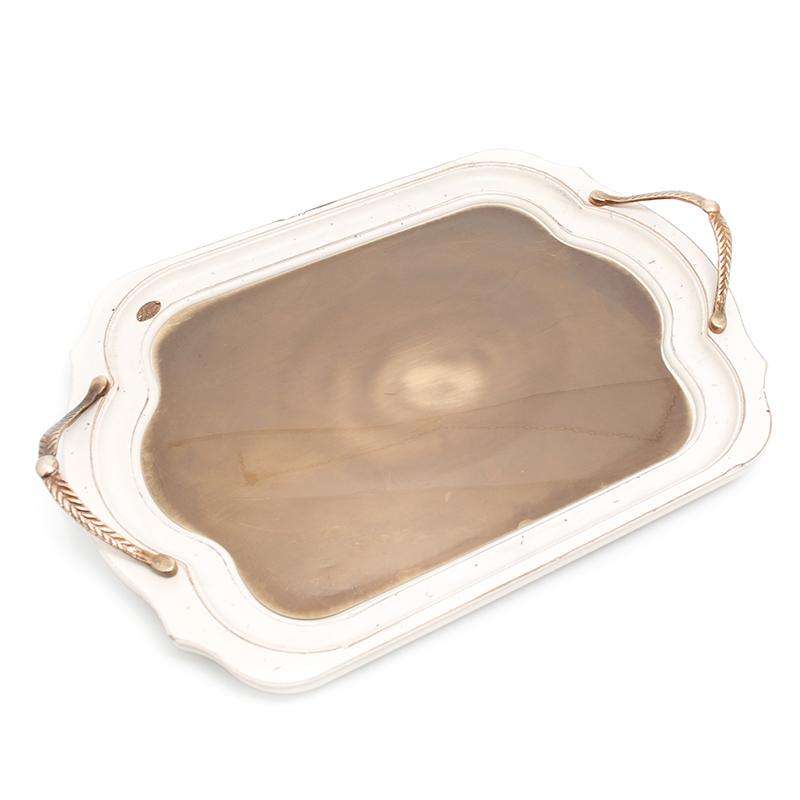 Піднос виконаний з антикварного дерева в стилі Прованс, незвичайний формою його краю прикрашає біла зістарена емаль. Дно укріплене тонким листом із латуні. Для зручності у використанні з боків є дві фігурні ручки із золотистого металу.