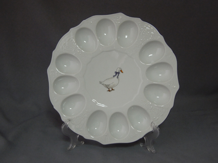 Это фарфоровое блюдо — настоящая находка для сервировки праздничного стола. Его округлая форма, плавные волны краёв и индивидуальные выемки под яйца создают аккуратную и выразительную композицию. В центре — гусь из любимой коллекции, который сразу вызывает ощущение уюта, семьи и душевного застолья.