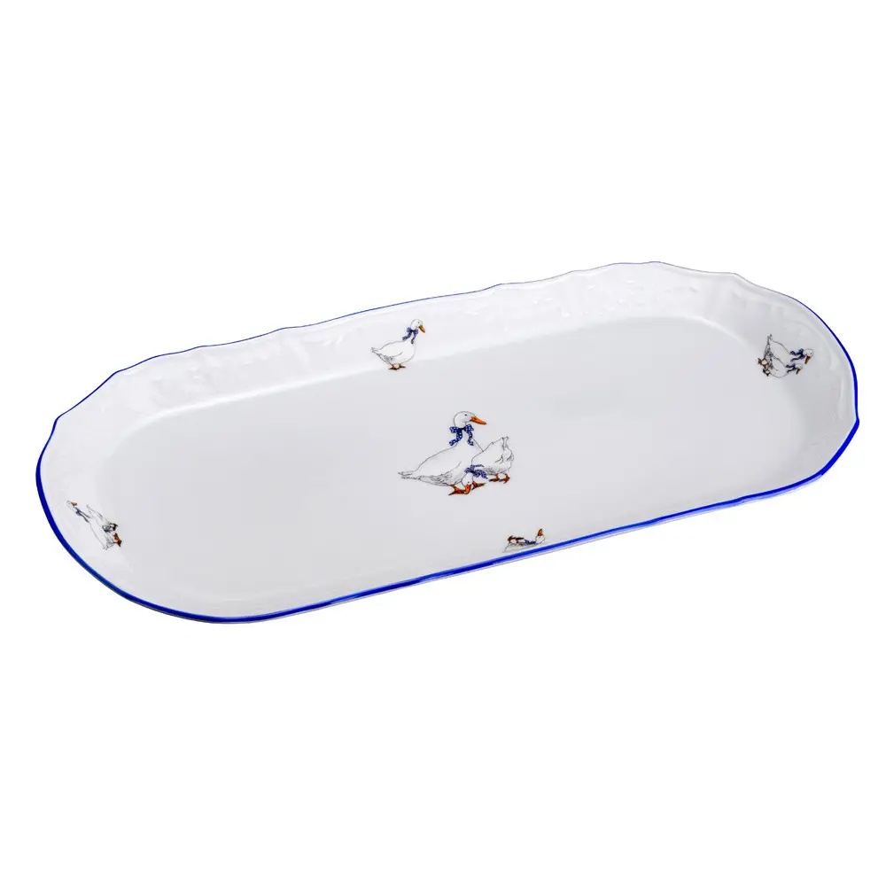 Поднос фарфоровый белый прямоугольный с рисунком Bernadotte Гуси 37 см с синей обводкой