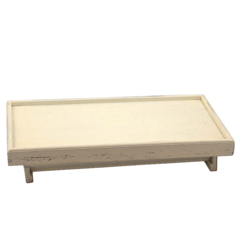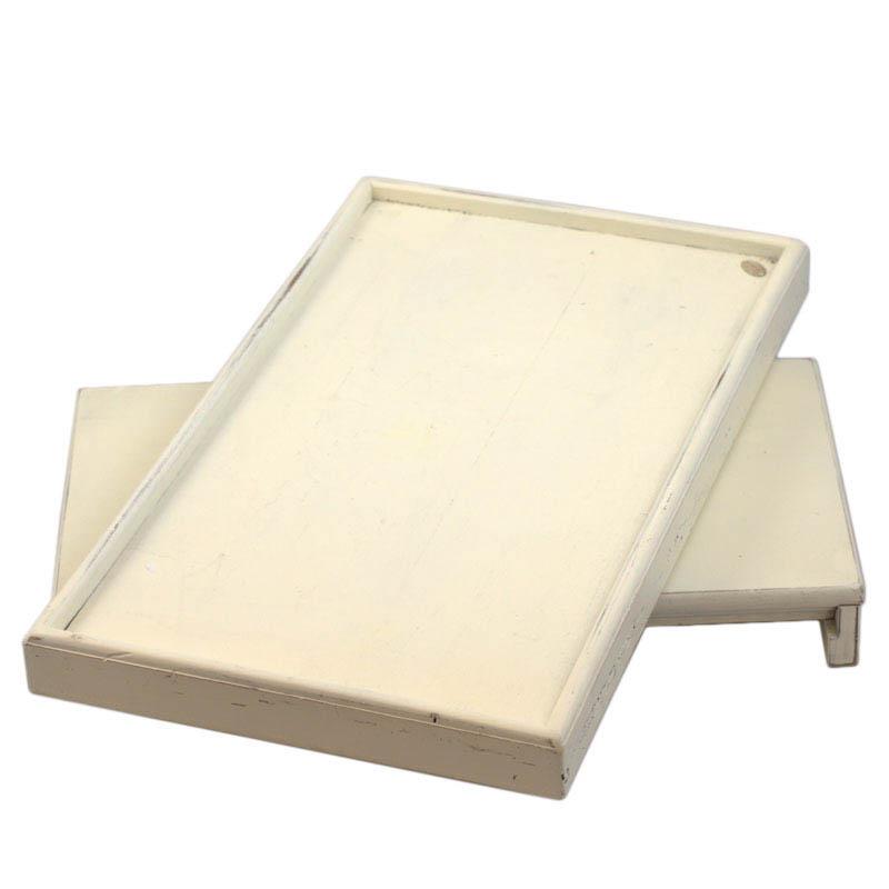 Цей місткий піднос, що обертається, складається з двох частин — верхню можна повертати в різні боки. Він оформлений в матовому молочному кольорі і прикрашений легкими штучними потертостями, що роблять піднос схожим на старовину. До низу виробу прикріплено дві зручні ніжки.