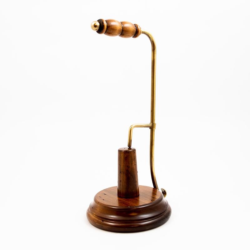 Эта подставка имеет круглое массивное основание с фирменным логотипом, которое не даст конструкции даже пошатнуться. Изделие выполнено в ореховых и бронзовых цветах и оснащено волнистой отполированной ручкой для удобной переноски с места на место.