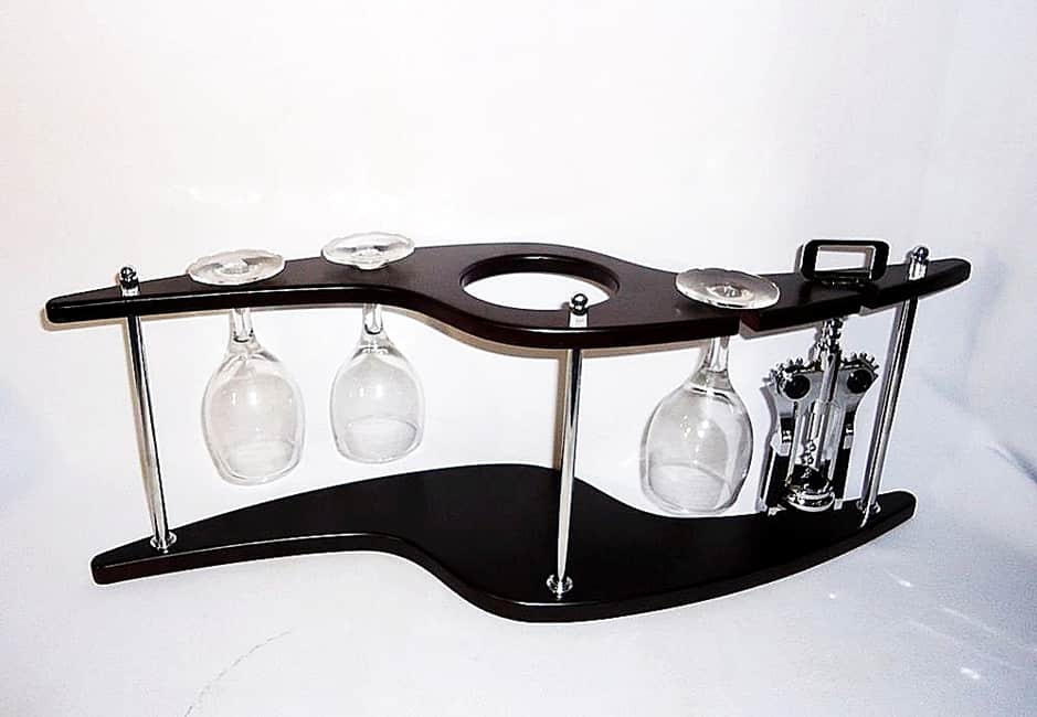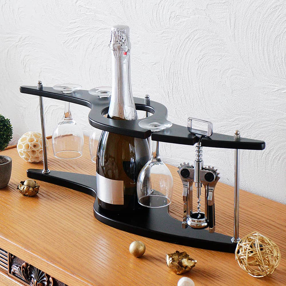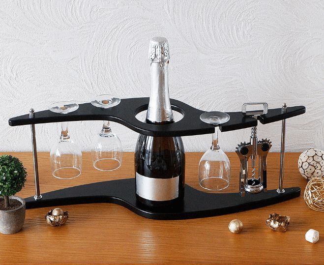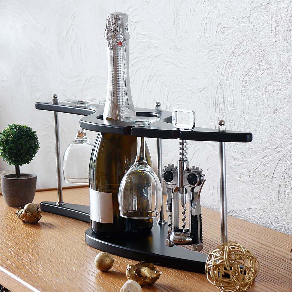 Подставка для бутылки на 3 бокала со штопором деревянная Зиг-Заг