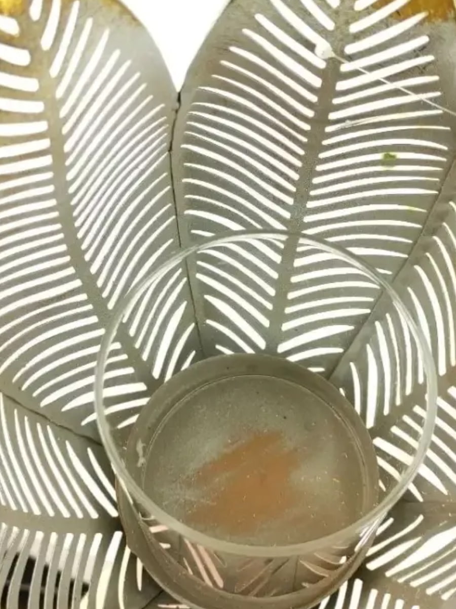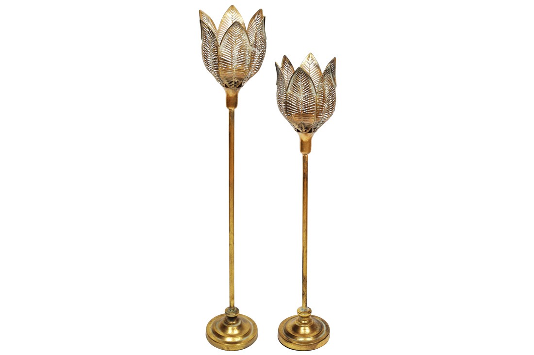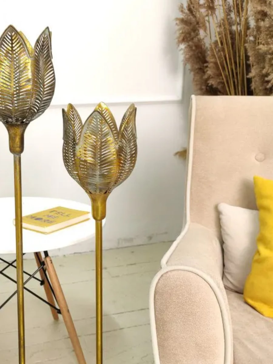 Верхня частина свічника представлена круглим плафоном з металу і є чимось схожим на квіточку.Усередині скляна колба.Нижня частина свічника представлена тонкою ніжкою на основі.Залежно від обраного освітлення, цей свічник може надати Вашому інтер'єру затишну або розкішну атмосферу. Він виконаний з металу і має вінтажний золотистий колір під старовину.