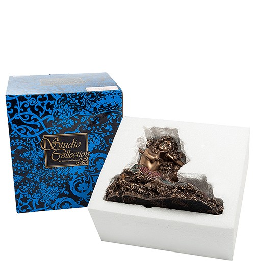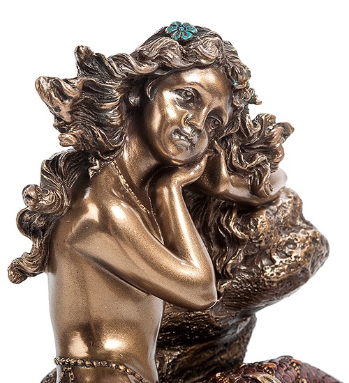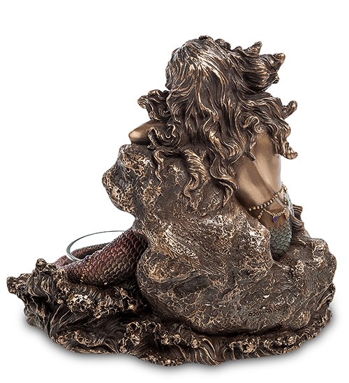 Подсвечник-композиция сделан из полистоуна, и покрашена в темный цвет с медным оттенком. У русалки, прикорнувшей на камне, длинные вьющиеся волосы, красивое лицо и устремленный вдаль взгляд. Она ждет любимого не первый год, грустит и изо всех сил пытается сохранить в душе надежду. Хвост русалки окрашен в голубой и розовый цвета... К такой красавице невозможно не вернуться!