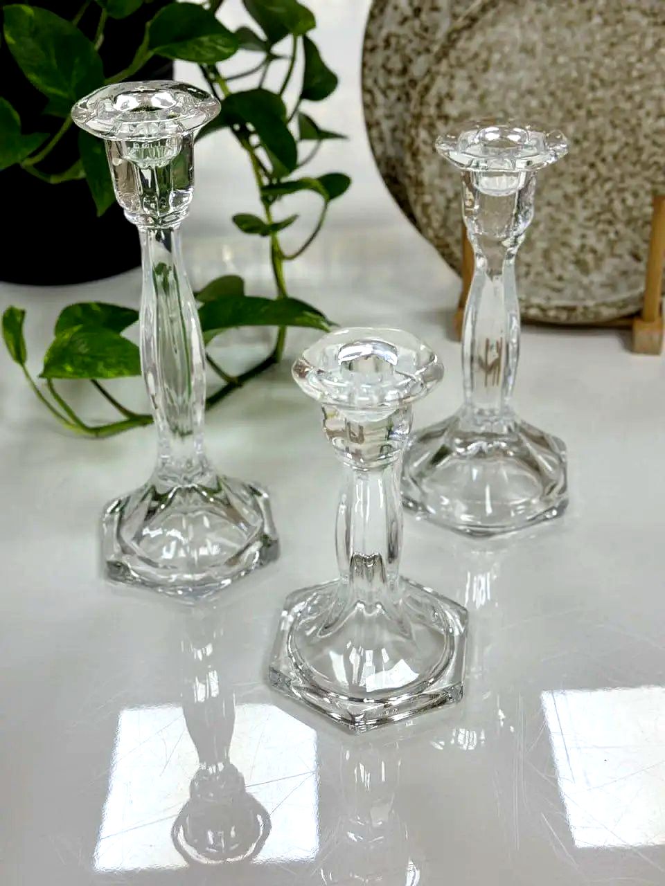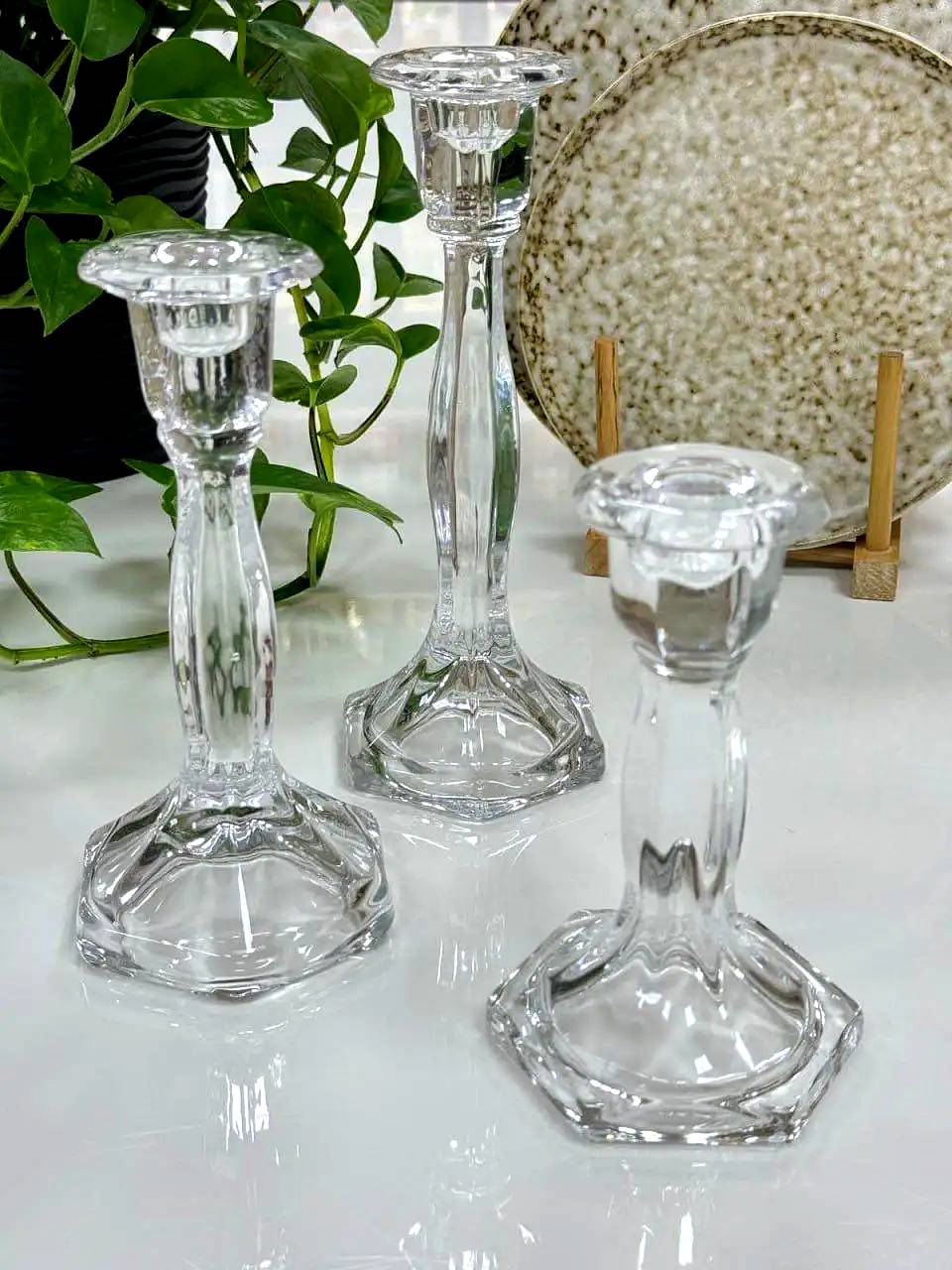 Каждый подсвечник будто несёт в себе архитектурную логику: чёткие ребра, мощное основание, вытянутый силуэт. Они не стремятся быть лёгкими — наоборот, они основательны и внушают уважение. Прозрачное стекло подчеркивает геометрию, а свет свечи играет бликами по граням, создавая атмосферу камерной торжественности.