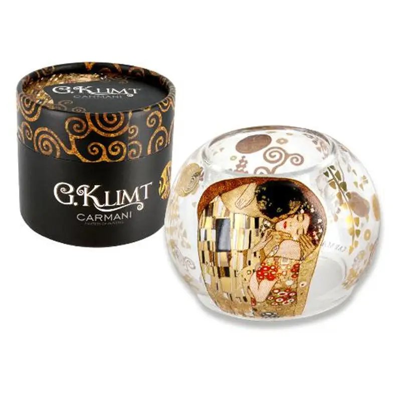 На фото изображён стеклянный подсвечник Carmani, оформленный по мотивам картины Густава Климта «Поцелуй». Изделие выполнено в округлой форме из прозрачного стекла, через которое хорошо просматривается декоративный сюжет с узнаваемыми золотыми орнаментами и фрагментом знаменитого изображения. Поверхность подсвечника украшена витиеватыми узорами и элементами в характерной для Климта цветовой гамме — золотых, тёплых и контрастных оттенках. В верхней части предусмотрено углубление для свечи, что подчёркивает его функциональное назначение.