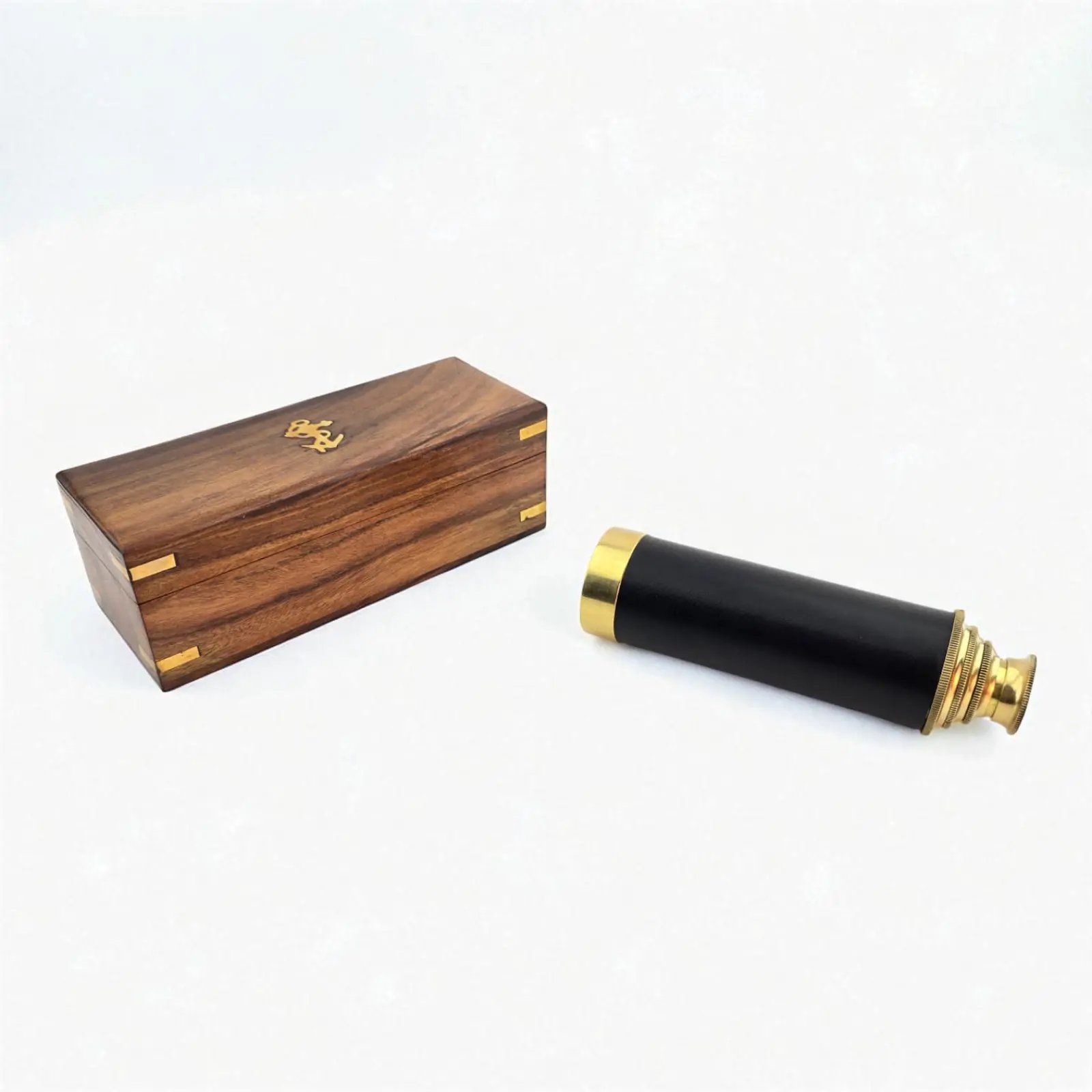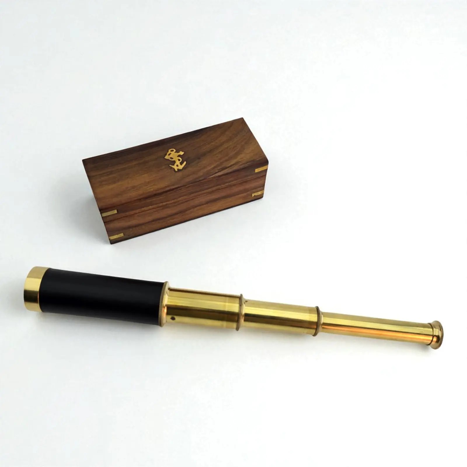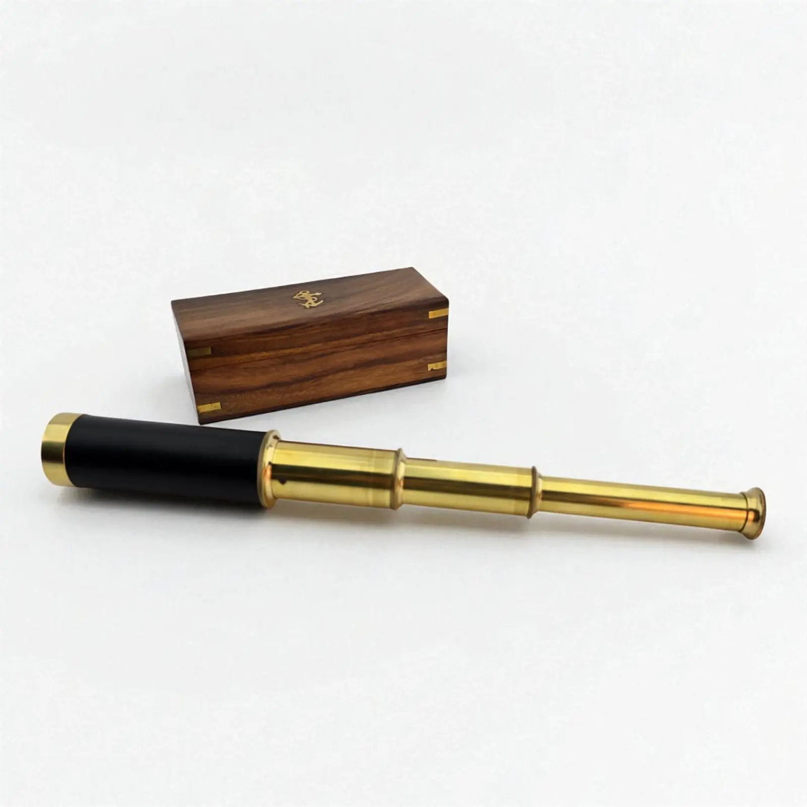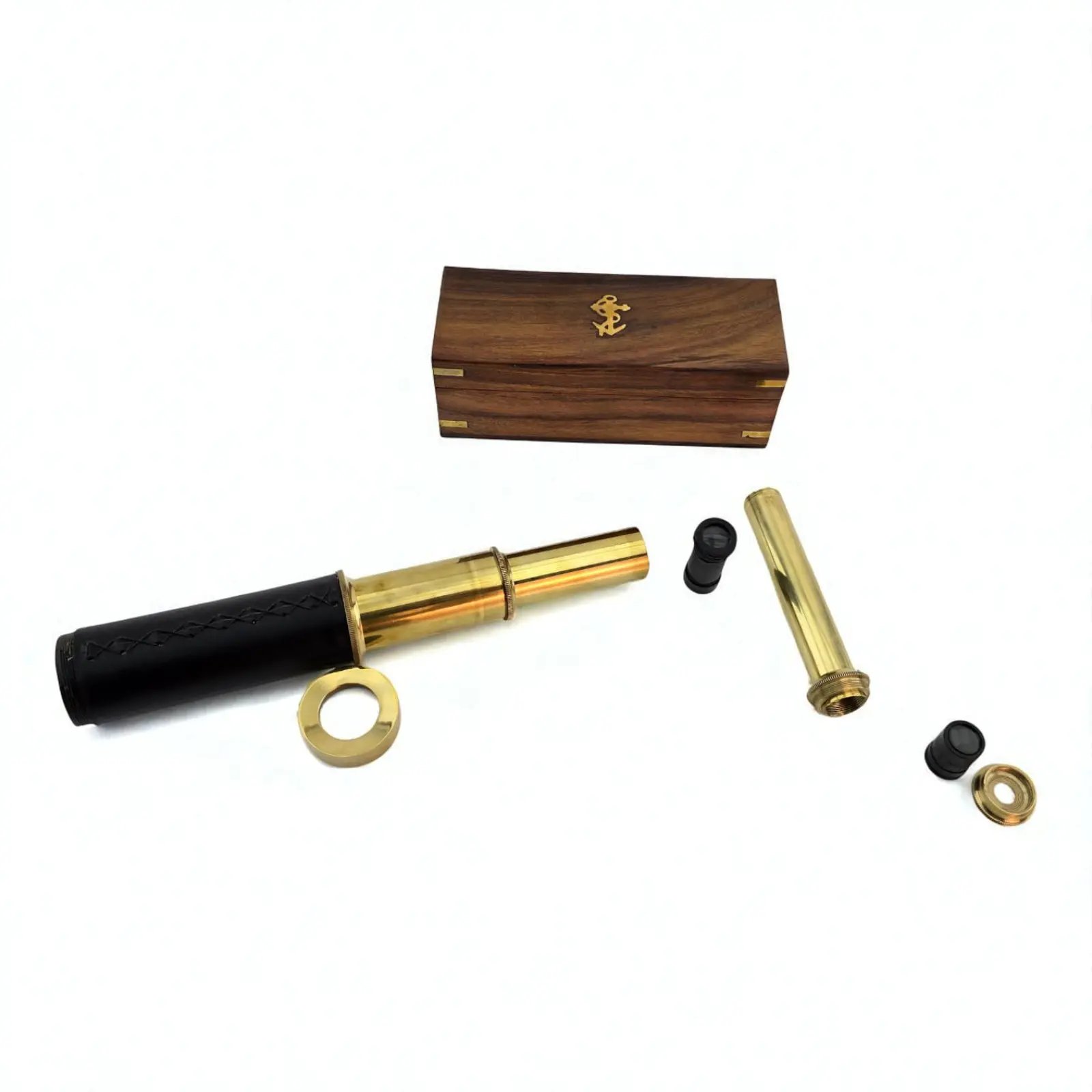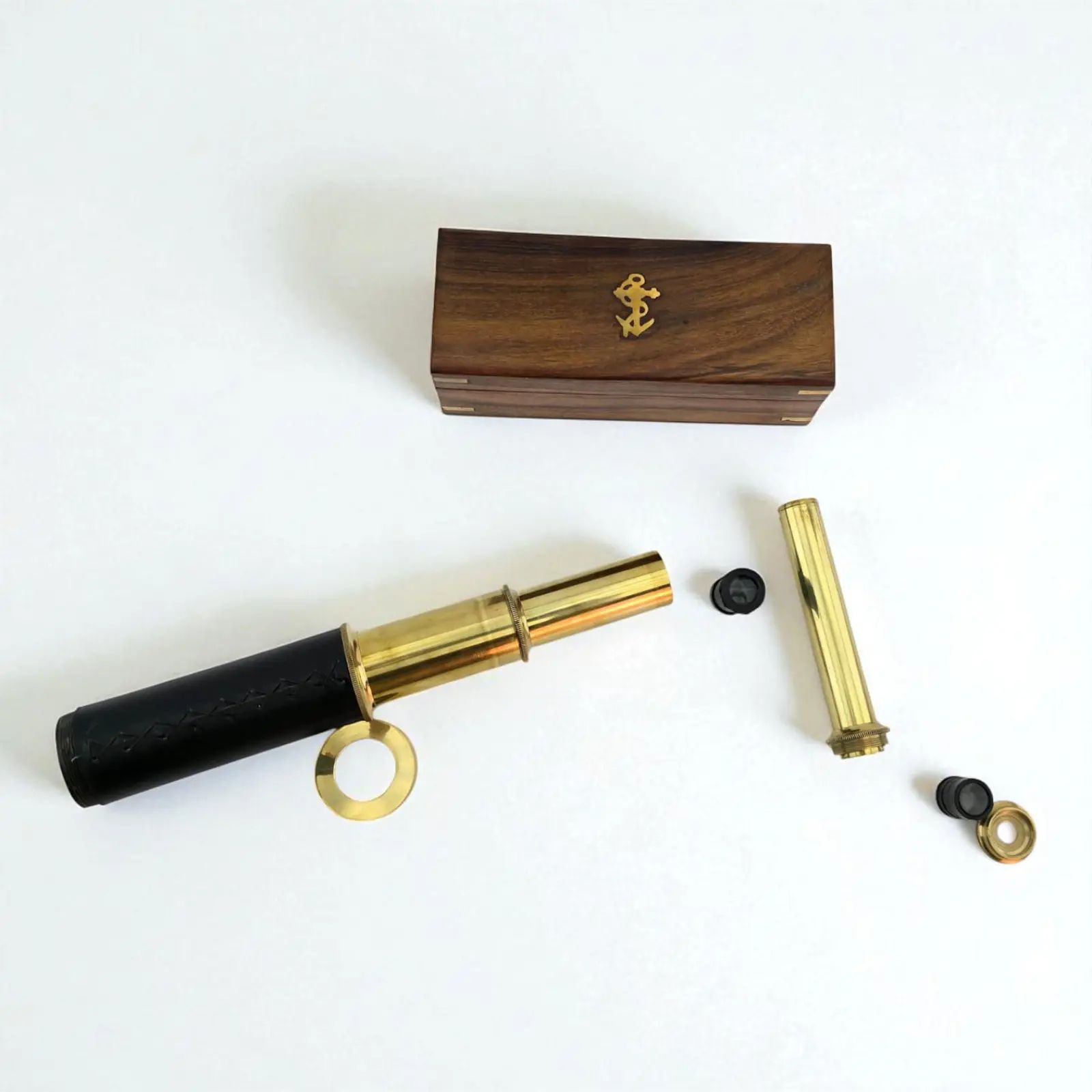 Откройте для себя атмосферу дальних путешествий с этой элегантной подзорной трубой. Телескопическая конструкция из металла с благородным тёмным покрытием и золотистыми элементами обеспечивает удобное наблюдение за удалёнными объектами. В комплекте предусмотрен стильный деревянный футляр, который защищает изделие при хранении и транспортировке.
