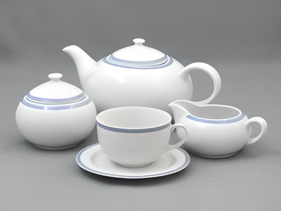 Для поціновувачів стриманої класики — чайний сервіз Thun OPAL на 6 персон (17 предметів). Білосніжний фарфор з витонченим синім кантом надає сервіруванню легкості та елегантності, чудово підходячи як для щоденного чаювання, так і для прийому гостей.