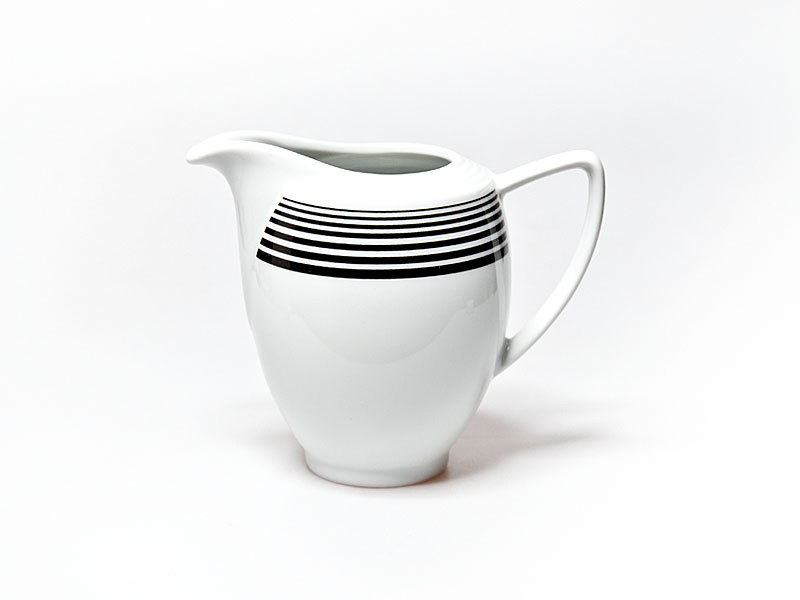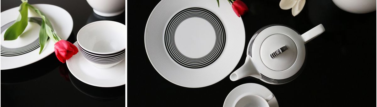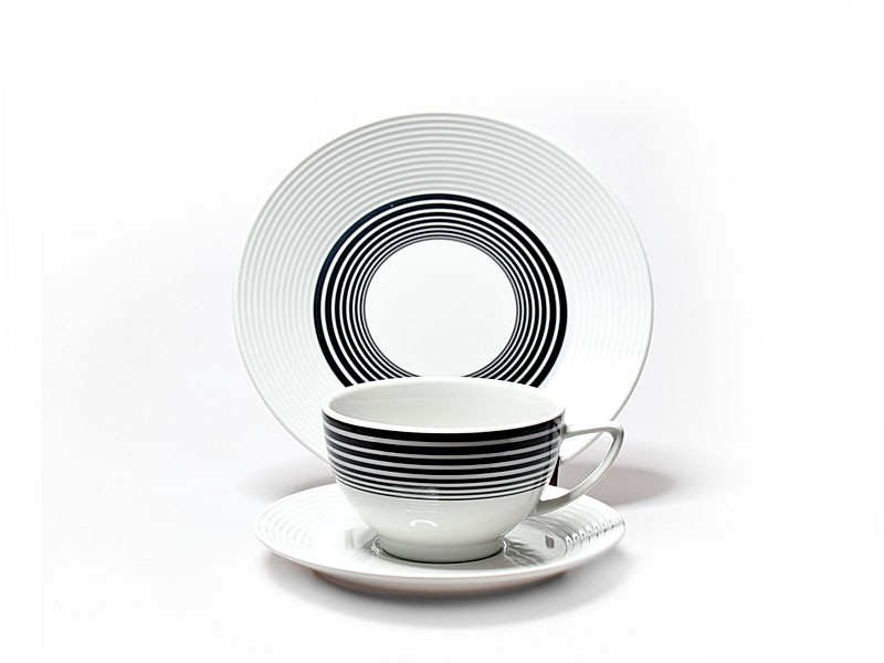 Високоякісна тверда порцеляна білого кольору з рифленими краями і чорними смугами. Міцна структура та стійкість до сколів дозволяє користуватися цим посудом щодня.