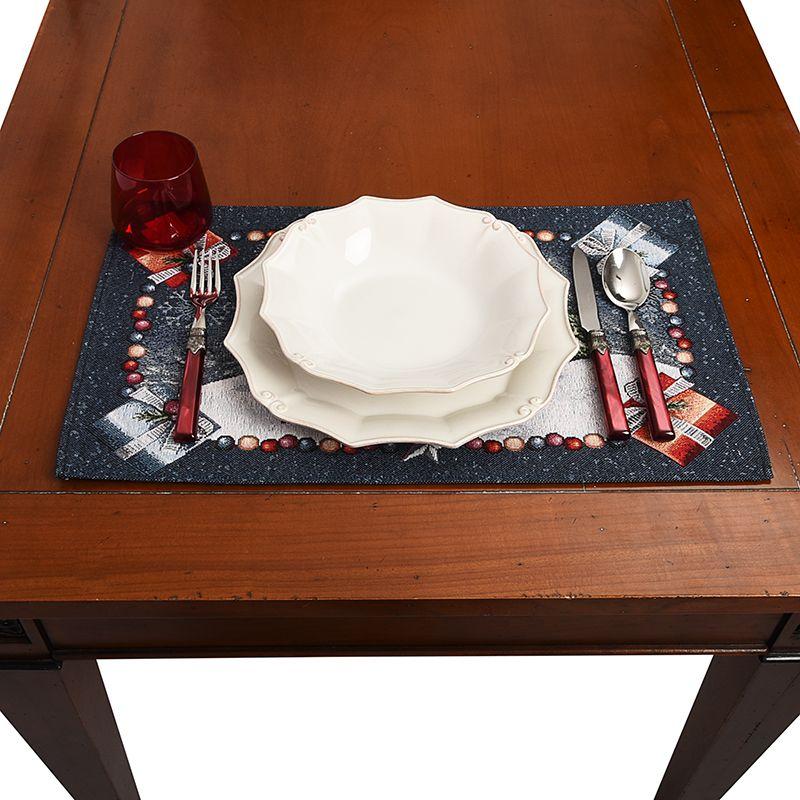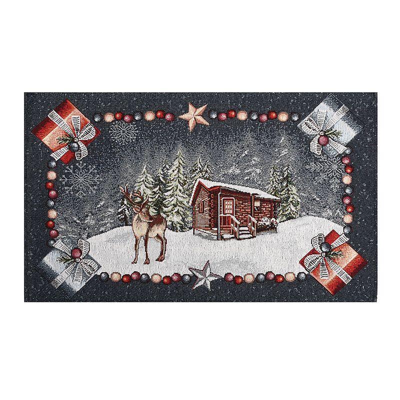 Барвиста святкова серветка із великої колекції столового гобелену «Казкова ніч» стане прикрасою інтер'єру та частиною стильного сервірування. Темне тло новорічної ночі, яскраві казкові картинки та переливи золотистого люрексу створять святкову атмосферу. Практична особливість: Текстиль, оброблений тефлоновим розчином, залишиться сухим і чистим, навіть якщо ви розіллєте на нього вино або каву. Відмінний подарунок друзям та колегам на Новий рік!