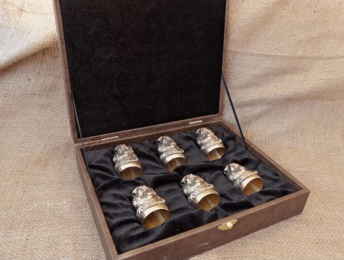 Комплект из 6-и рюмок в форме козака , выполненных методом художественного литья из бронзы. Стаканчик из нержавеющей стали емкостью 30 мл. Все рюмки ставятся на голову. Общая высота чарки 75мм, ширина 45мм. Комплект поставляется в кейсе.