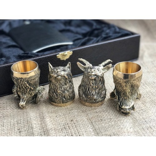 1. Чарка "Охотничья" 30 мл: высота 70 мм, ширина 40мм, художественное литье из бронзы, внутри покрытие булатом - 7 видов голов (кабан, филин, бык, баран, рысь, медведь, лось) на выбор - 4шт. Все чарки ставятся на голову!