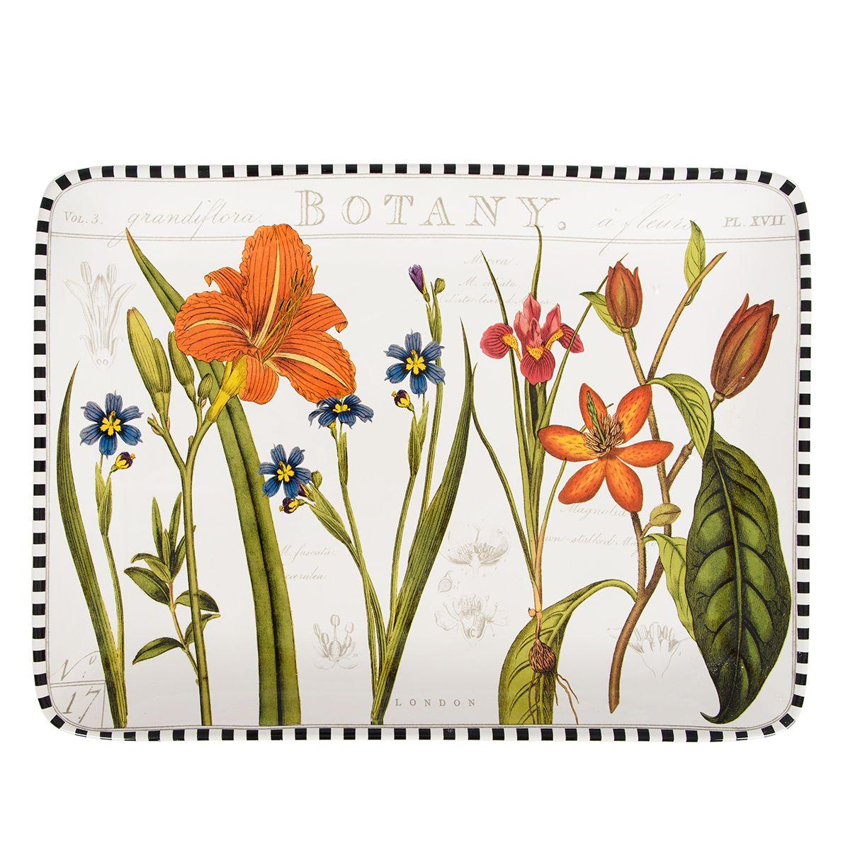 Прямоугольное блюдо молочно-белого оттенка, украшенное изображениями цветов из летнего сада, точно декоративная картина, которая с легкостью впишется в современный интерьер. Детально прорисованные ирисы, голубоглазки, лилии и магнолии в элегантной черно-белой рамке смотрятся так, будто перенесены на гладкую керамическую поверхность прямо из цветного справочника по ботанике. Этот эффект деликатно подчеркивают надписи и рисунки цветов, словно сделанные простым карандашом.
