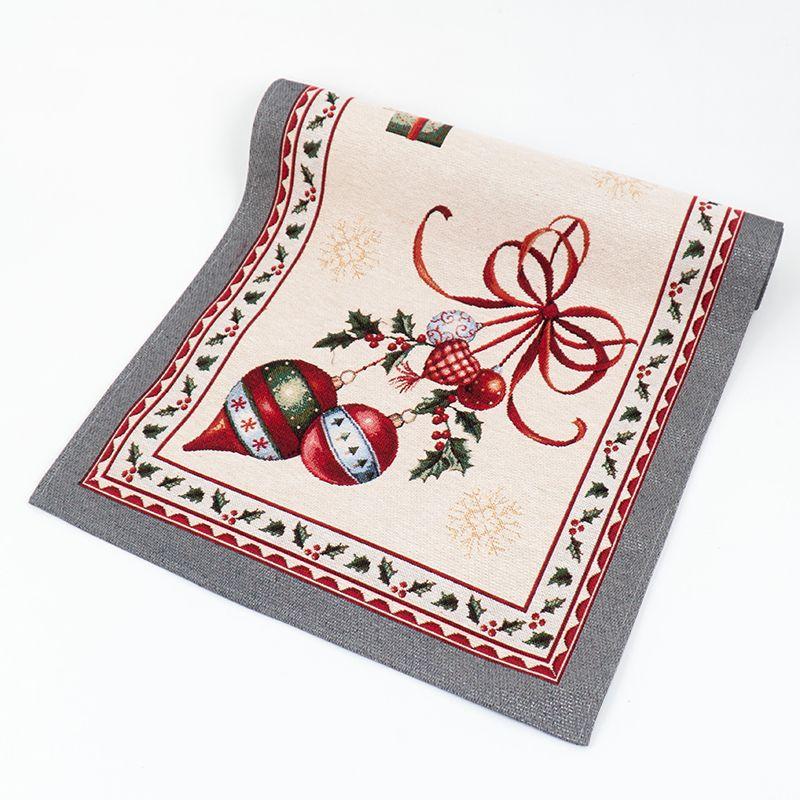 Столова доріжка зі святковим дизайном цілком може замінити велику скатертину, якщо доповнити її серветками з цієї ж колекції. Але й як самодостатній декор інтер’єру красивий текстиль стане важливим елементом новорічного оформлення. Малюнки на протилежних кінцях раннера не повторюються: з одного боку — кулька, що звисає з гілки падуба; з іншого — цілий «букет» ялинкових прикрас, перев’язаний червоною стрічкою. Практичний текстиль дуже простий у догляді та зручний у використанні. Неприємності у вигляді розлитих напоїв одразу усуваються серветкою або просто струшуються з тканини, на якій не залишається жодного сліду.