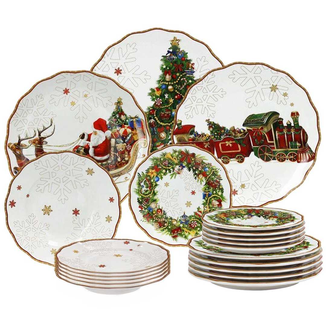 Різдвяний фарфоровий сервіз Brandani на 6 персон — це втілення святкового затишку та італійського стилю. На кожній тарілці зображені теплі зимові сюжети — Санта з подарунками, різдвяний потяг, ялинові вінки та сніжинки, що створюють атмосферу казки. Білосніжний фарфор із золотою облямівкою виглядає особливо святково та надає столу урочистості. У комплект входить 18 предметів: шість обідніх, шість супових і шість десертних тарілок, що забезпечують повну сервіровку. Посуд міцний, зручний у догляді та підходить для щоденного використання у святкові дні. Такий сервіз стане чудовим вибором для родинних вечерь і незабутнім подарунком до Різдва.