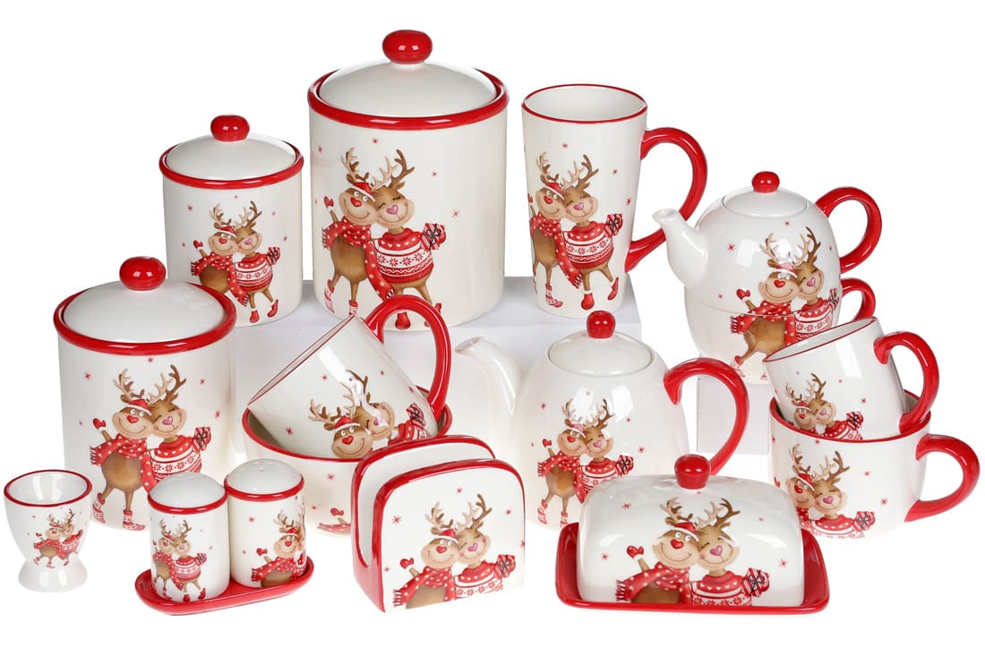 Колекція керамічного посуду з великим малюнком для створення зимової казки на Вашому столі. Біла кераміка з яскравими червоними деталями. Харизматична парочка оленів у зимовому одязі та з подарунком створить позитивну атмосферу та подарує веселий настрій усім гостям за святковим столом.