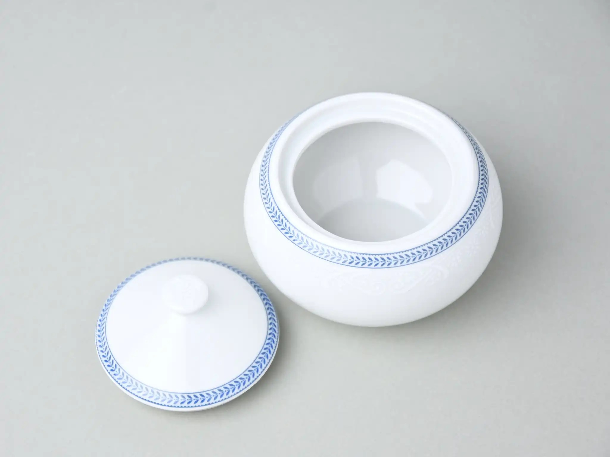 Сахарница из чешской коллекции Thun Opal «Голубые Пластинки» — это изысканное сочетание традиционного фарфора, продуманной формы и тонкого, почти невесомого декора. Белый рельефный фарфор с благородной голубой каймой выглядит празднично, но при этом сдержанно. Это не просто предмет посуды — это аксессуар, который создаёт настроение.